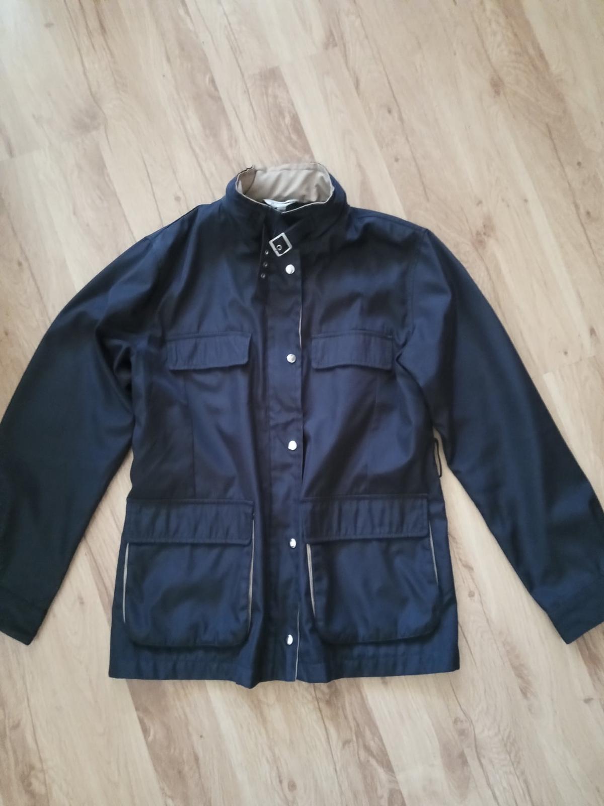 Obojstranná prešívaná vetrovka na miernu zimu alebo prechod, tmavomodrá z jednej strany a bordová z druhej strany. S vreckami. Dĺžka 64 cm, šírka 49 cm, rukáv od goliere 74 cm.