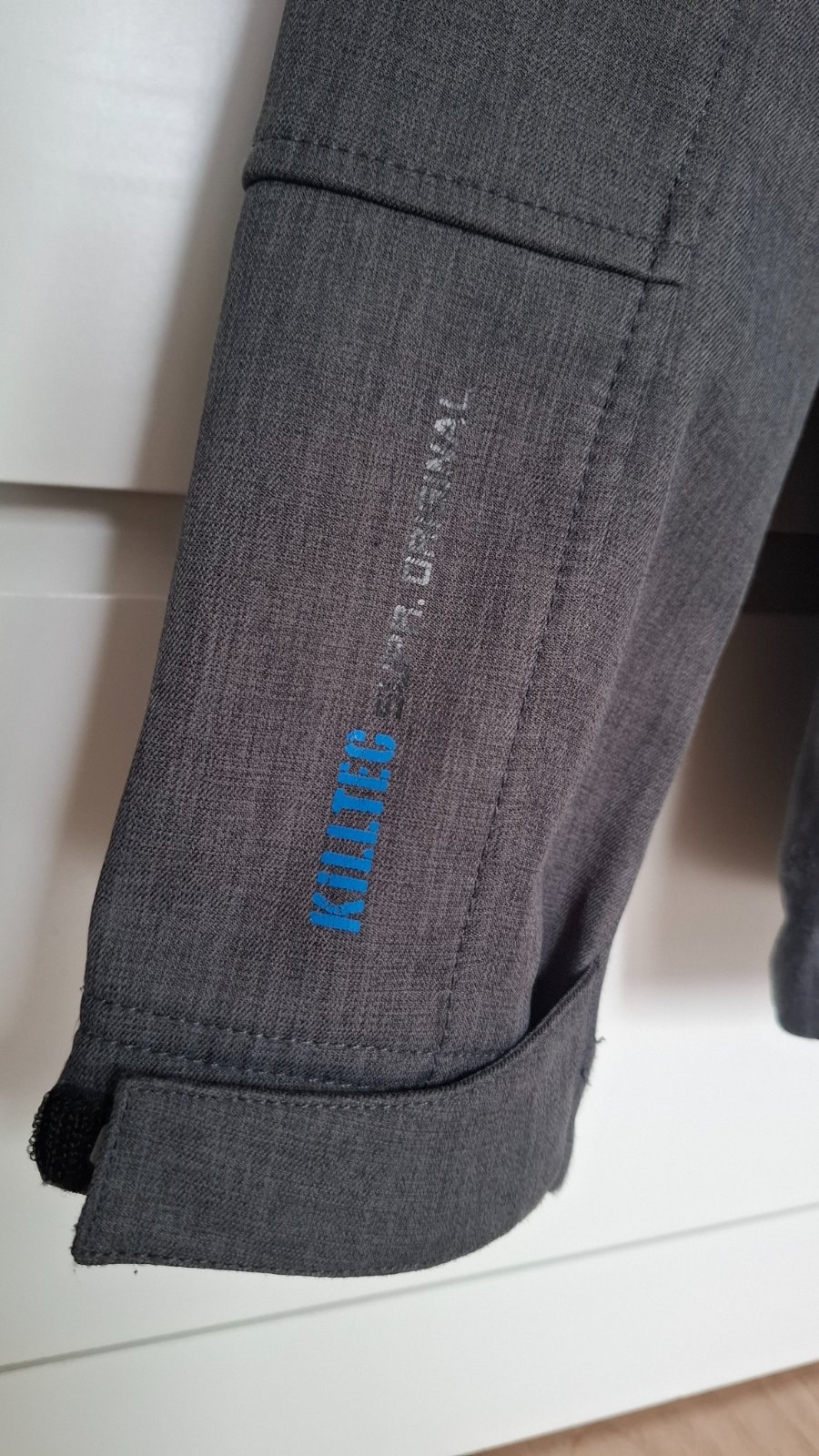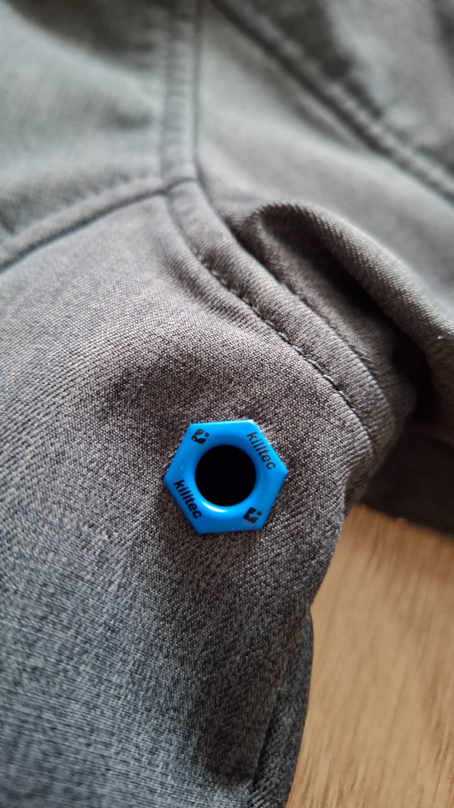 Má vrecká na zips, kapucňu, dá sa zapnúť až ku krku a dole stiahnuť nastaviteľnou gumkou s brzdami, vzadu reflexný prvok.