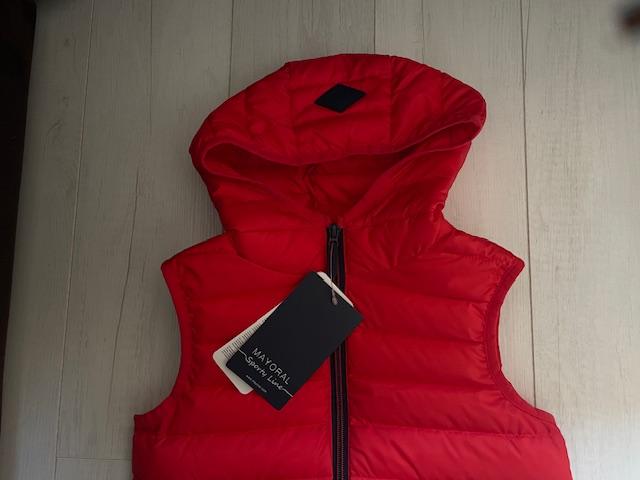 Krásna jasná červená farba. Vestička má vrecká. Kapucňa sa dá odopnút. Dlžka 40cm.