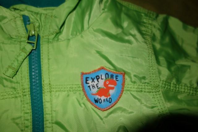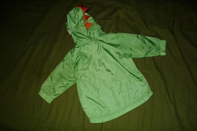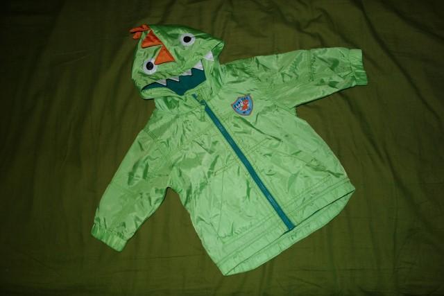 Krasna sustakova bundicka s dinosaurikom vo vybornom stave. Je tenka, len podsita flisom.