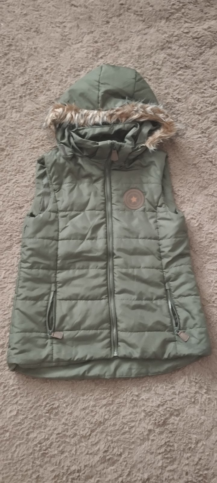 Pekná vestička v málo nosenom stave Vatovaná, s vačkami po bokoch Kapucňa ku nej chýba Dĺžka zipsu 62 cm, šírka v páse 45*2 cm