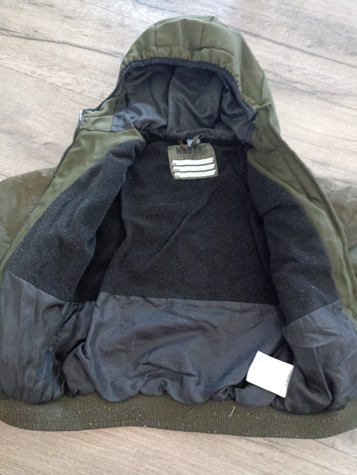 Nosená prechodná bunda, zateplená flisom ako je na foto. Nemá výrazné poškodenia okrem jedného zatiahnutia viď foto. Pri nosení nevidieť.