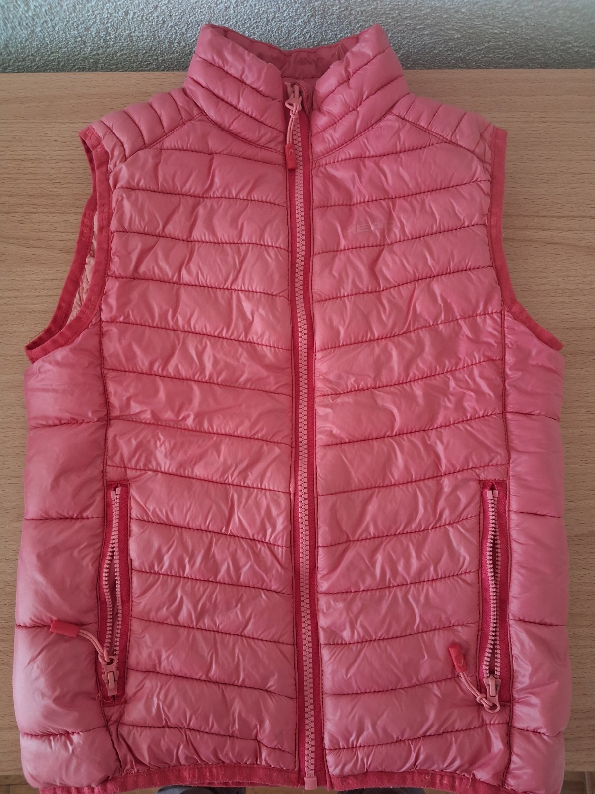 Nosena ruzova vesta, vel.128 (7-8r). Dlzka 50cm, sirka 37cm. Trocha osuchany zips a milimeter latky pod zipsom, vid foto. Inak dobry noseny stav. Vaha cca 250g