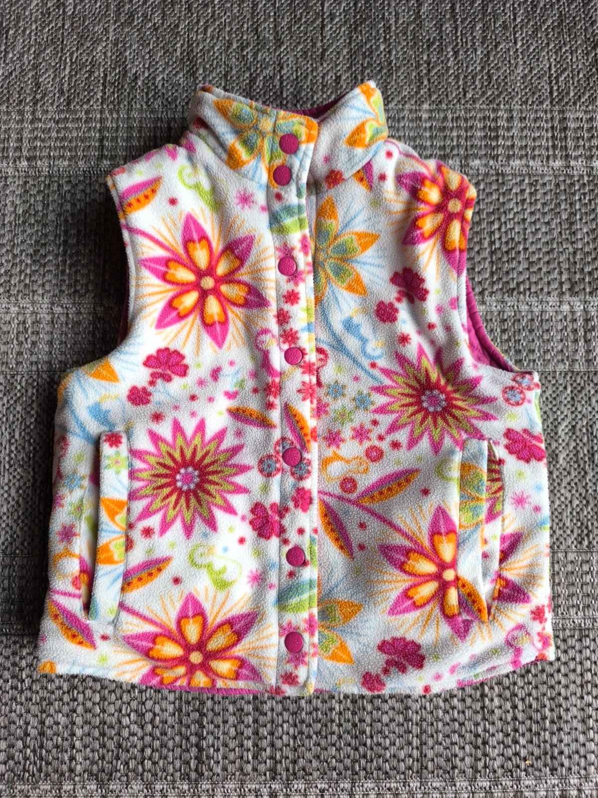 Nádherná zateplená vesta na prechodné až zimné počasie. Obojstranná, takže máte namiesto jednej hneď dve 😉 Z jednej strany je vodoodpudivá a vetruodolná látka, z druhej strany je hrejivý flís. Vesta má z obidvoch strán vrecká aj reflexné prvky. Má aj pútko na zavesenie, ideálna aj do školy. Vo výbornom stave. Veľkosť 6-7 rokov, ale kľudne aj viac, je širšia, rozmery: dĺžka 44cm, šírka 38cm.