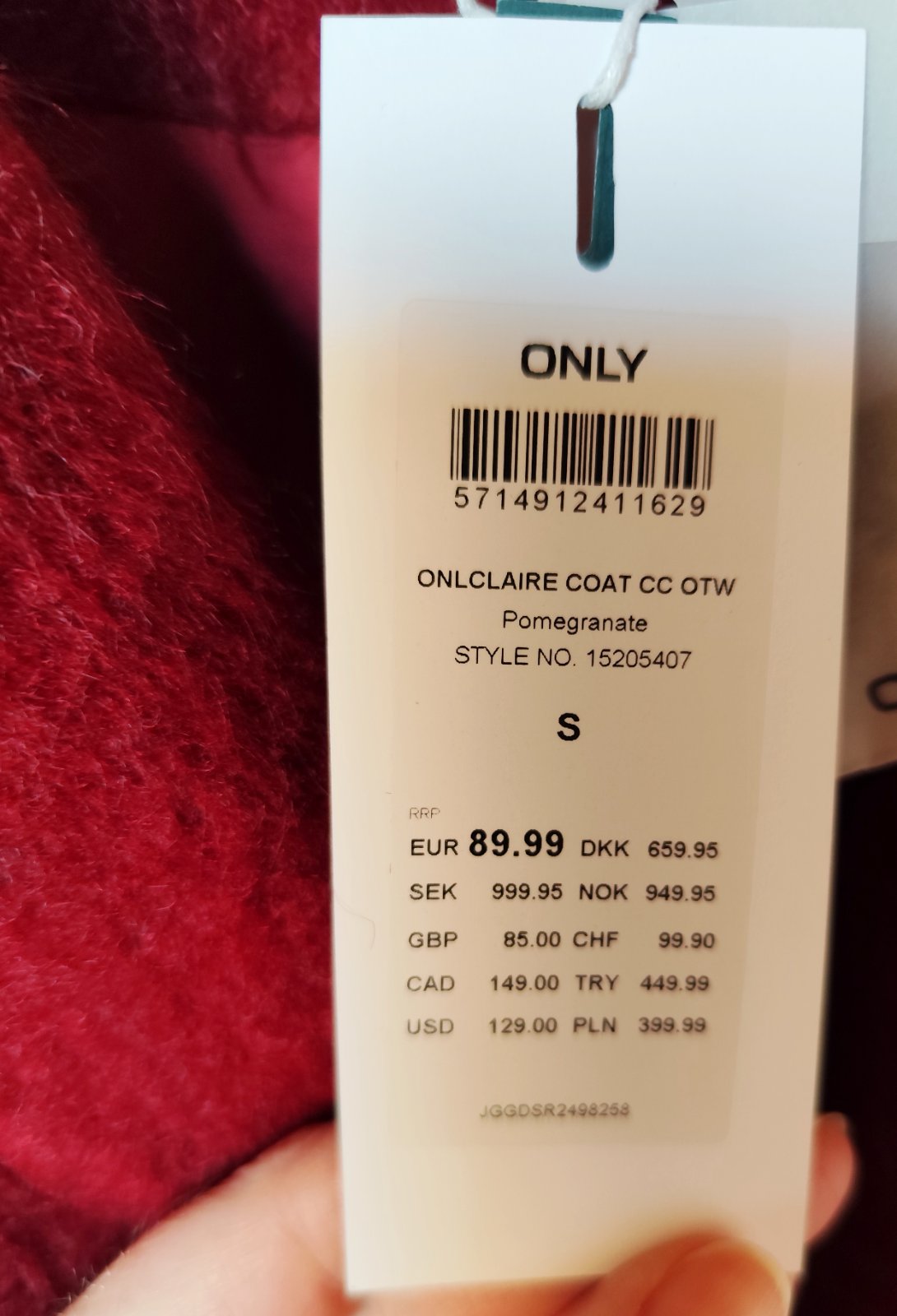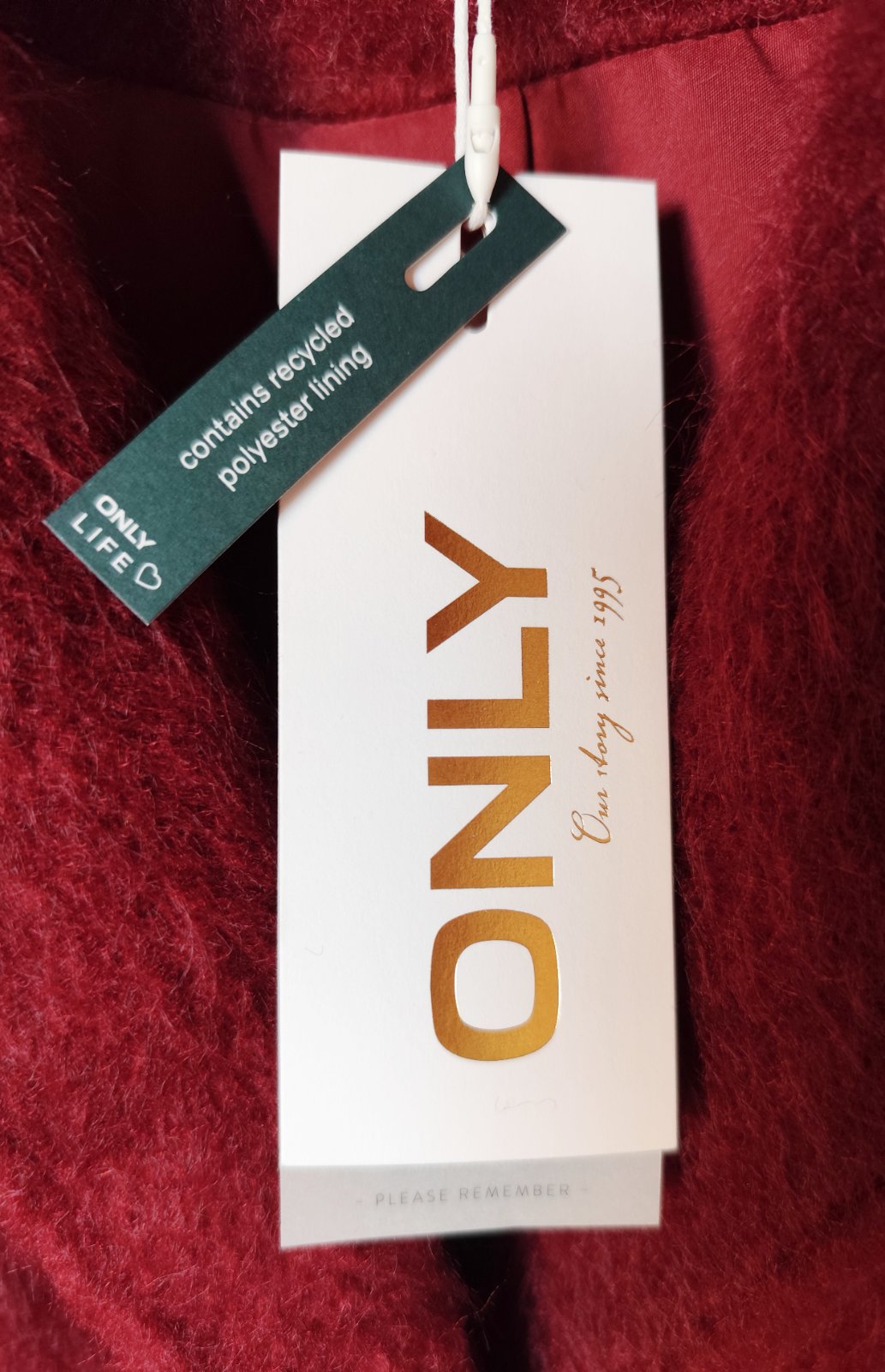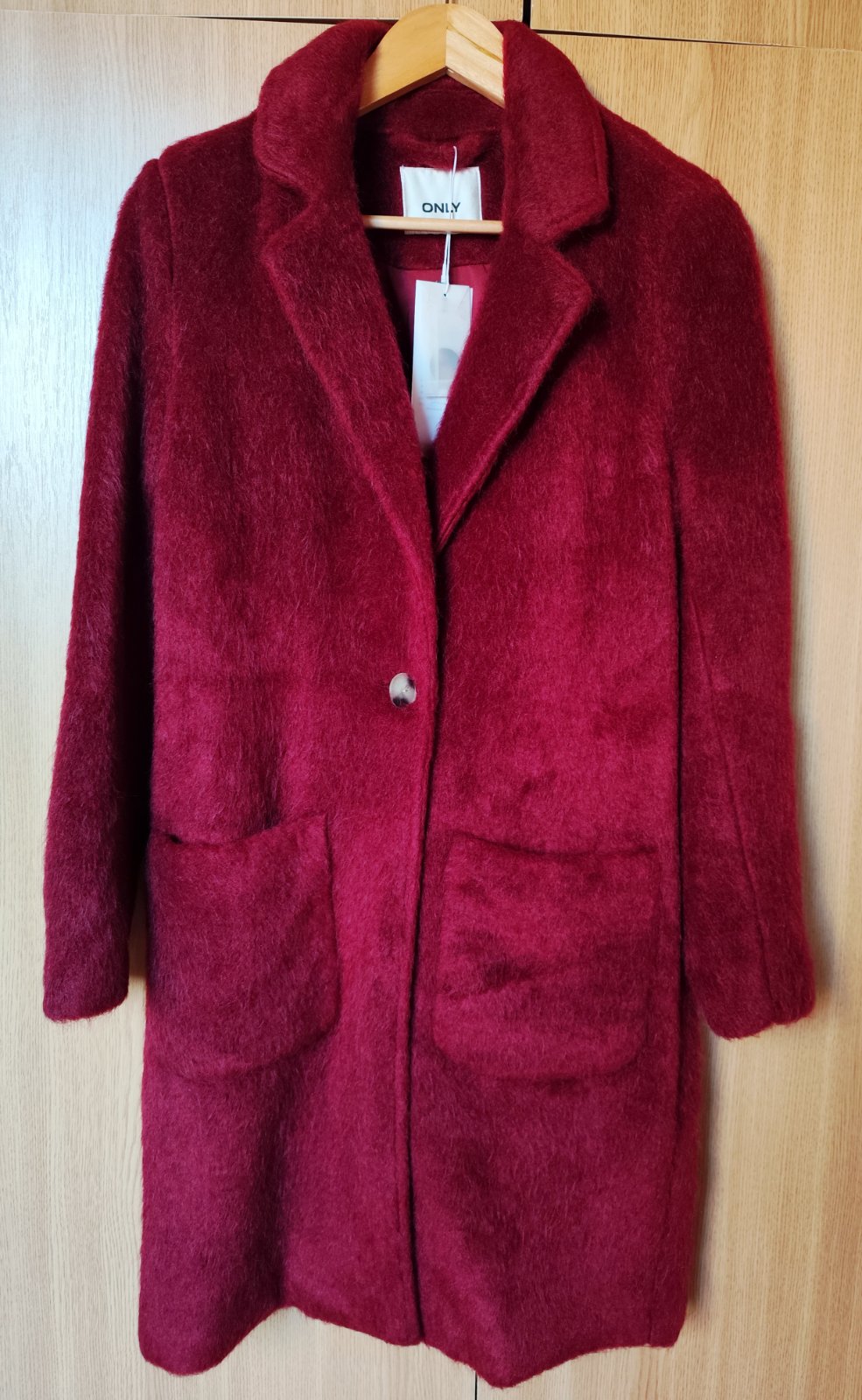 Úplne nový nenosený kabát, ešte s visačkou. Bordová resp. tmavočervená farba, zapínanie na gombík vpredu, spredu na každom boku je jedno vrecko. Pribalený je aj jeden náhradný gombík. Materiál je pravdepodobne polyester.