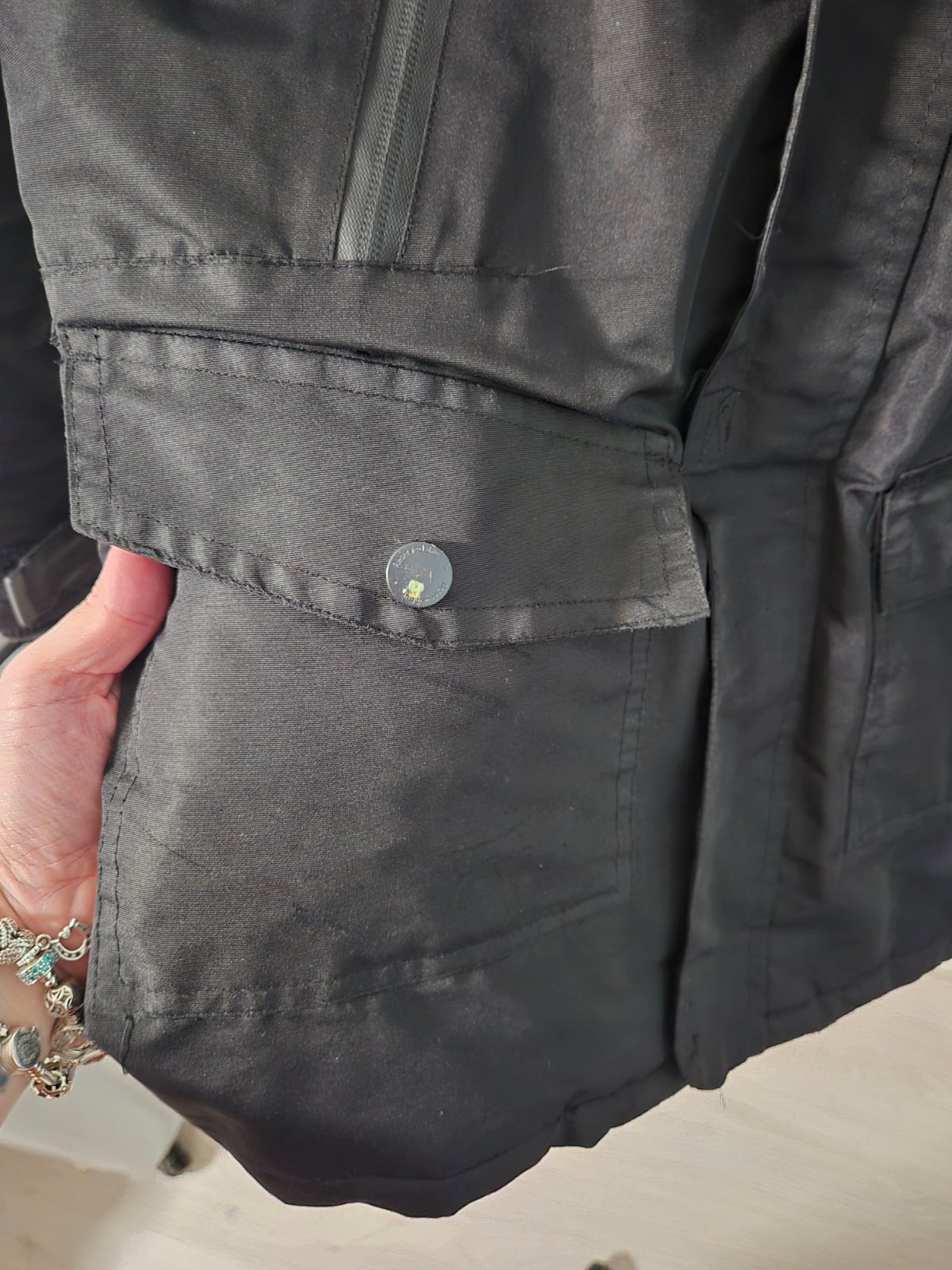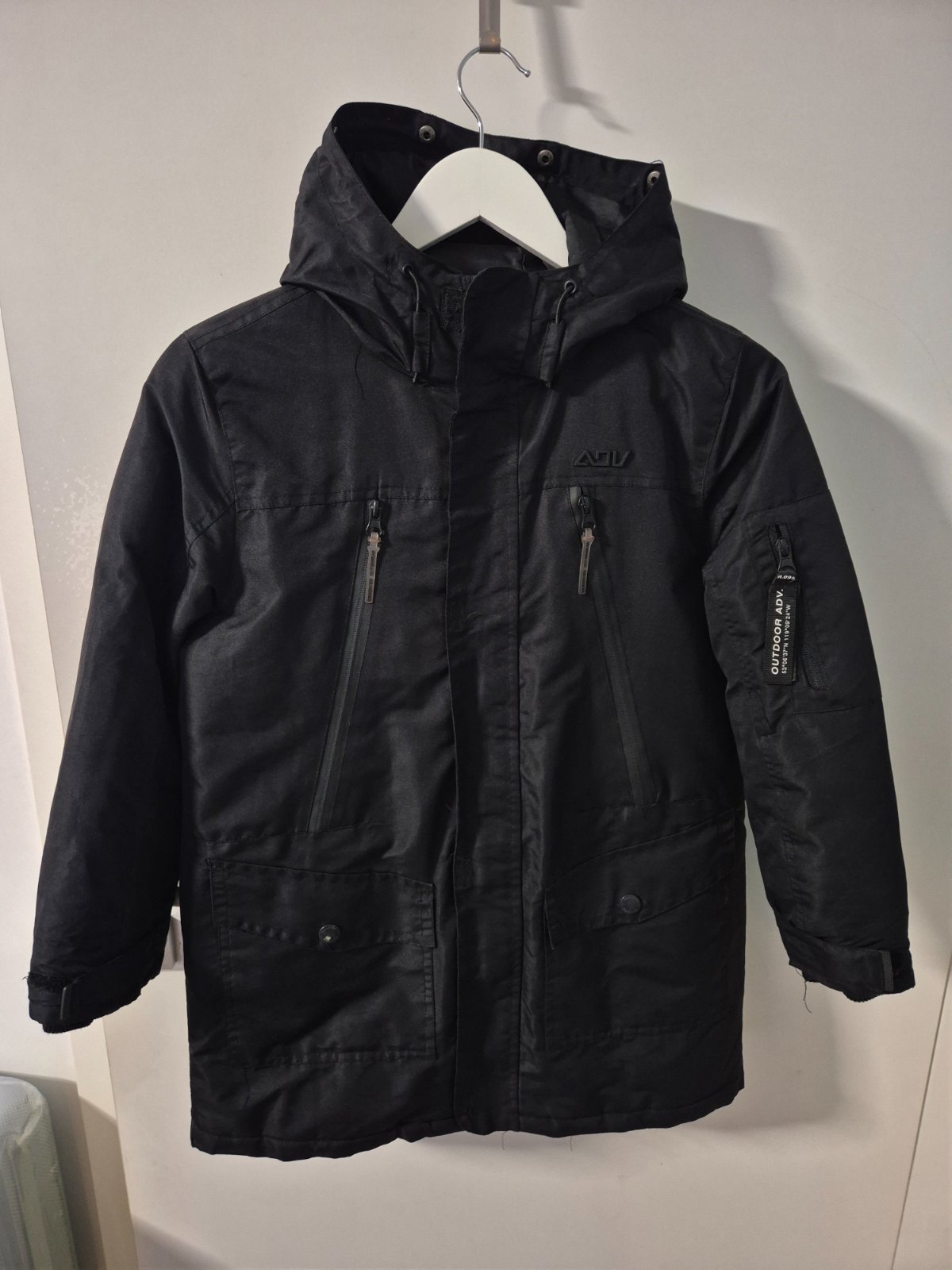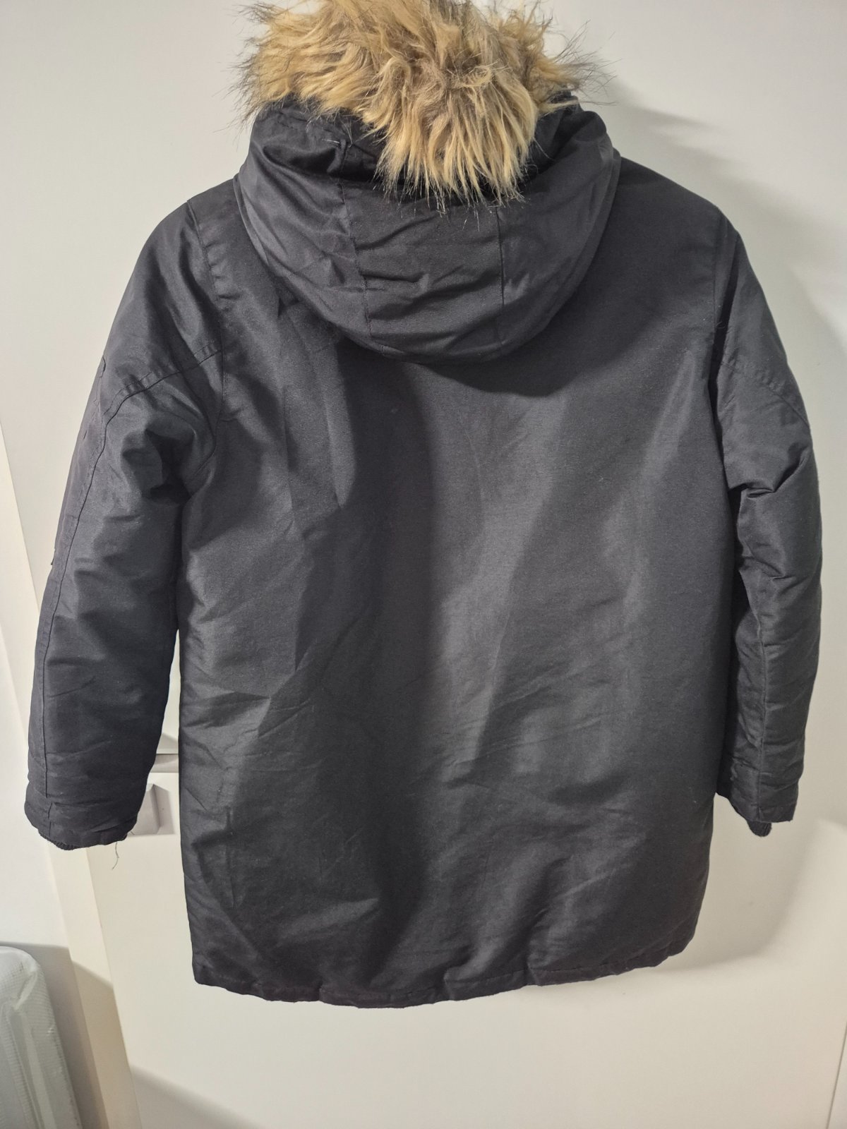 Nosena zimná bunda, takze nejaké známky nosenia su vid foto( napr. oskrety gombik) ale nic hrozne. Kožušina sa da odopnut. Rukávy majú patenty.