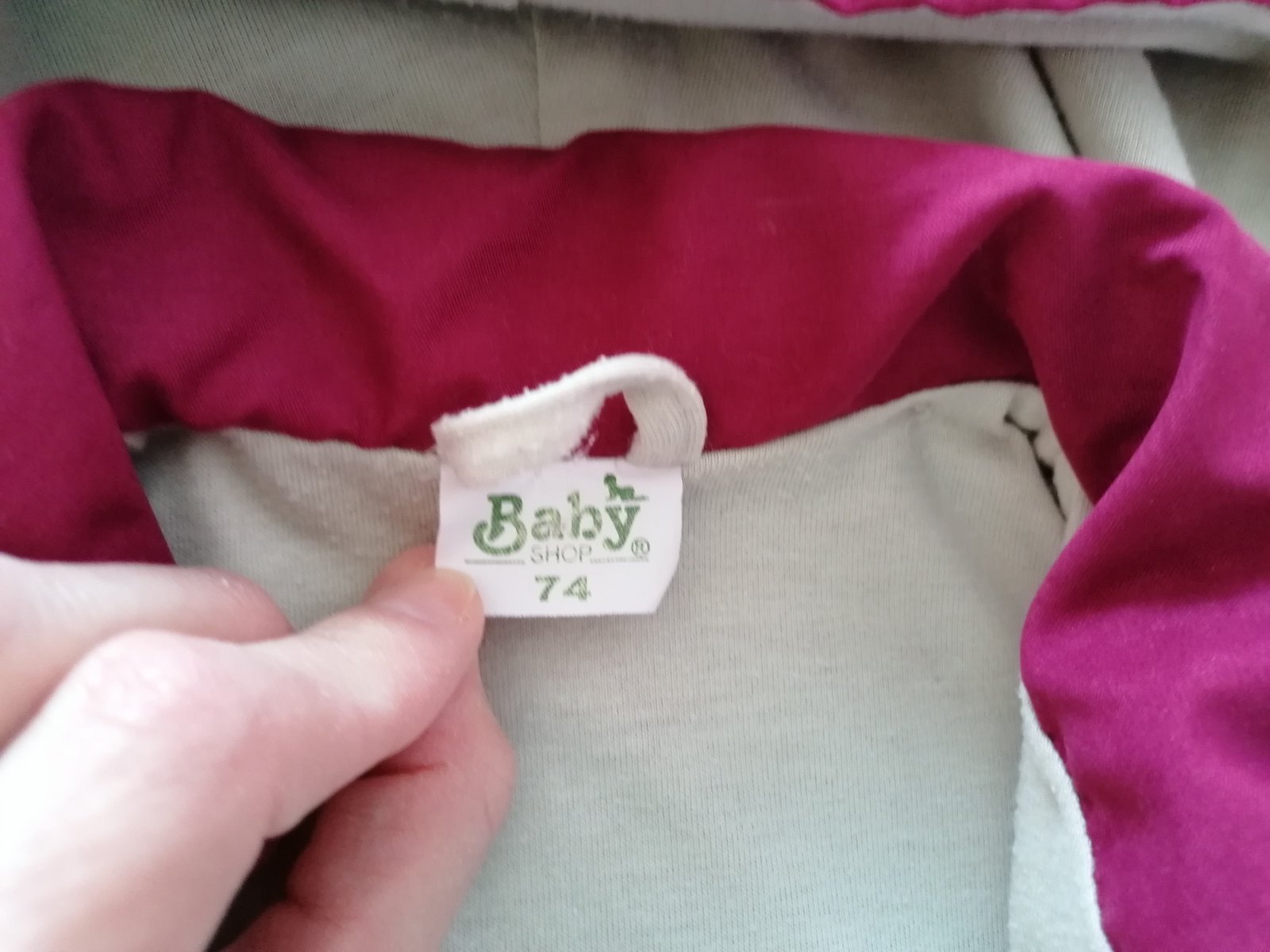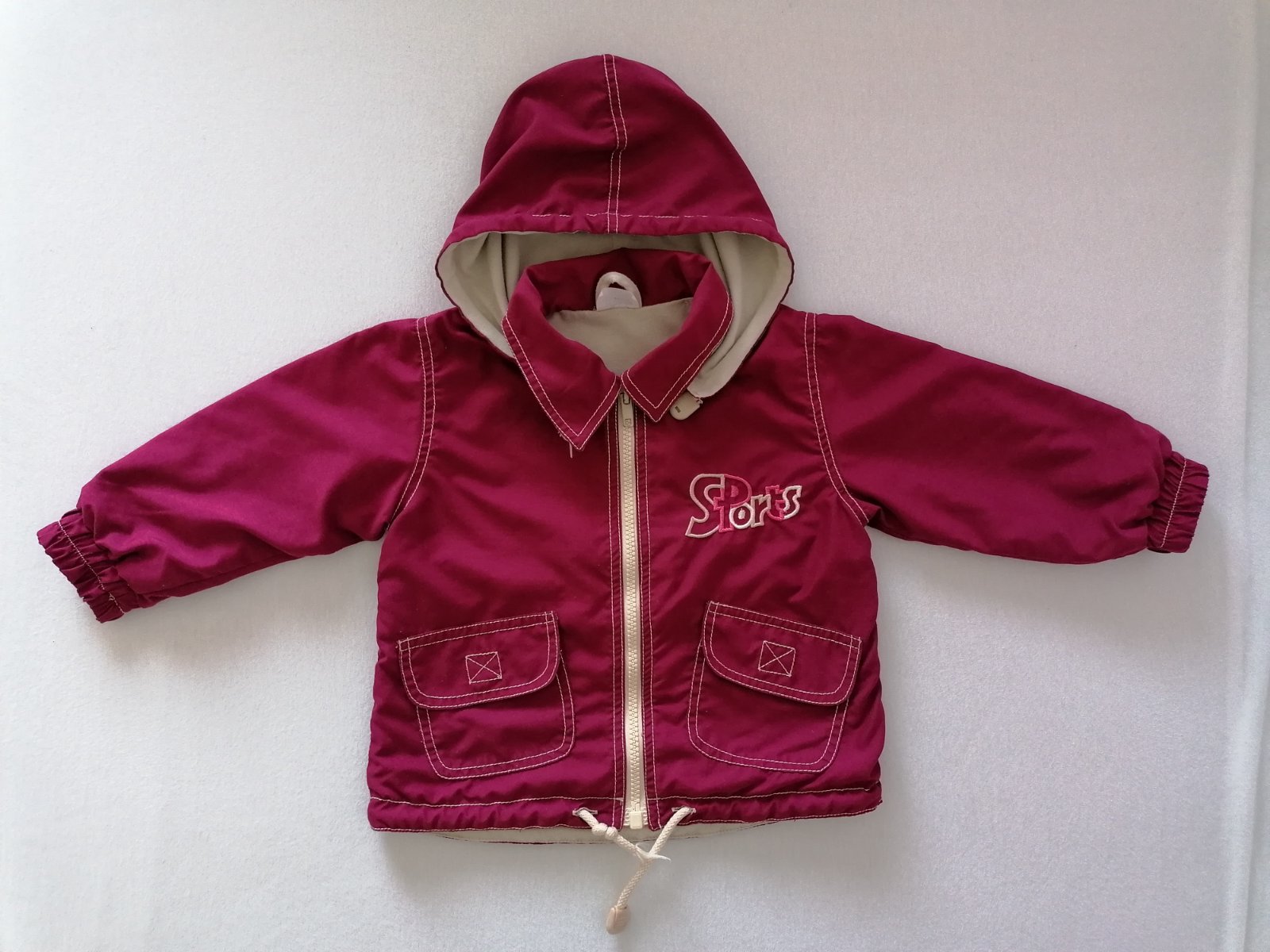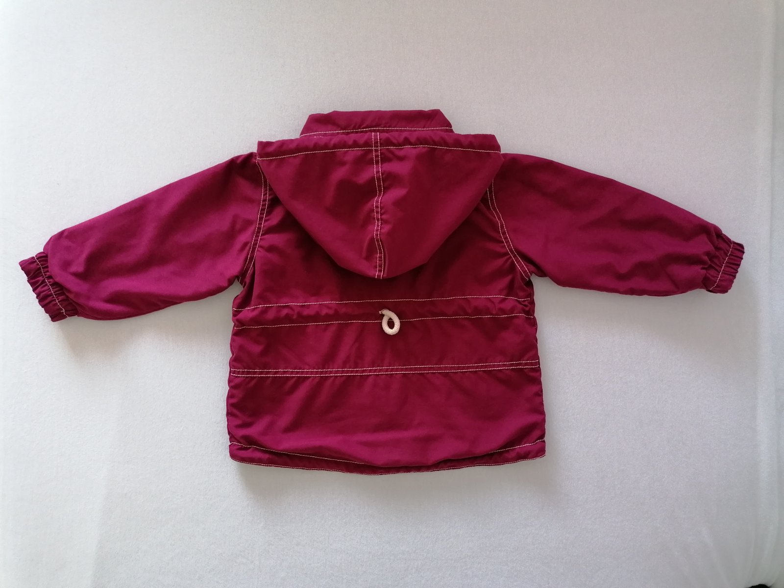 Prechodna (jarna/jesenna) bundicka, podšita bavlnenou latkou, kapucna sa da odopnut. Velkost 74 - sedi na 74/80.