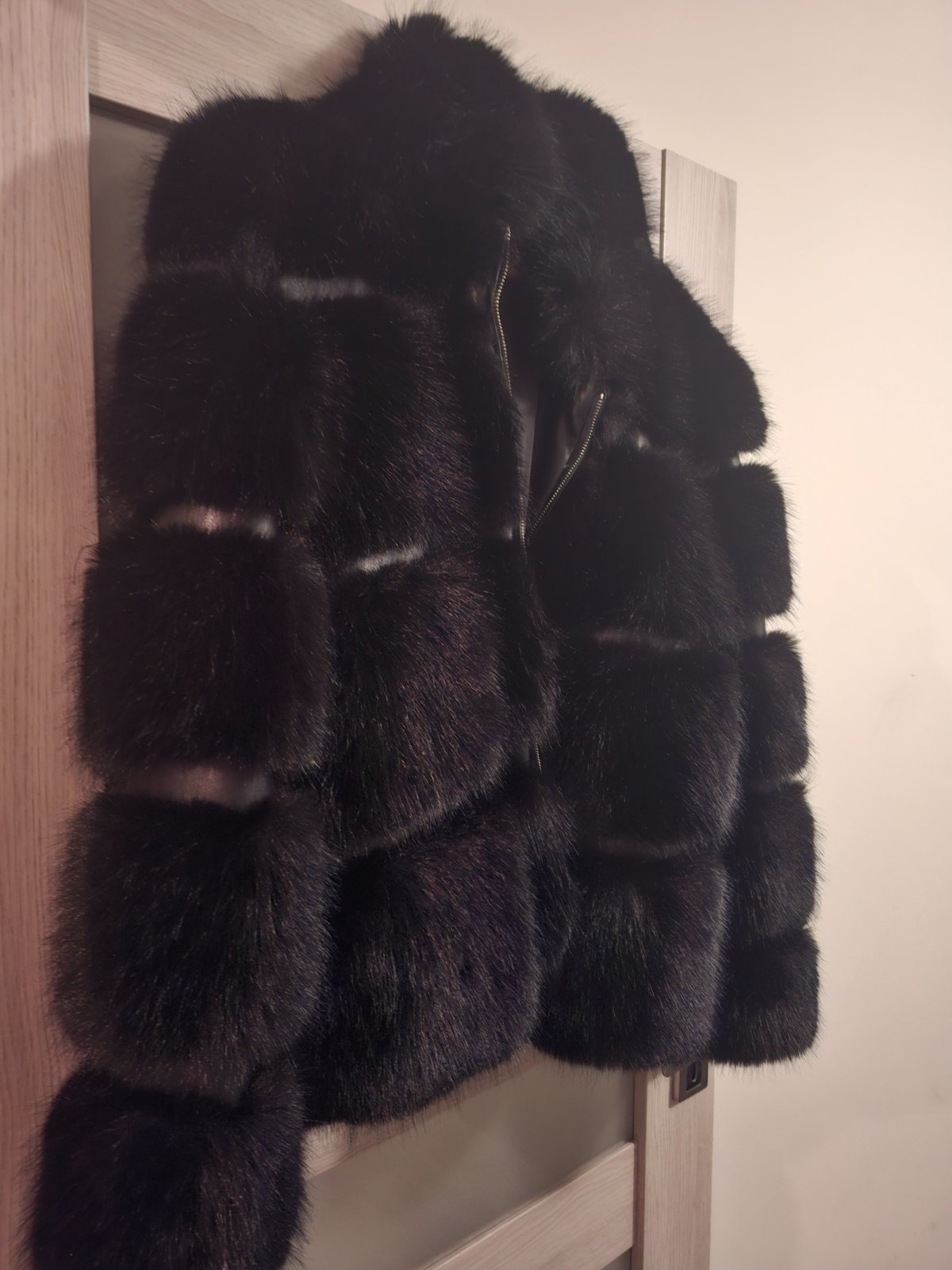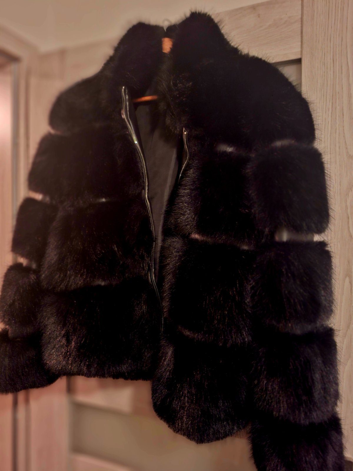 Veĺmi pekný čierny kožúštek ,je nový,nenosený,je mi trošku veĺký,inak by som si ho nechala.Veĺkosť L/XL
