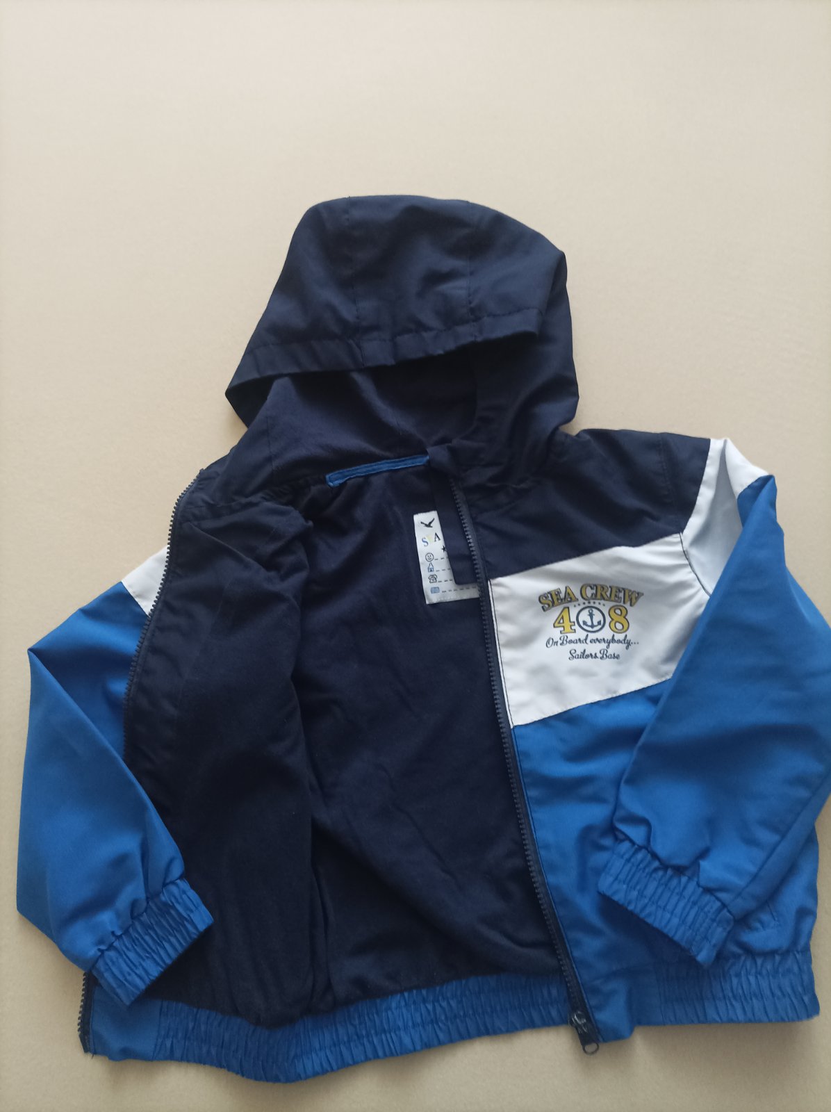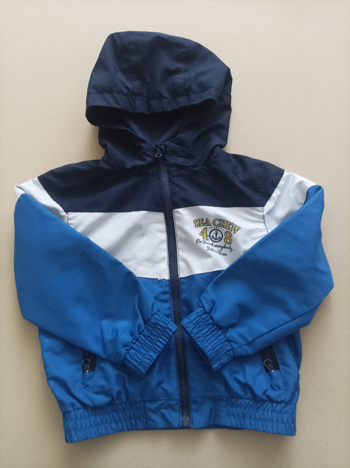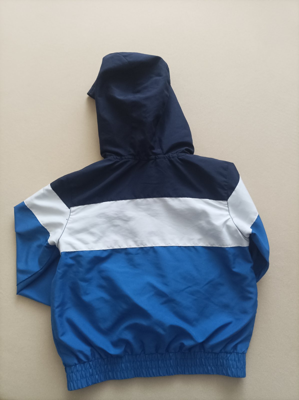 Synom nosená prechodná bundička, mierne vatovaná, ľahká, zároveň teplá. Nosená do škôlky na striedačku s inými. Našla som jeden fliačik vpredu, odfotené bez osvetlenia, aby som na yo vedela poukáza...