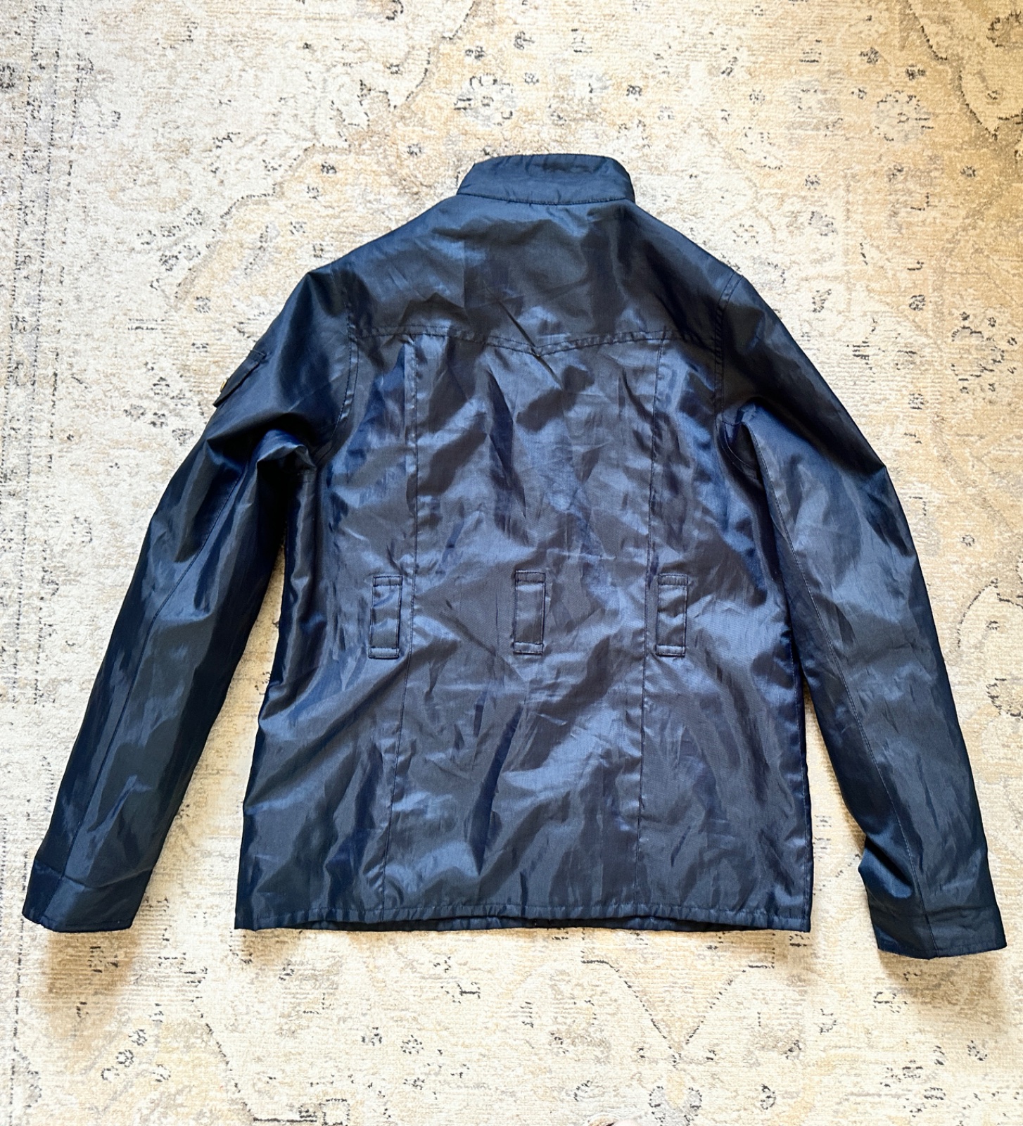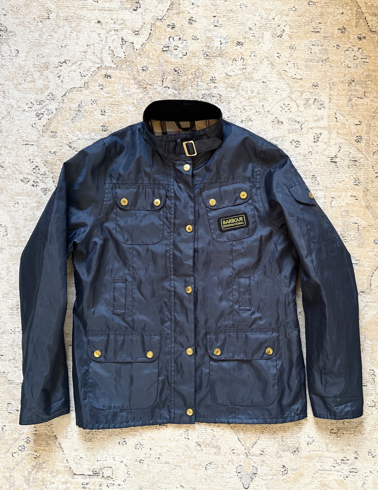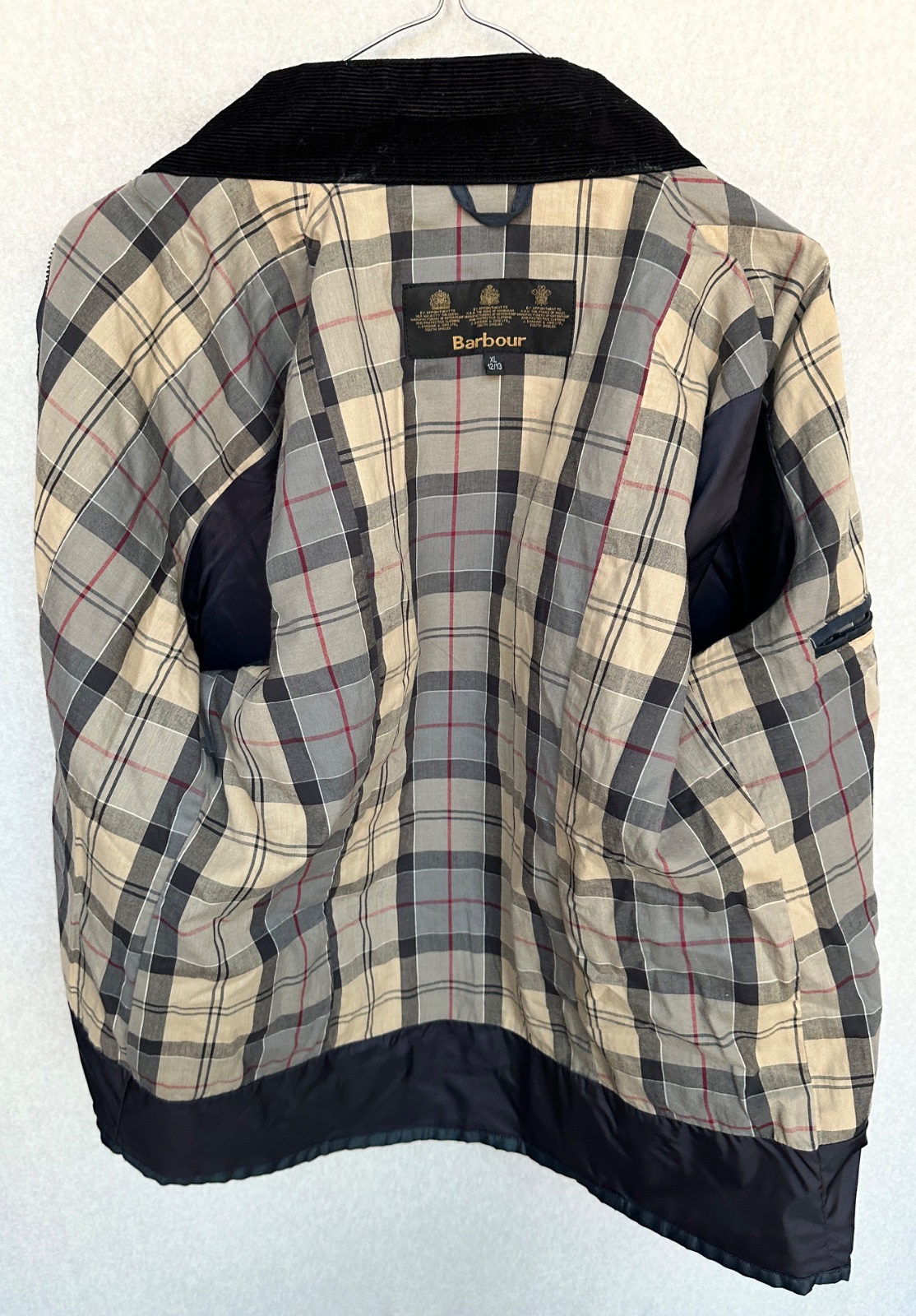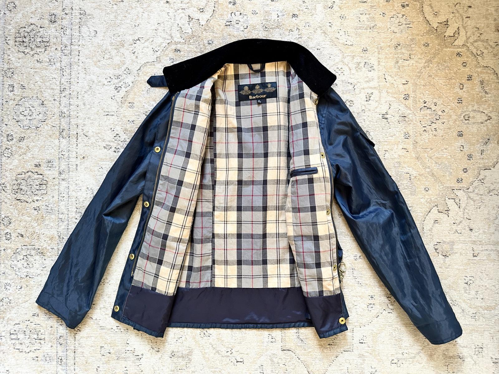 Dievčenská bunda luxusnej značky Barbour. Uvedená veľkosť XL na 12 - 13 rokov. Odolný vonkajší materiál, zapínanie na zips s prekrytím so zlatými cvokovými gombíkmi (každý má vygravírovaný nápis Barbour), má uško na zavesenie, v predu 2 horné vrecká, 2 spodné vrecká, vrecko na ramene a vnútorné vrecko, golier je zvnútra menšestrákový, vnútro bundy je futrované hebkým bavlneným typickým tartanovým vzorom značky. Vo veľmi peknom stave, niektoré gombíky majú mierne ošúchanie, opasok už nie je k dispozícii.