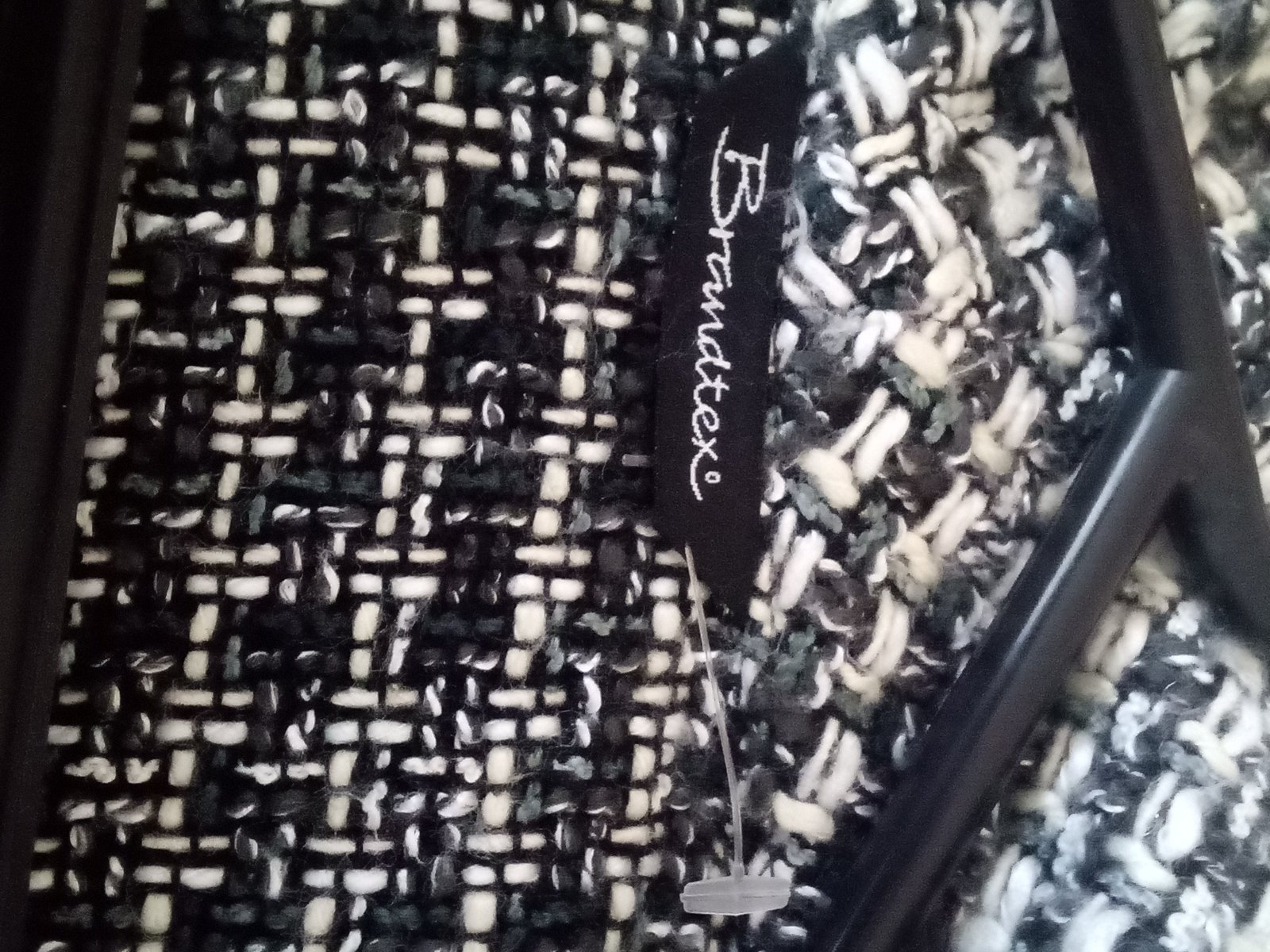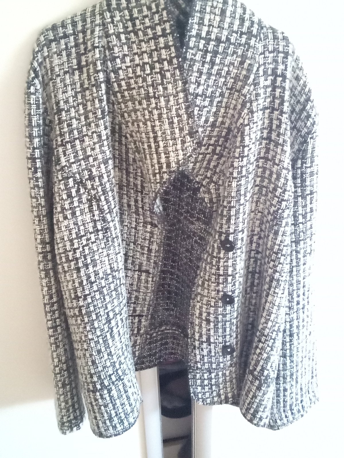 Kvalitny, raz oblečený trendy elegantny kostym,štrukturovany material,čeirno/bielej farby,s podšivkou.84%cotton,11%viskoza,5%elastan.super stav. Mne žiaľ veľký. Rozmery: vel.46,blejzer cez prsia ...