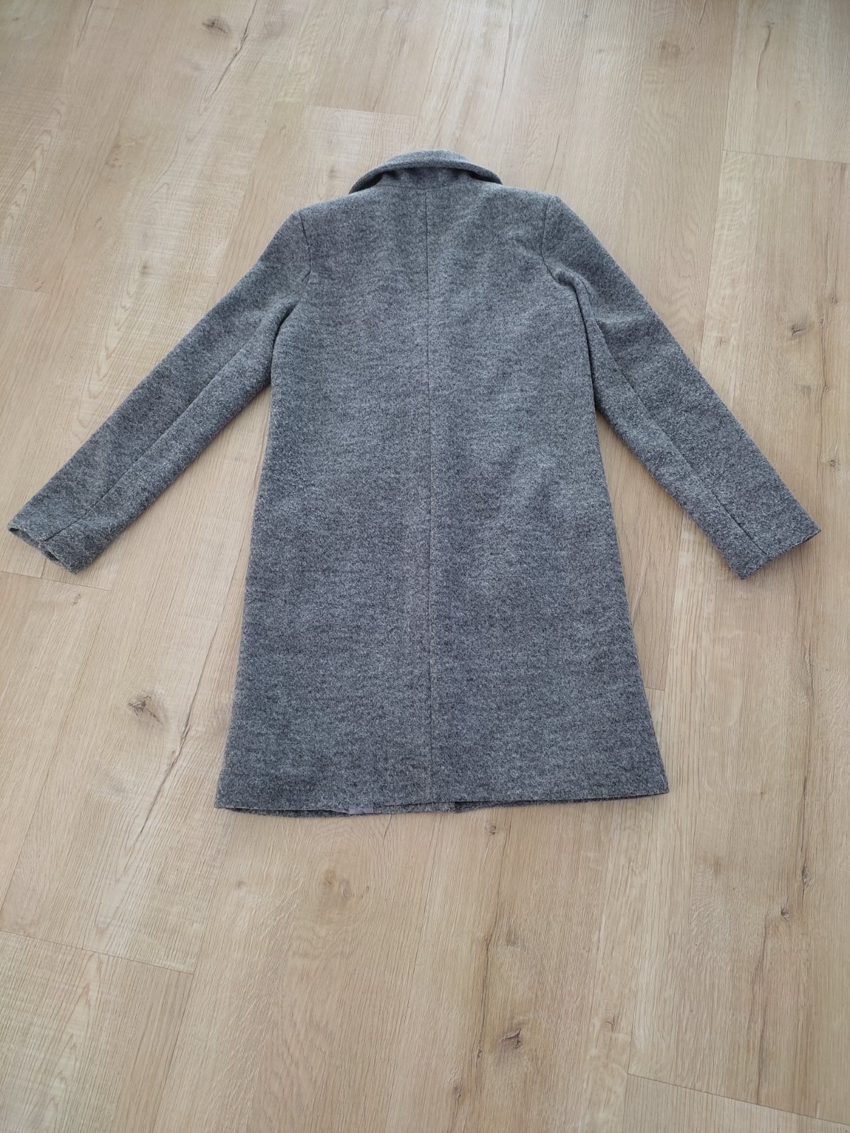 Kabát vo veľmi dobrom stave.Material je akoby vlnený fľašu.Miery:celková dĺžka 84cm,šírka pod pazuchami 49x2 cm,dĺžka rukáva od krku 72cm kabát je s vreckami,super sedí aj k rifliam.