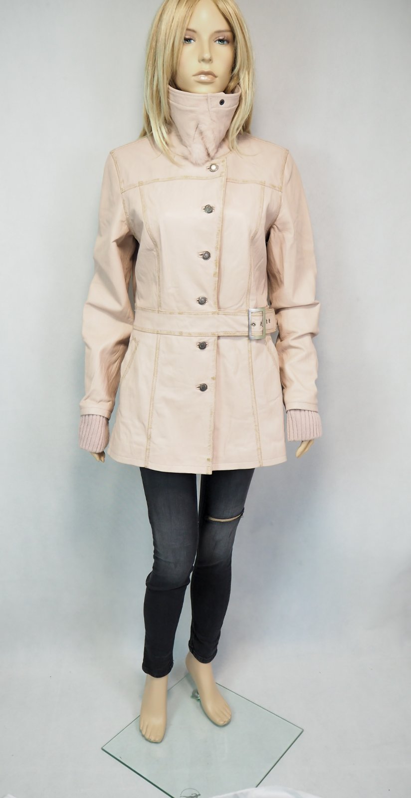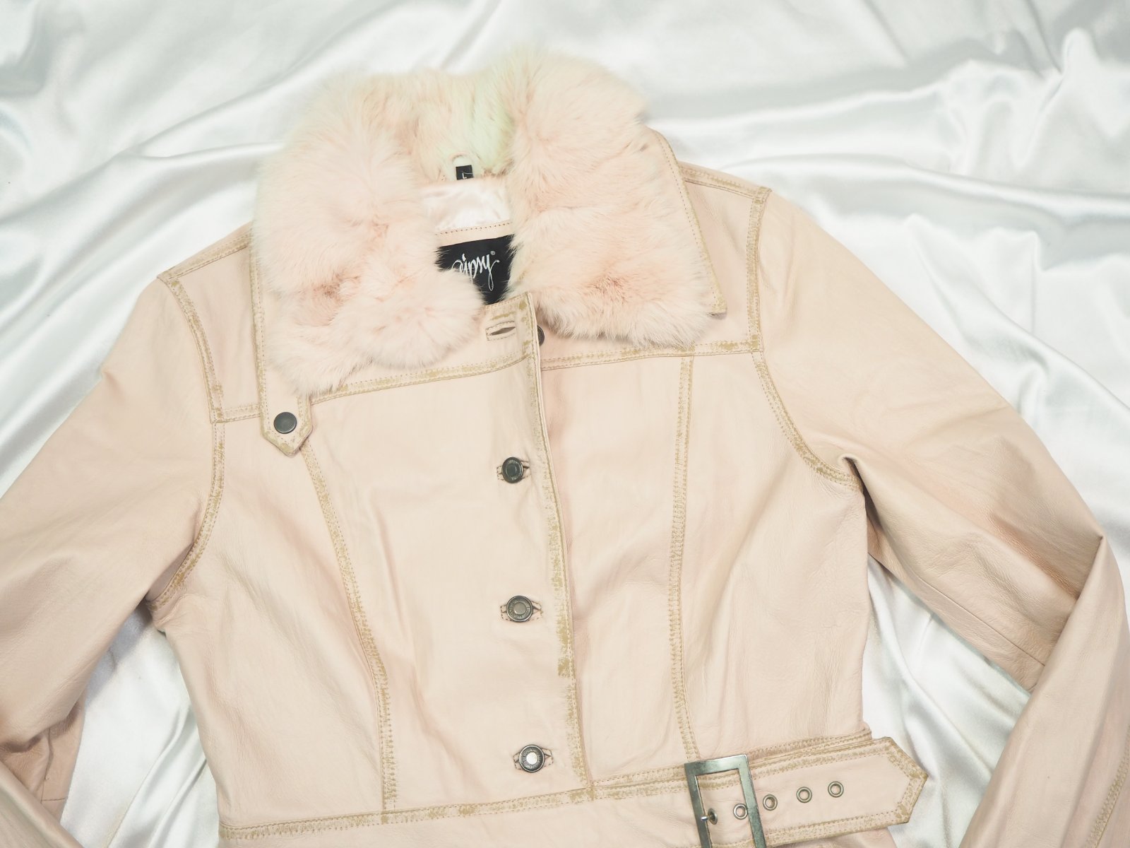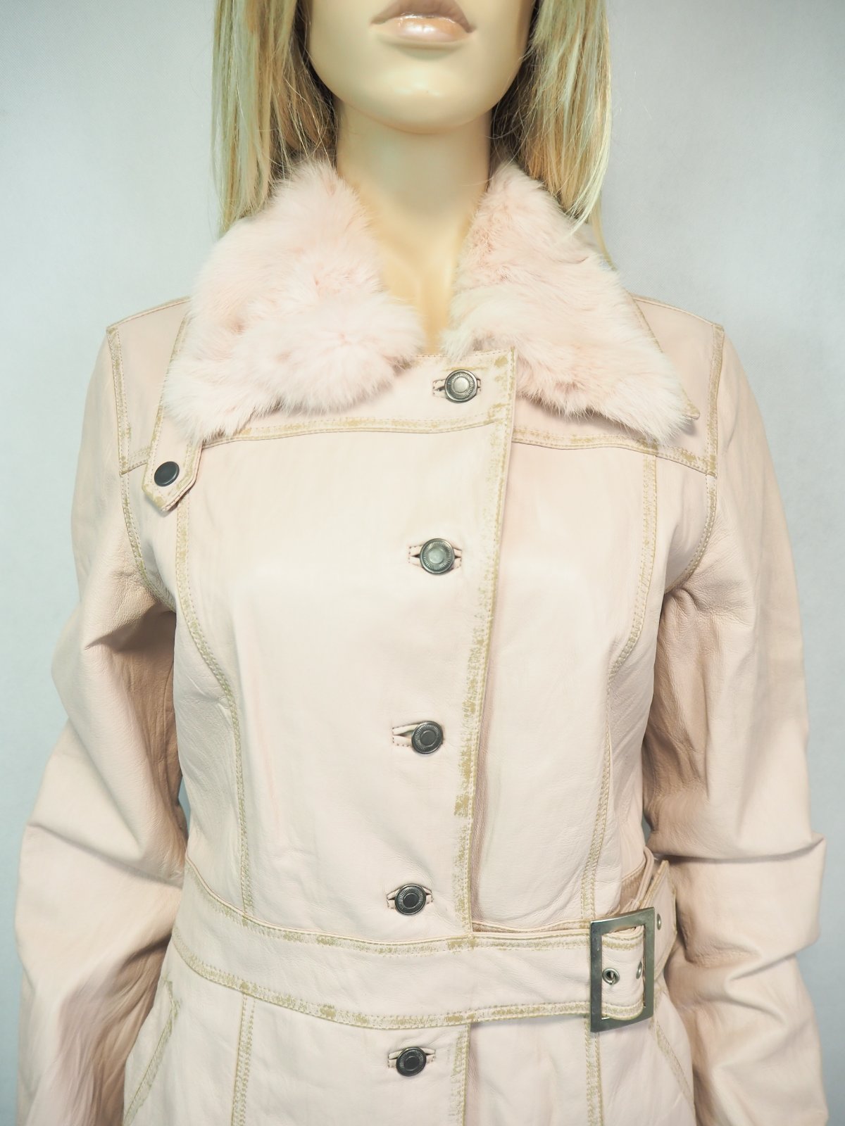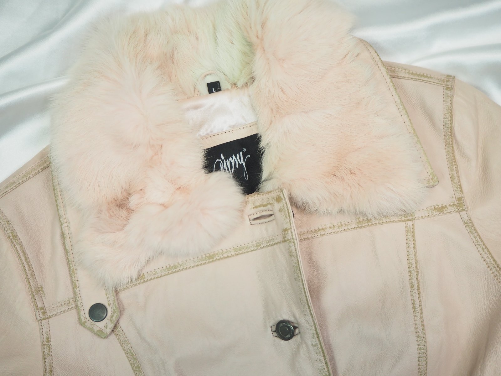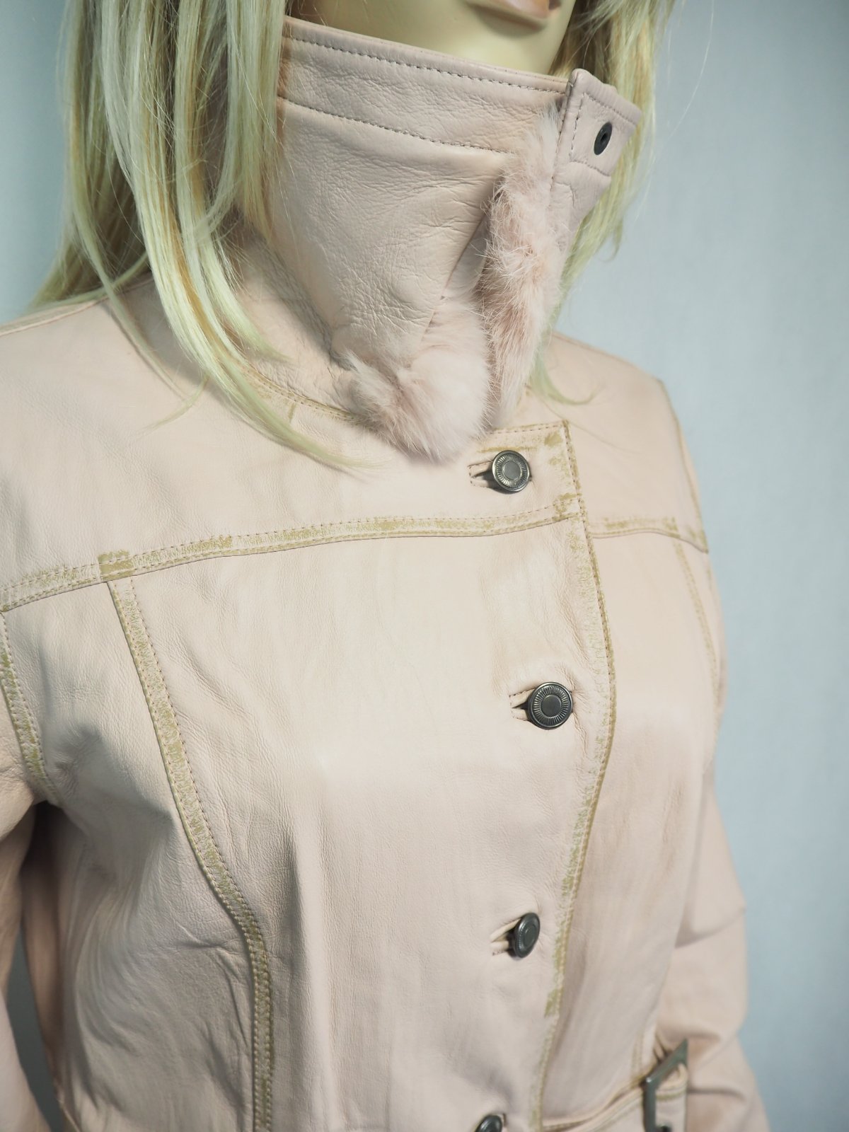 Luxusná kožená bunda svetloružovej farby, zapínanie na gombíky, v páse remienok, podšitá luxusnou saténovou látkou s potlačou, pravá koža, jemne batikovaná okolo švíkov, pozri detaily, super stav, ako nová, na golieri pravá kožušina, pc 250 €