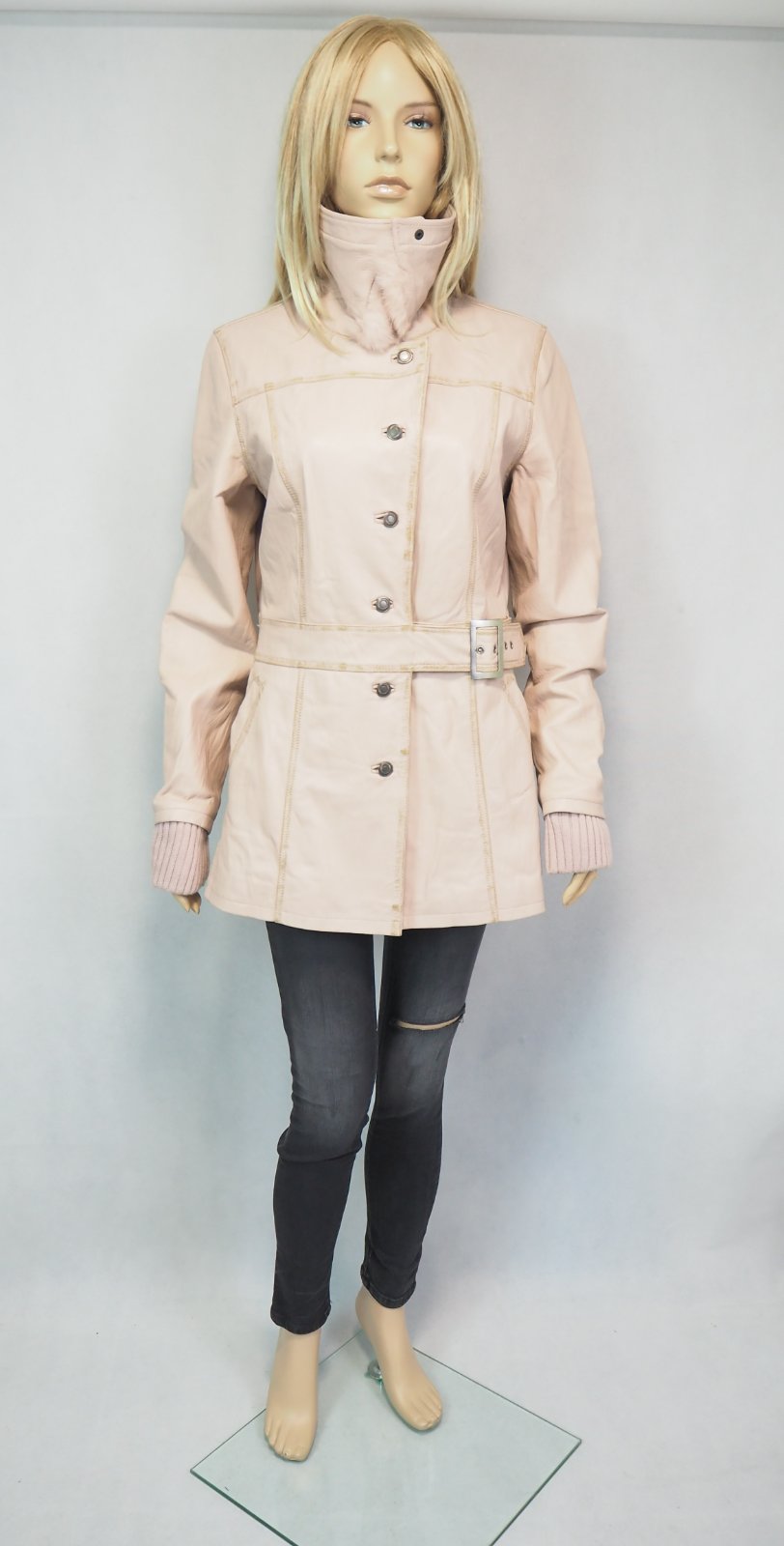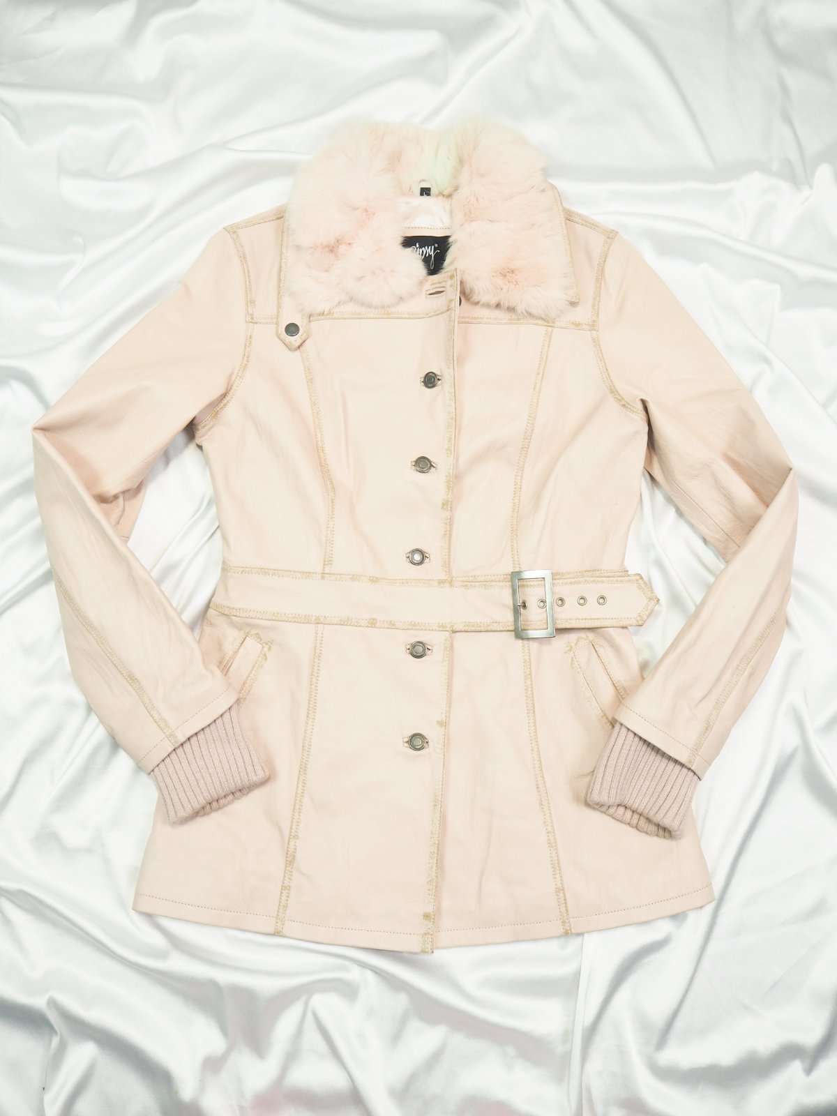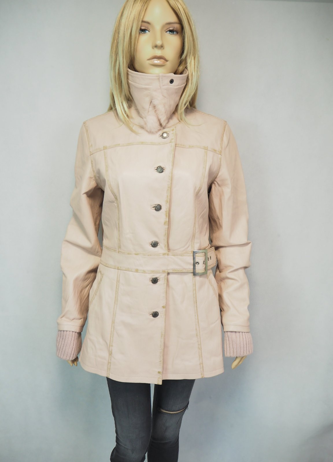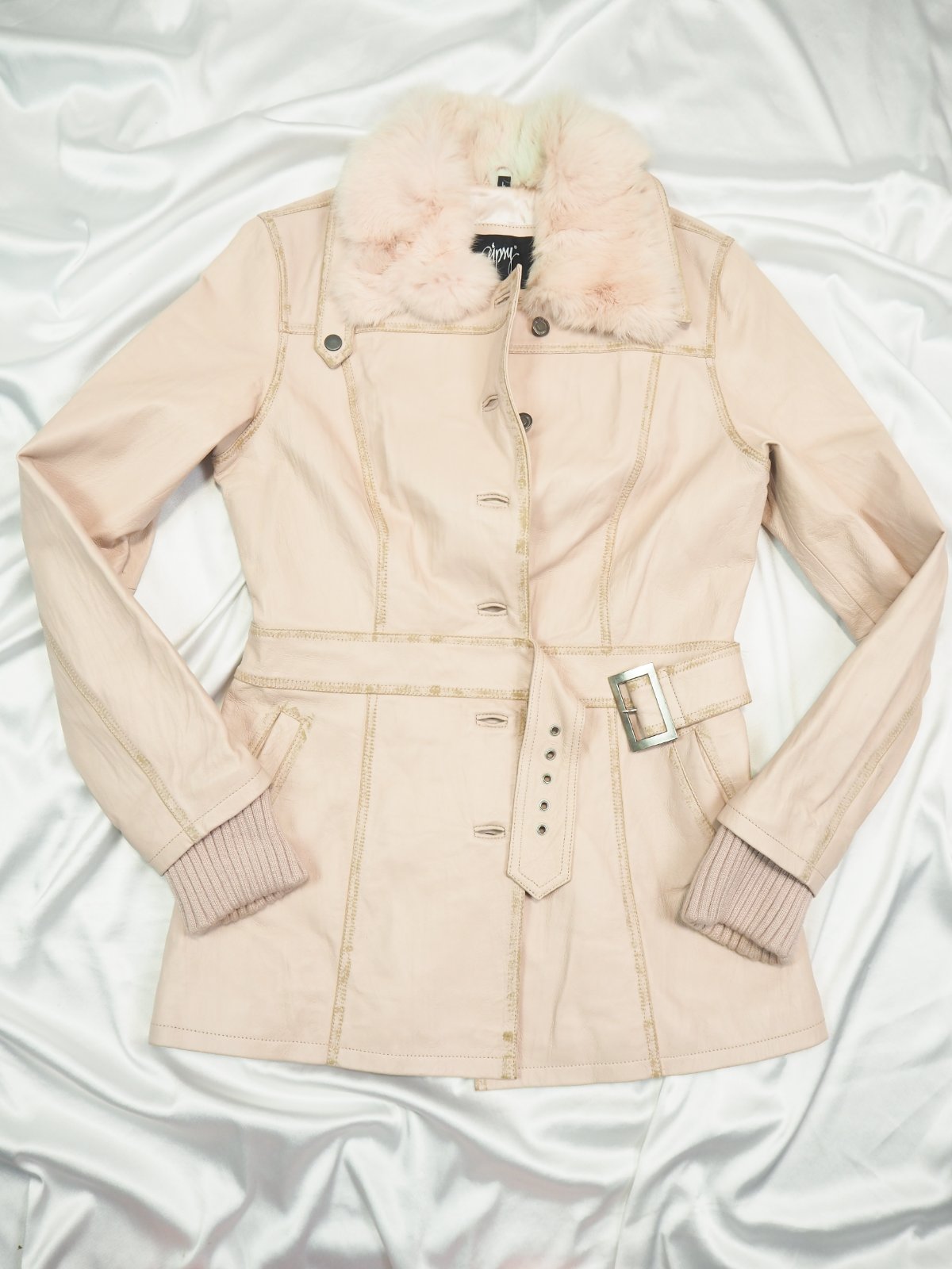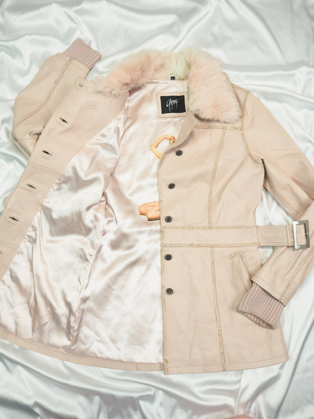 Luxusná kožená bunda svetloružovej farby, zapínanie na gombíky, v páse remienok, podšitá luxusnou saténovou látkou s potlačou, pravá koža, jemne batikovaná okolo švíkov, pozri detaily, super stav, ako nová, na golieri pravá kožušina, pc 250 €