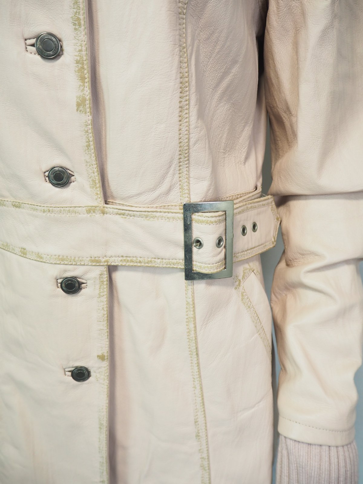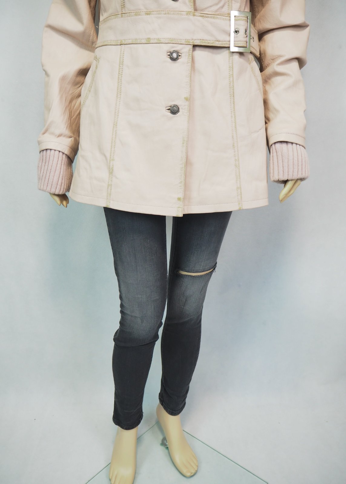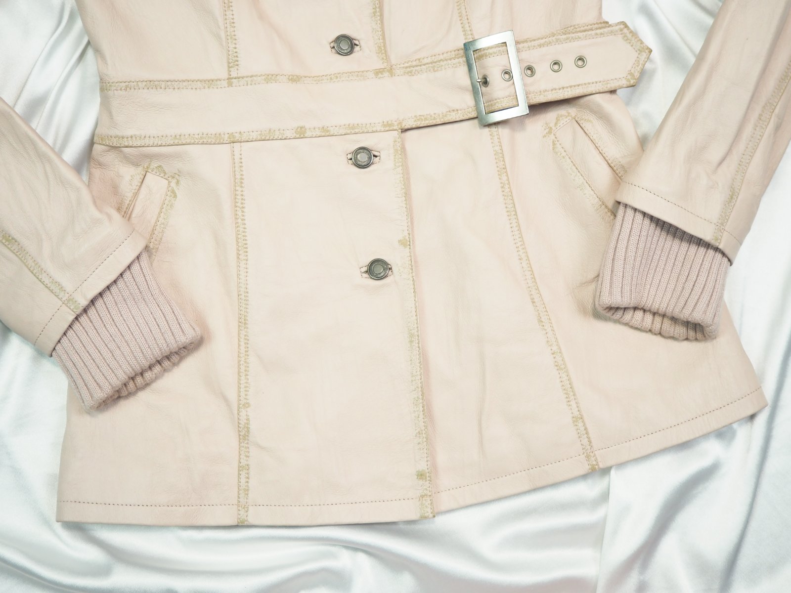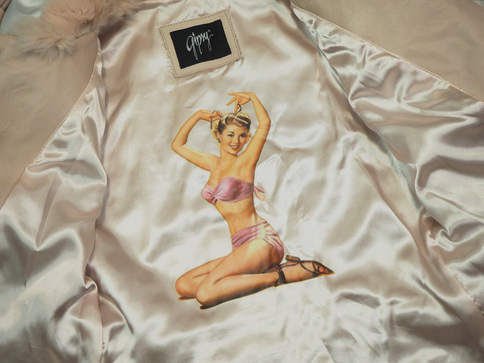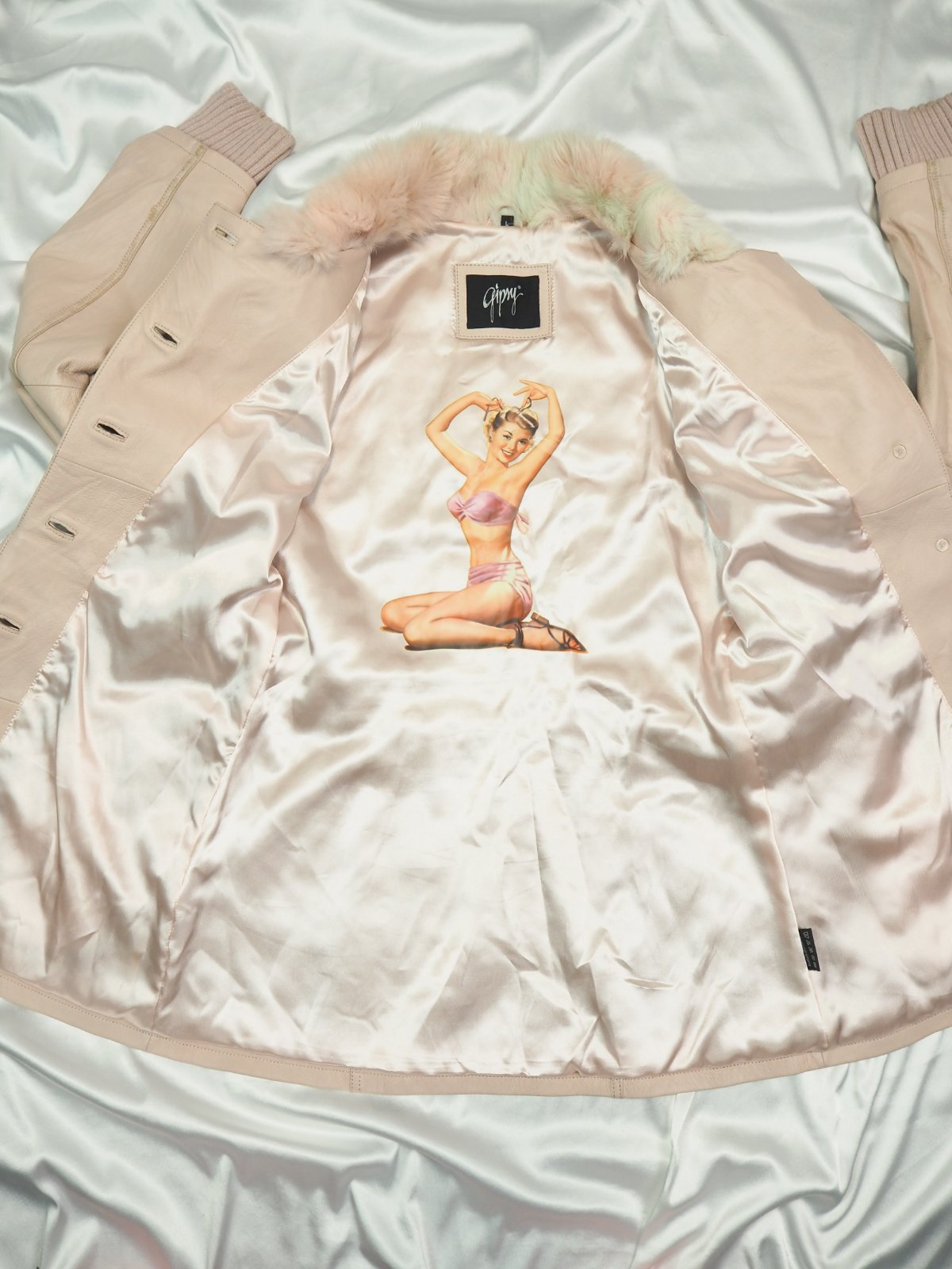Luxusná kožená bunda svetloružovej farby, zapínanie na gombíky, v páse remienok, podšitá luxusnou saténovou látkou s potlačou, pravá koža, jemne batikovaná okolo švíkov, pozri detaily, super stav, ako nová, na golieri pravá kožušina, pc 250 €