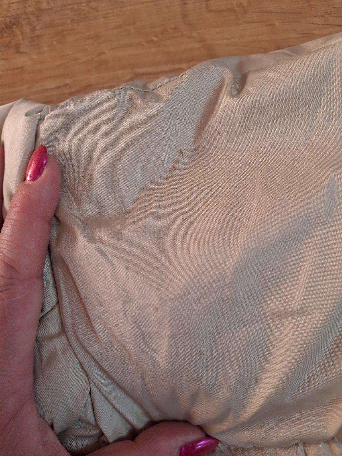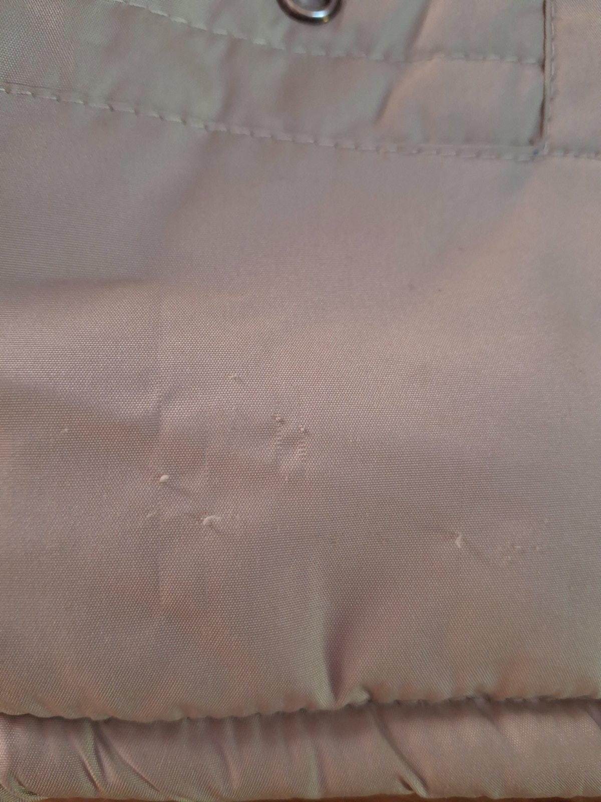 Nosená vesta. Fliačiky na kapucni a pozaťahované pod pravým vreckom .