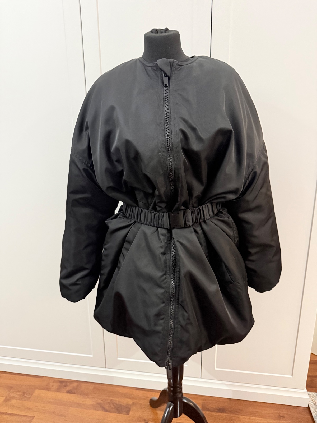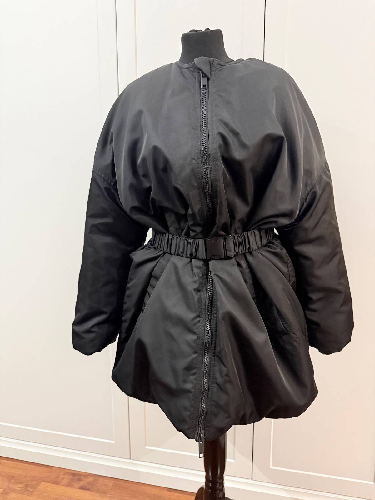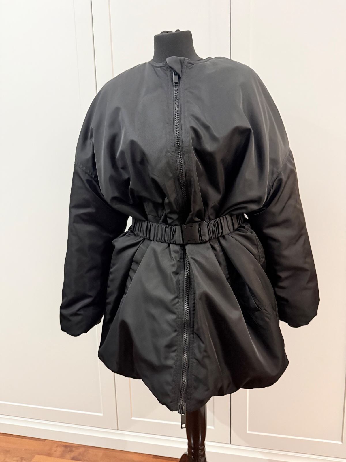 Parkrat vzata,super prepracovana.Overzise kusok,opaok nebol sucastou,dokupila som,pridam k bunde ,vyťzera to super spolu.Velkost XXS-XS.Naozaj sadne od XXS az po L, moznost nosit na viac sposobov.PC bola 290€.Naozaj super kusok,ale neunosim,mam vela bund.