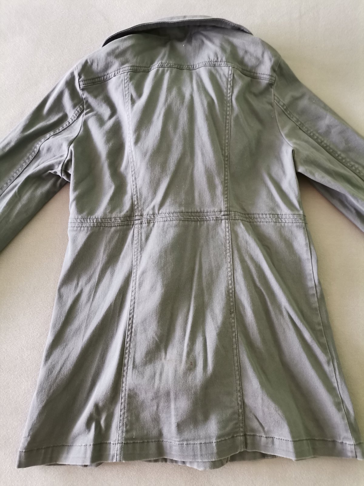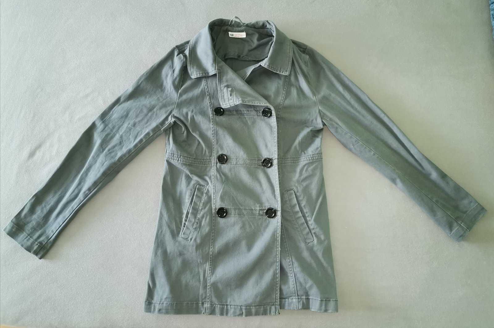 Dámske dvojradové sako, alebo krátky plášť. Veľkosť píšu 170, ja nosím S-M, len mi je úzke cez prsia, mám D. Takže by možno bolo ja nejakej slečne. Nie je podšité. Na chrbáte, na spodku je nejaký fľak. Je to vidieť len keď som to odfotila s bleskom (viď. foto). Má asi 600g.