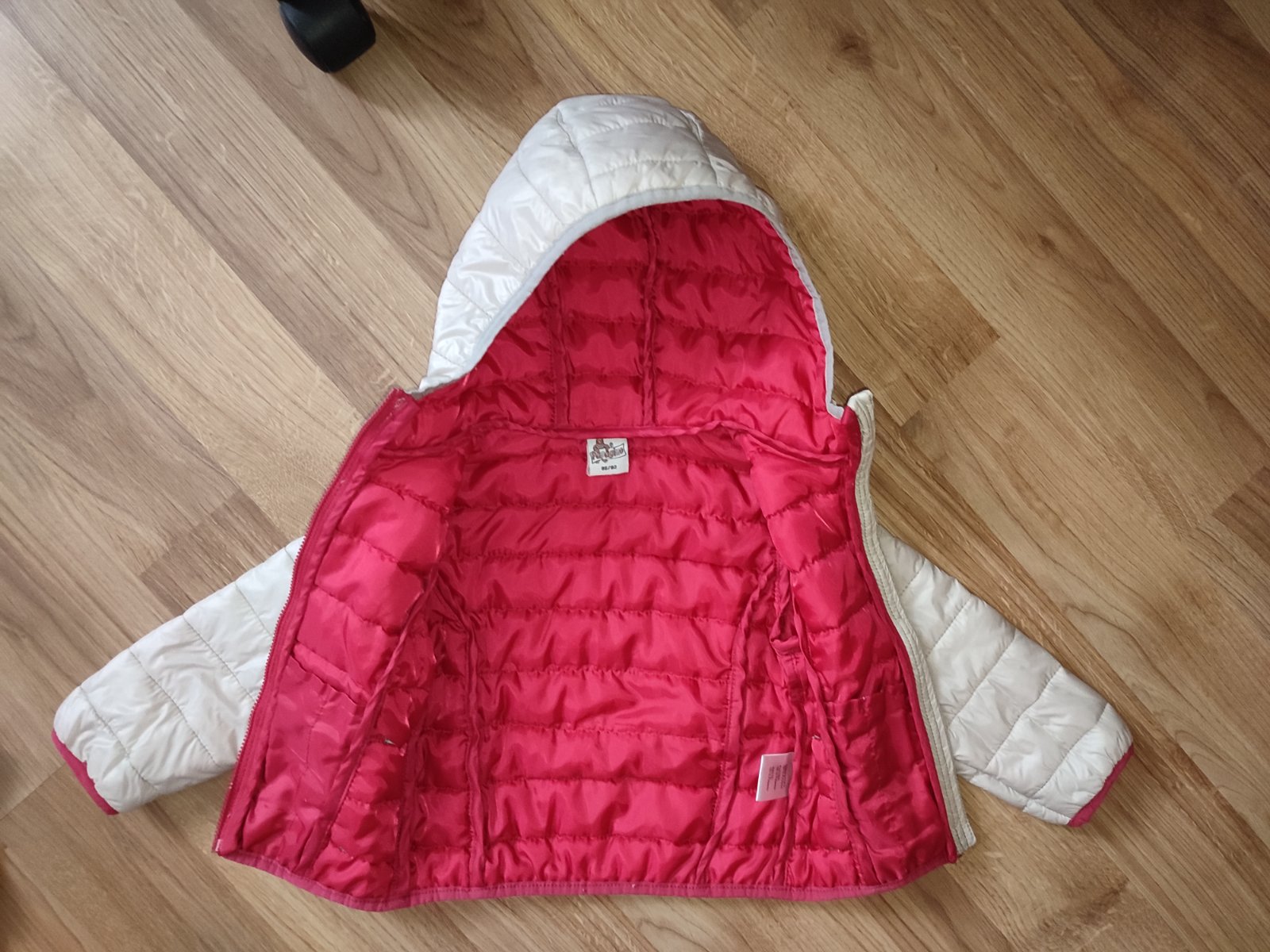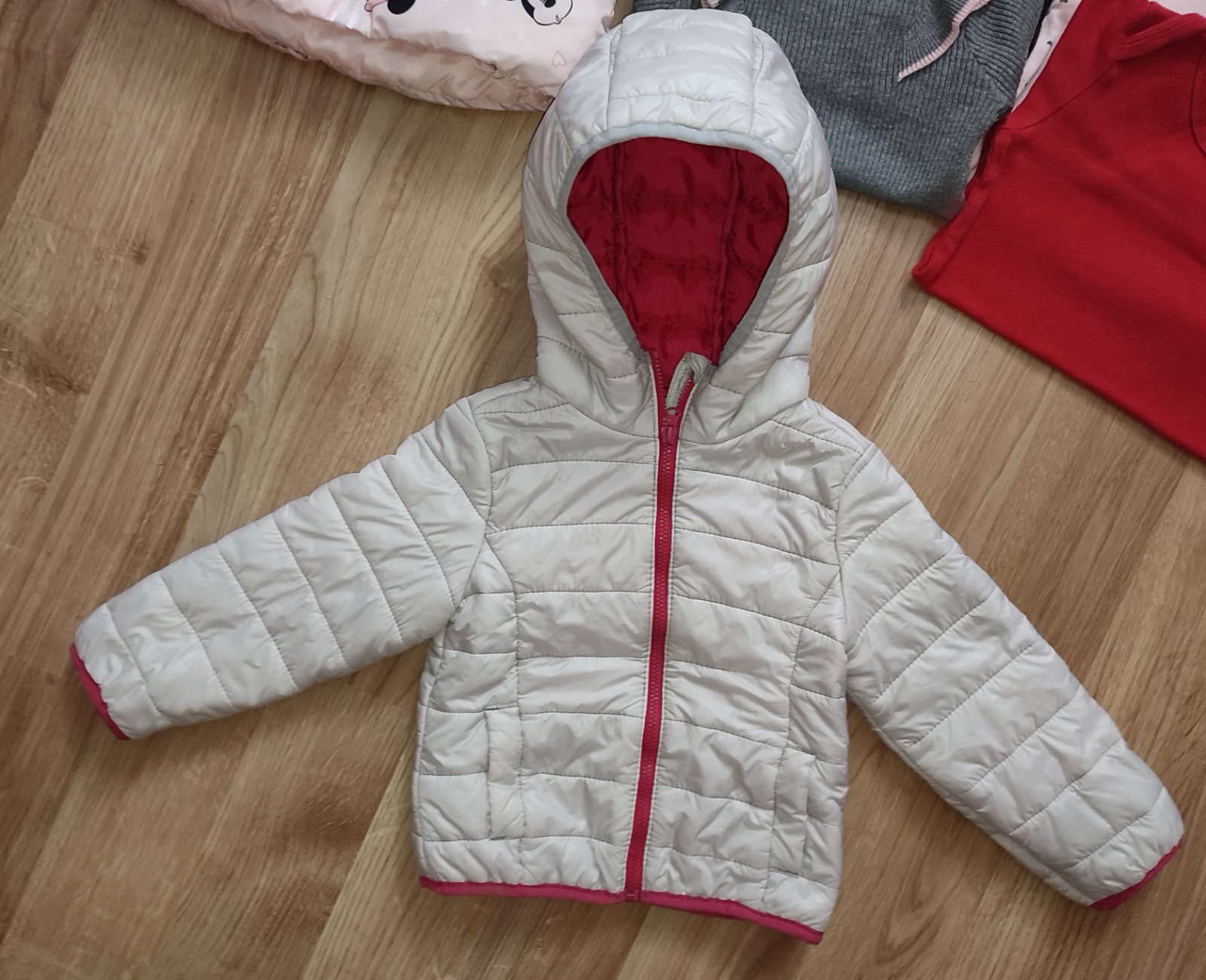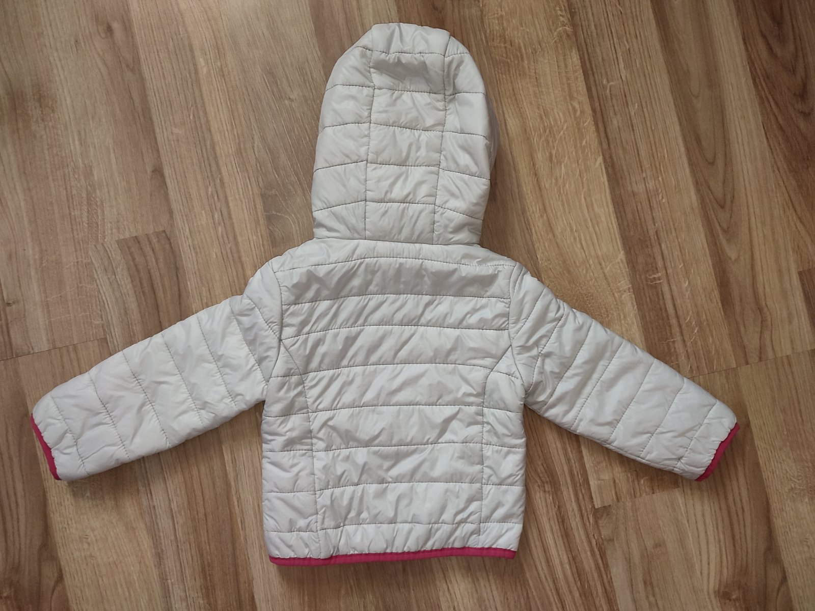 krásna prechodná bunda sivo-ružovej farby, vzadu na kapucni malý fliačik ale pri nosení nevidno, inak žiadne poškodenia nemá, veľkosť 86-92 aj tak sedí
