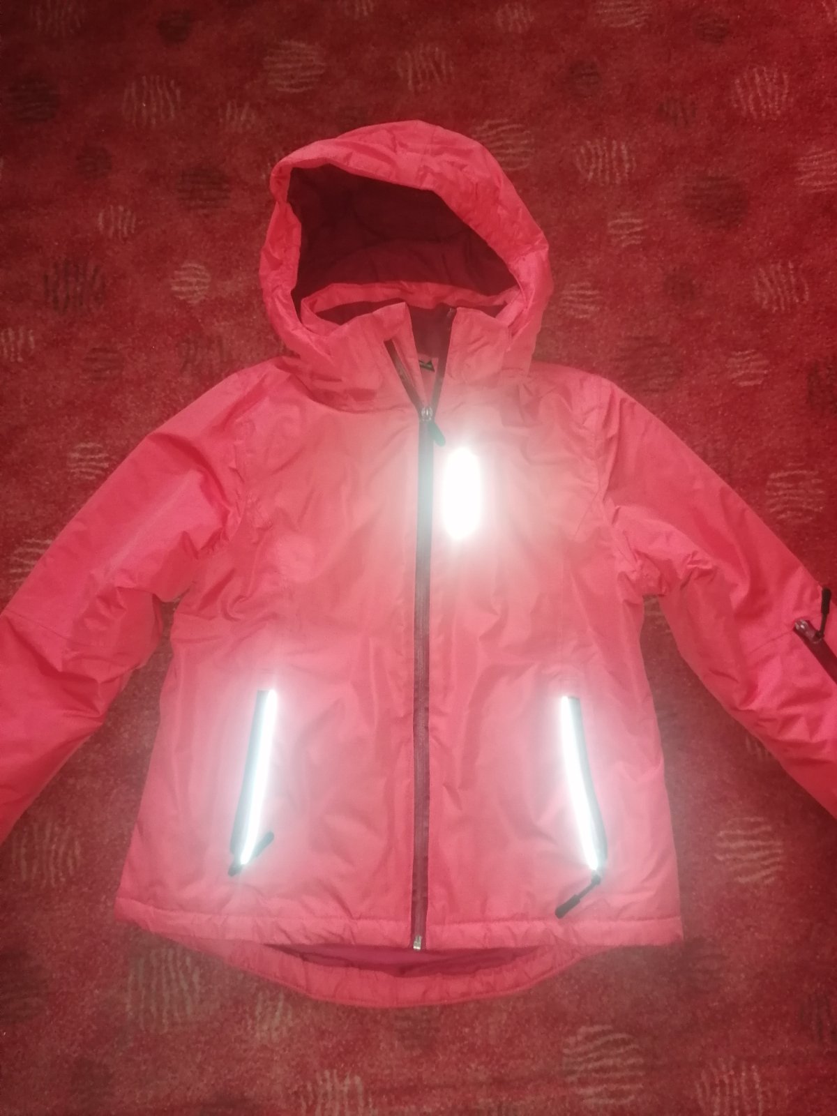 Dievčenská lyžiarska bunda. CMP. Veľkosť 152. Oranžovočervená farba. Kožušina na vnútornej chrbtovej časti. Trochu ošuchnuté na vrecku na lístok na rukáve. Snežný pás.