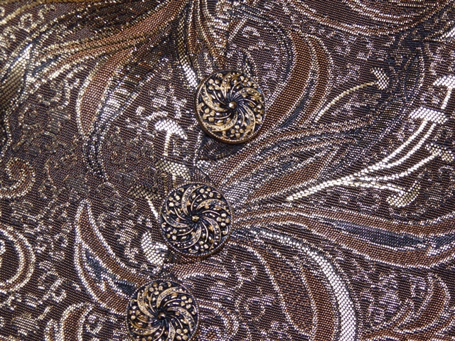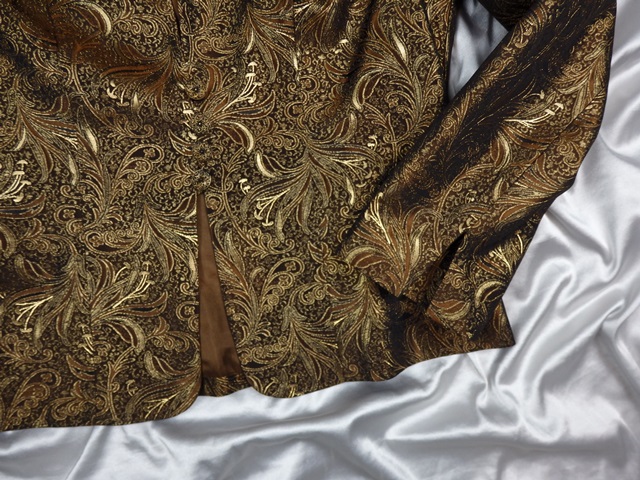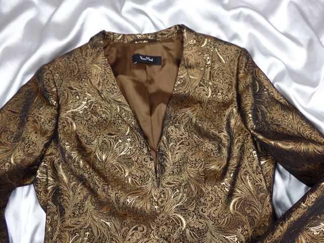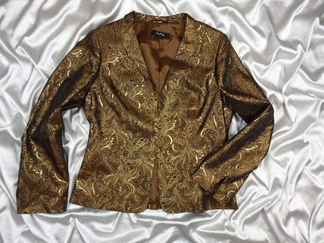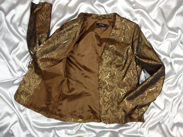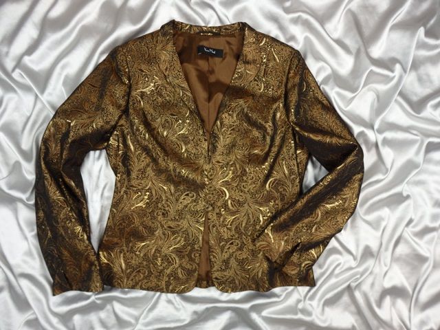Luxusné spoločenské sako zlatohnedej farby, krásna potlač, zapínanie na drobné gombíky, podšité, materiál 91% acetát, 9% metal vlákno, podšívka 100% acetát, super stav.
