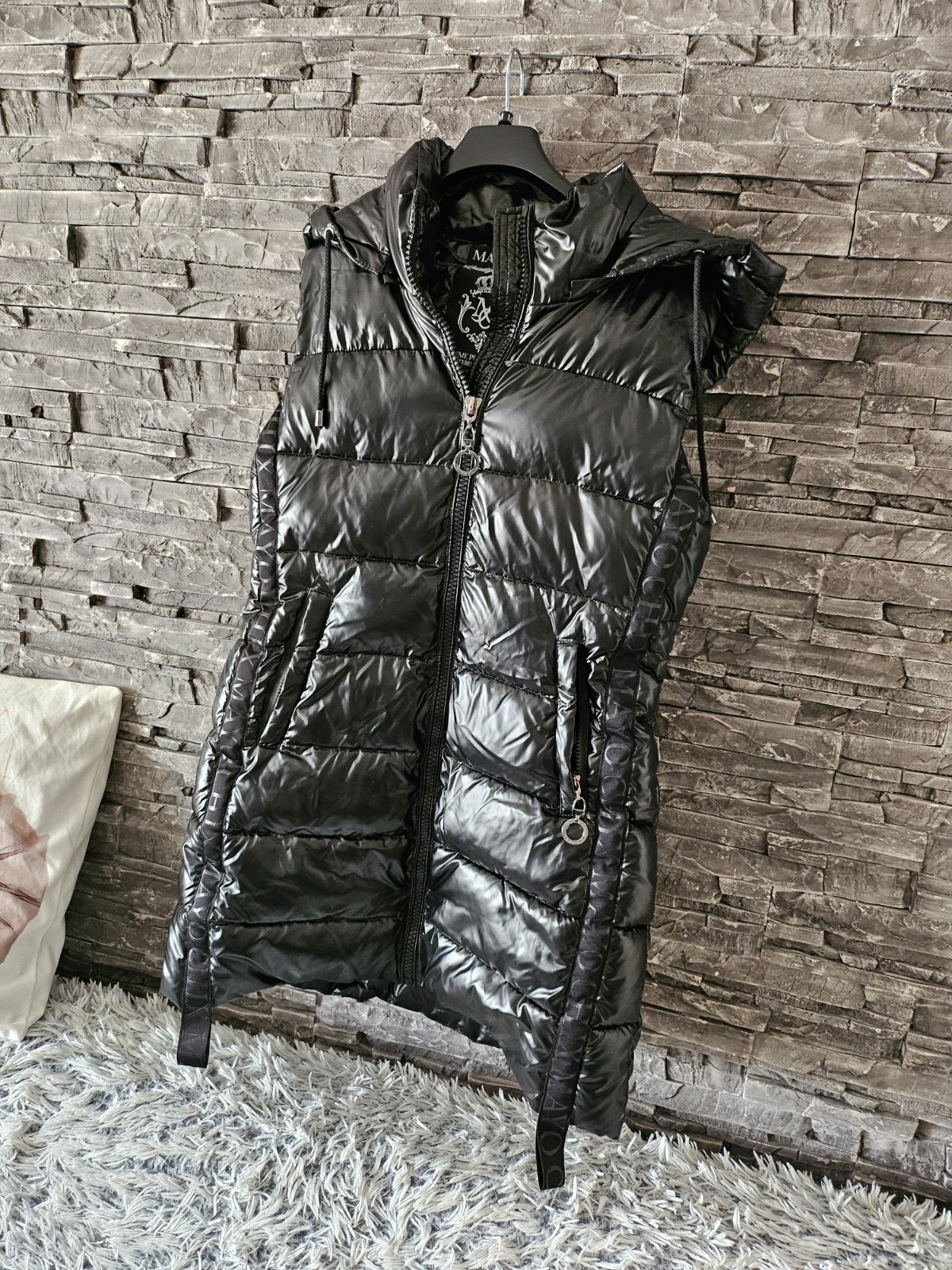 Teplá prešívaná vesta s vreckami, odzipsovateľnou kapucňou, vyrobená z lesklého materiálu, s aplikáciou značky po bokoch, zapínanie na zips. Kovová značka na kapucni. Materiál: Vonkajší materiál: ...