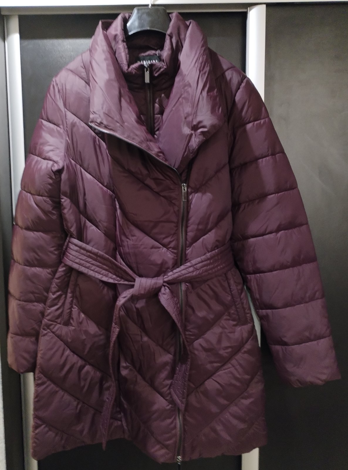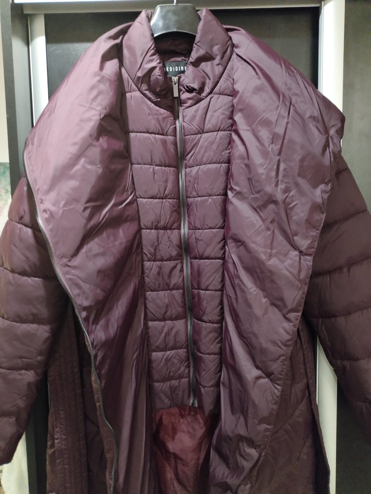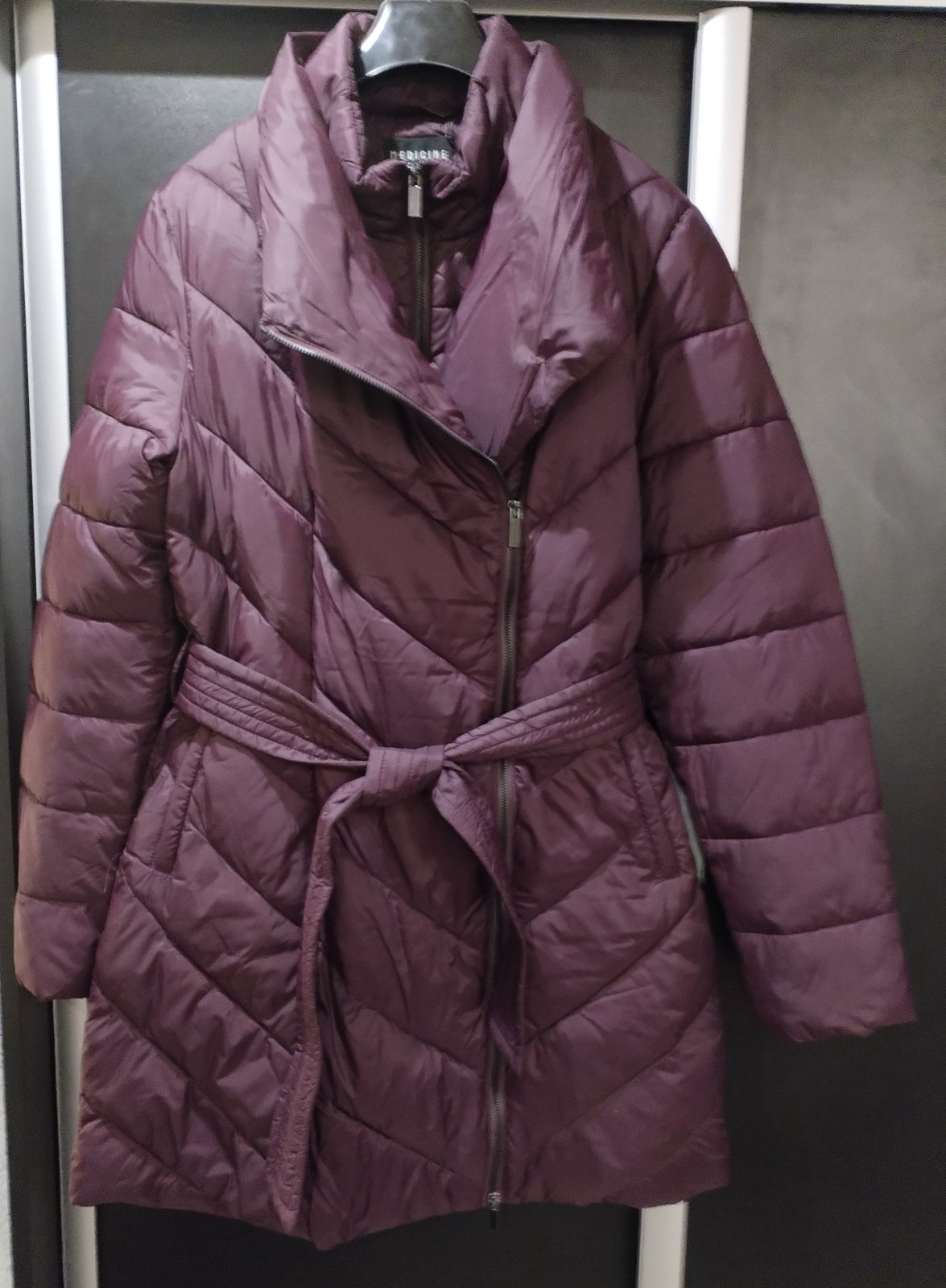 Krásna nenosená zimná značková bunda, s opaskom, teplá, baklažánova farba, s jemným odleskom, dĺžka nad kolená, zn Medicine.