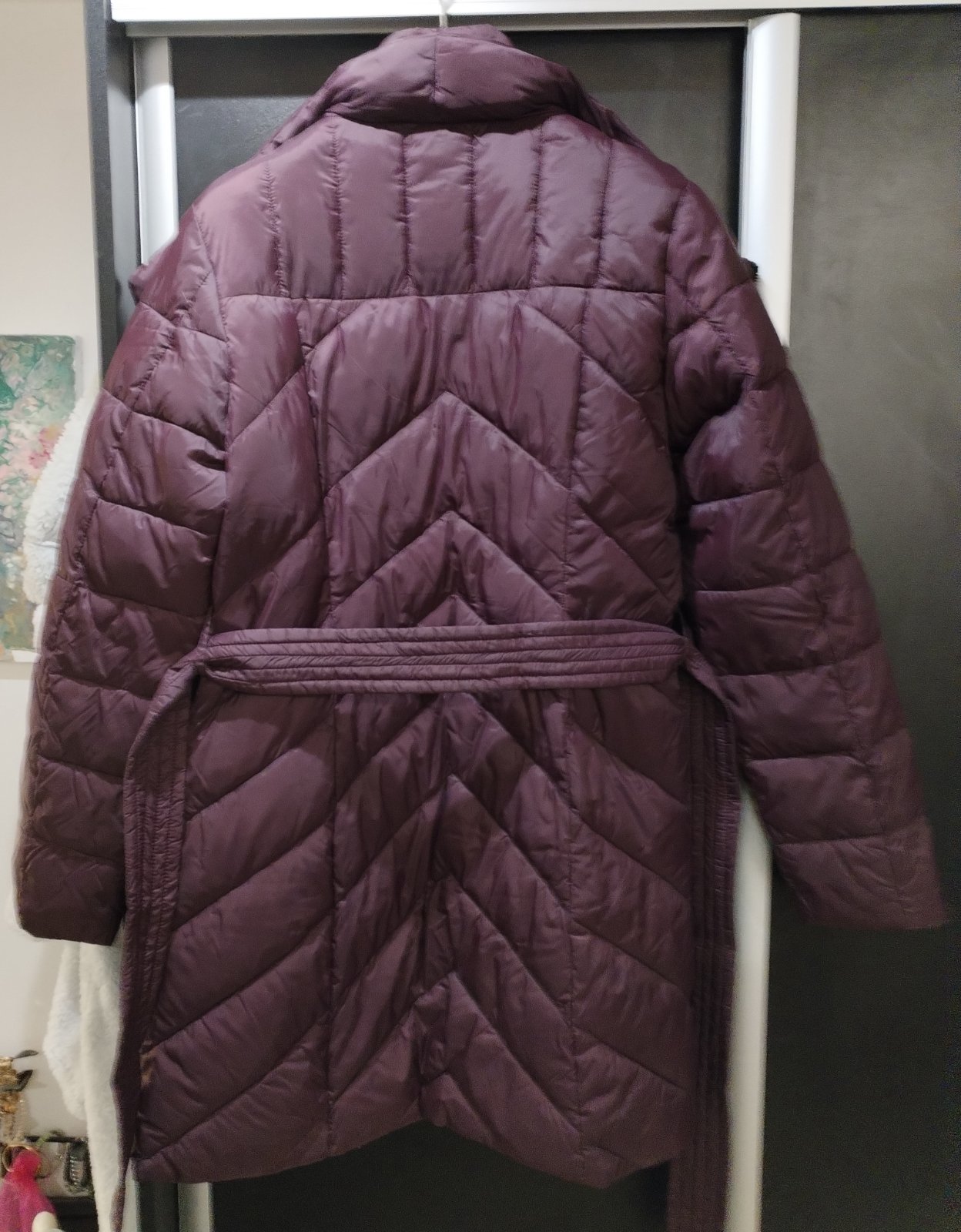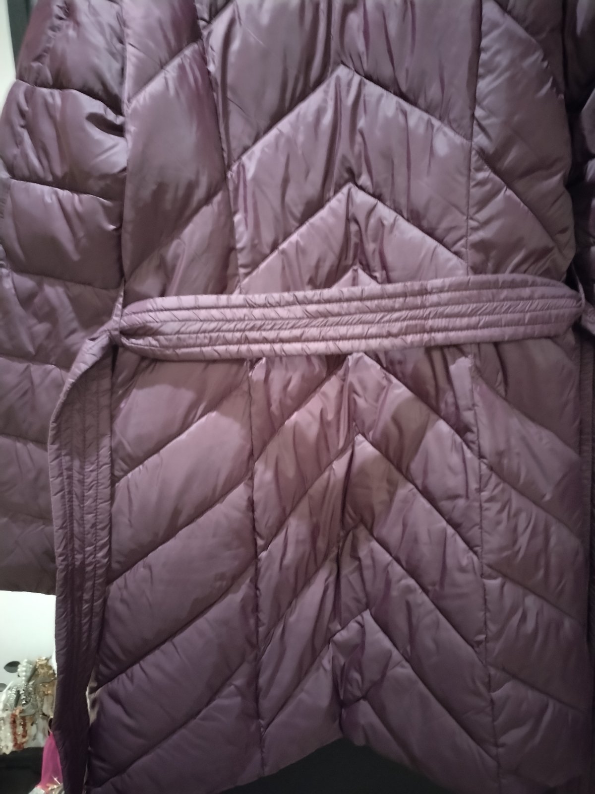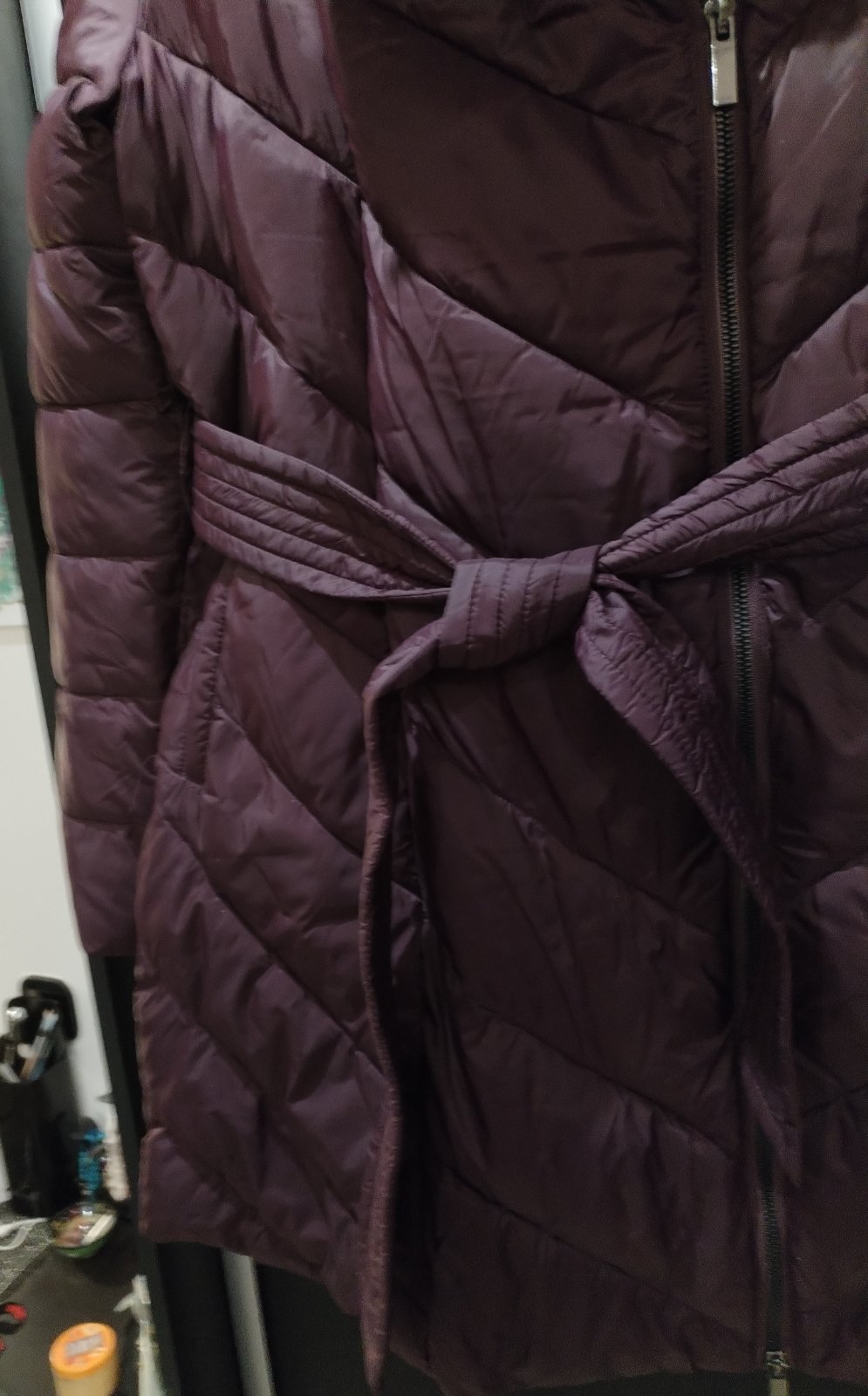 Krásna nenosená zimná značková bunda, s opaskom, teplá, baklažánova farba, s jemným odleskom, dĺžka nad kolená, zn Medicine.