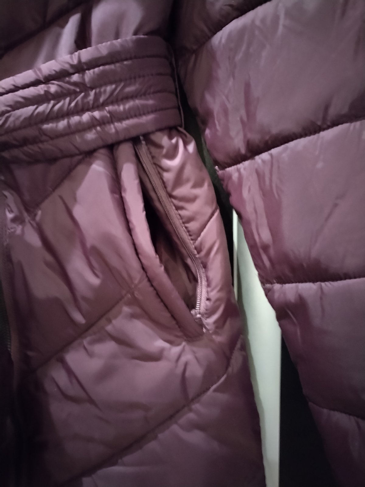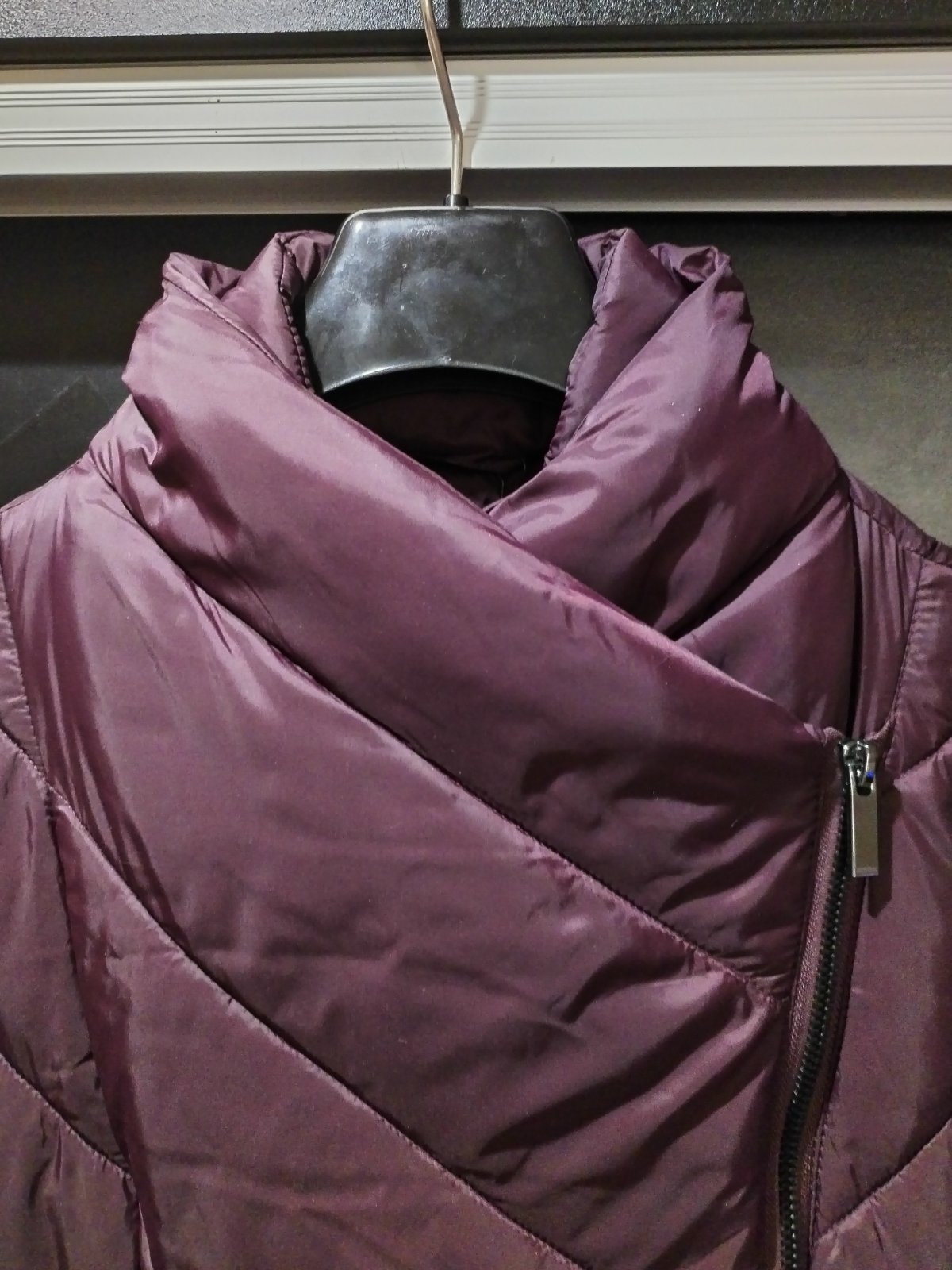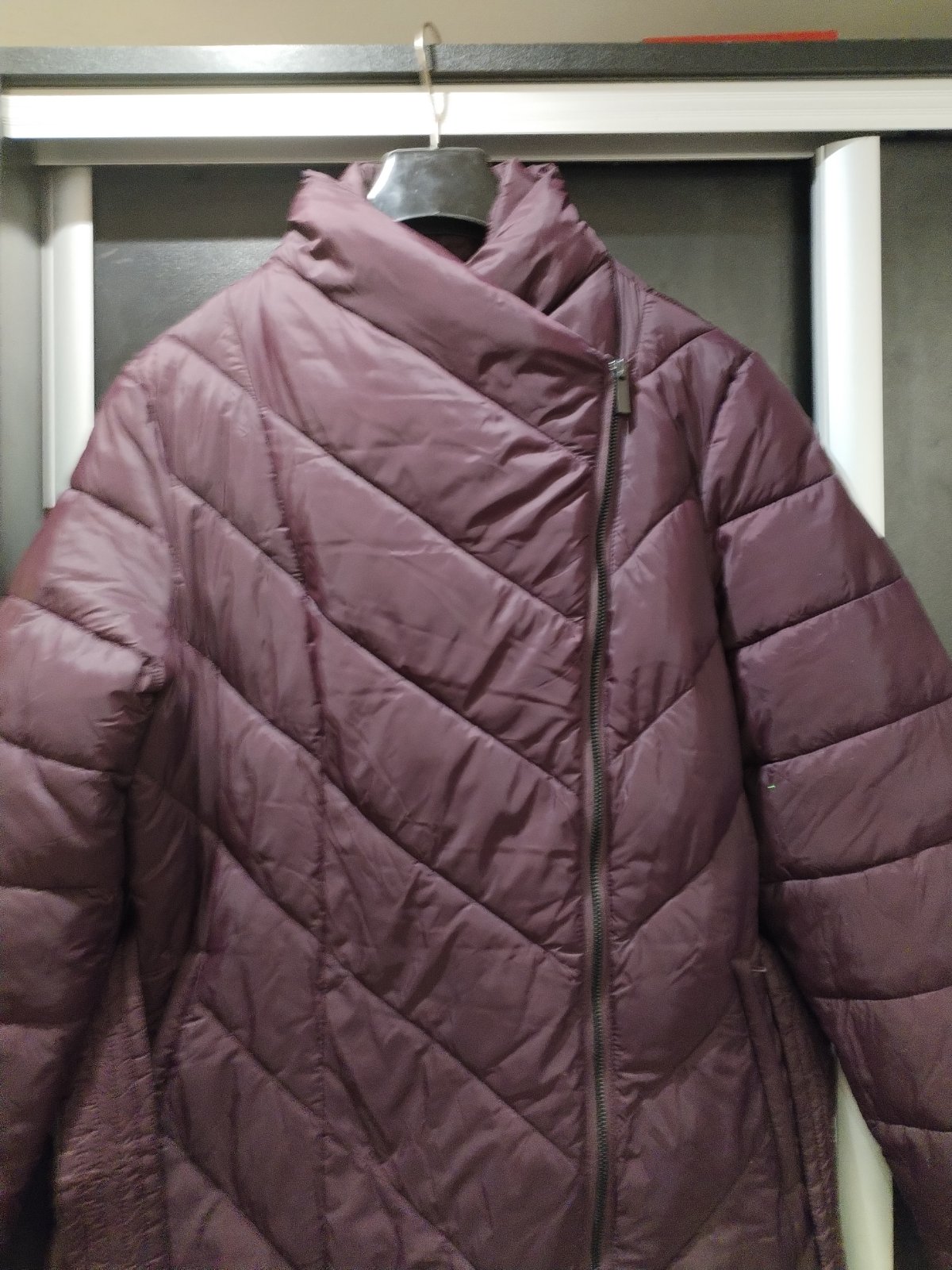 Pohodlná zimná bunda, so zaujímavým zapínaním. Leslý, tmavo fialový materiál. Bez poškodení, sadne aj na menšie XL.