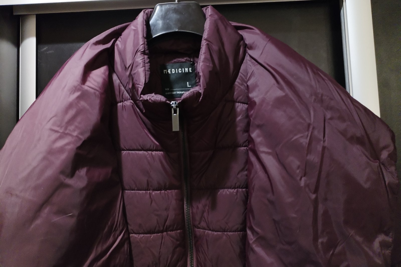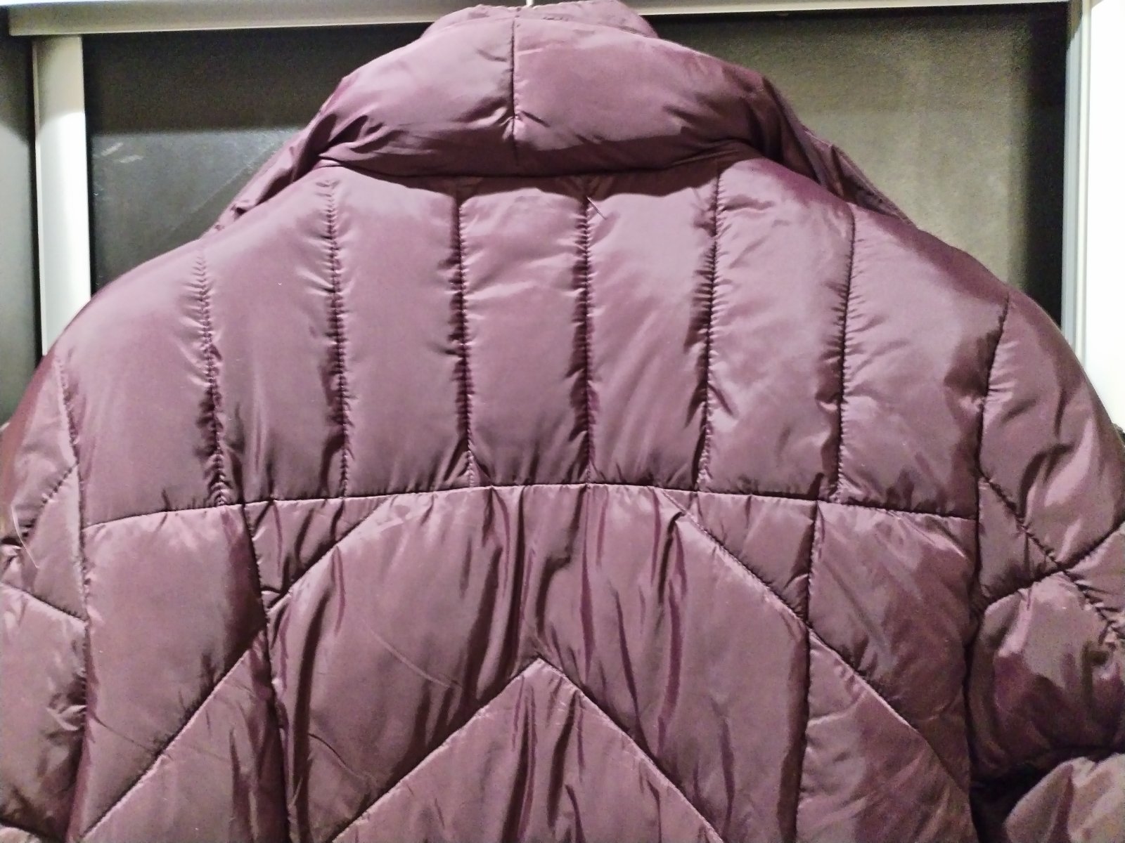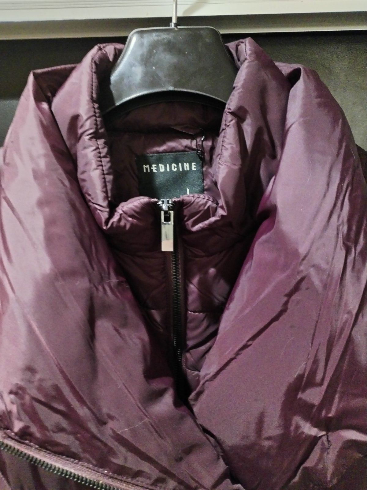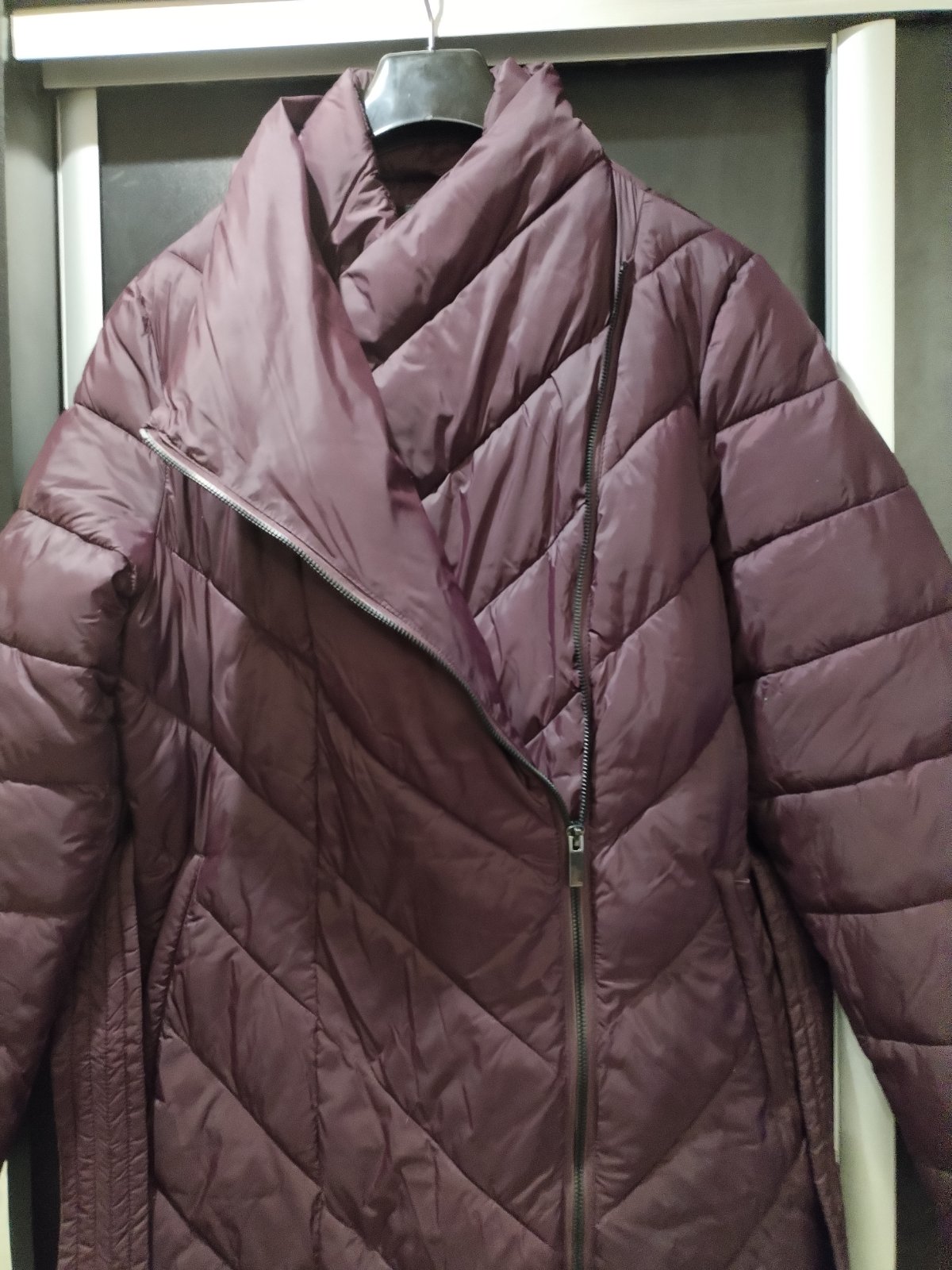 Pohodlná zimná bunda, so zaujímavým zapínaním. Leslý, tmavo fialový materiál. Bez poškodení, sadne aj na menšie XL.