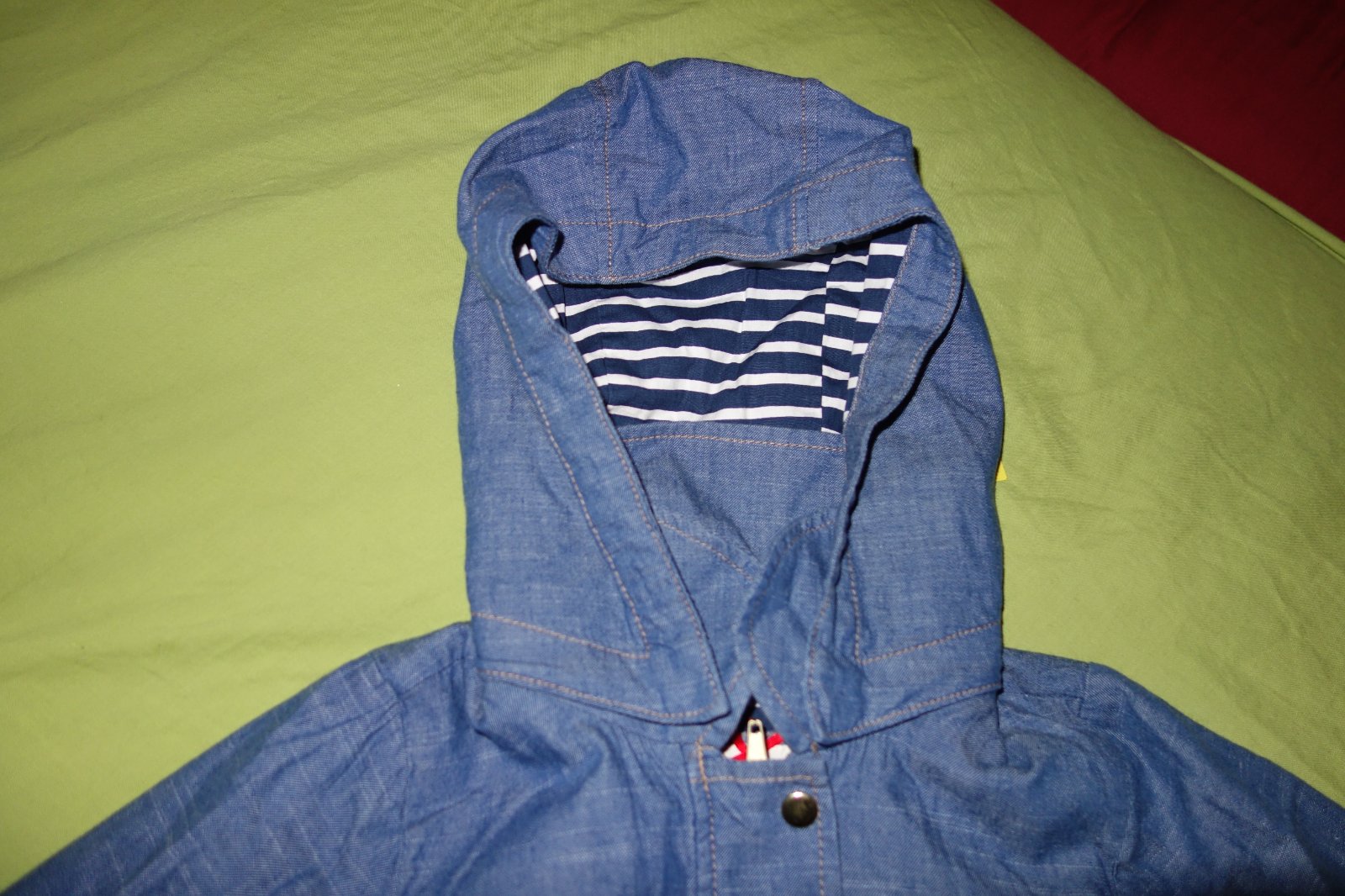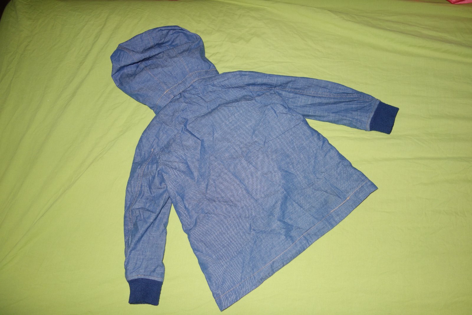 Krasna tenka bundicka vo velmi dobrom stave. Kapucna je na cvocky, da sa odopnut.