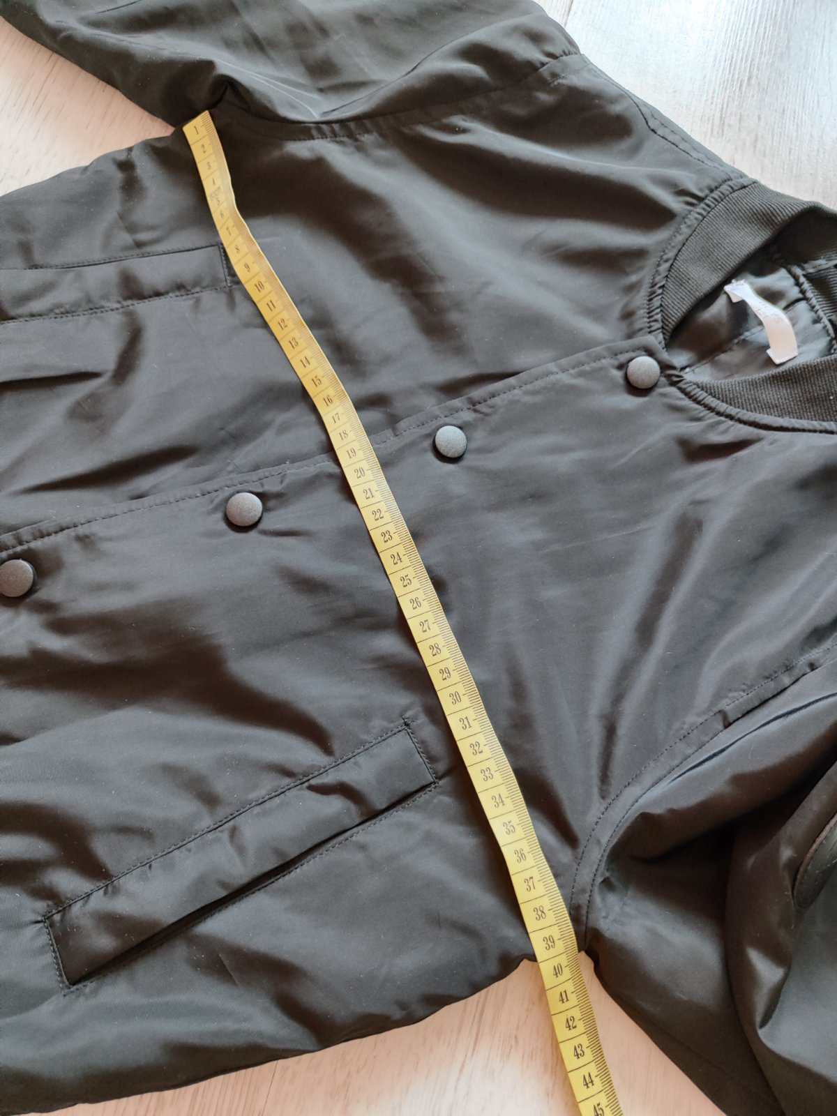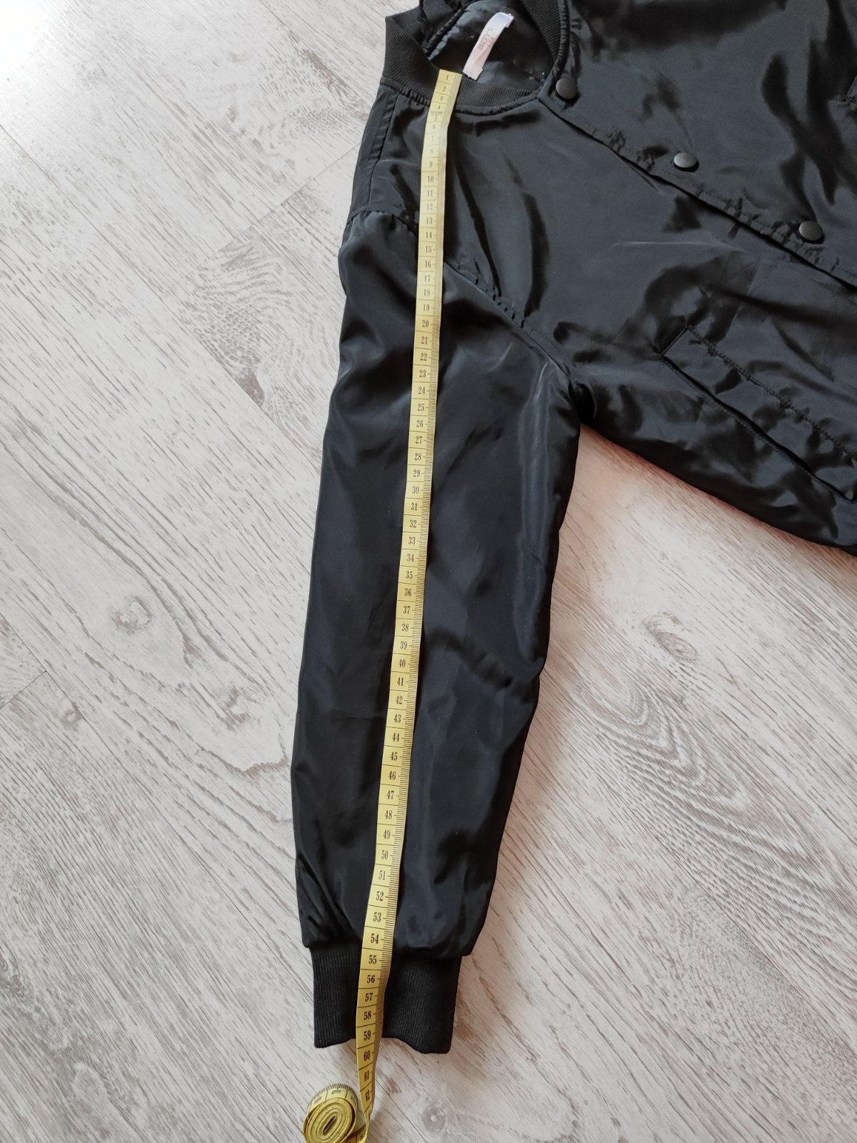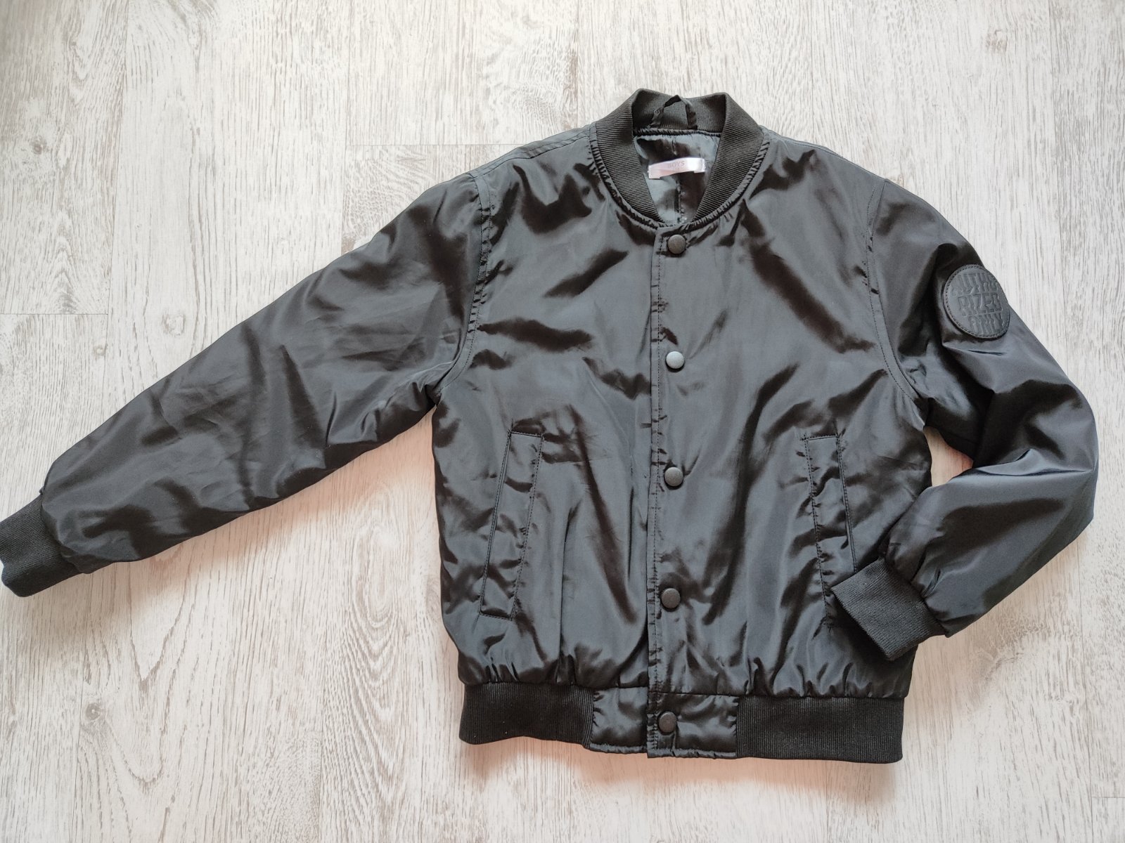 Top stav. Prechodná bunda na štýl bombery. Zapínanie na cvoky. Farba krásna čierna najlepšie je to vidno na fotke kde sú miery rukáva. Veľkosť je uvedená 134 ale dá sa nosiť skôr. U nás 1x oblečená na pár minút.