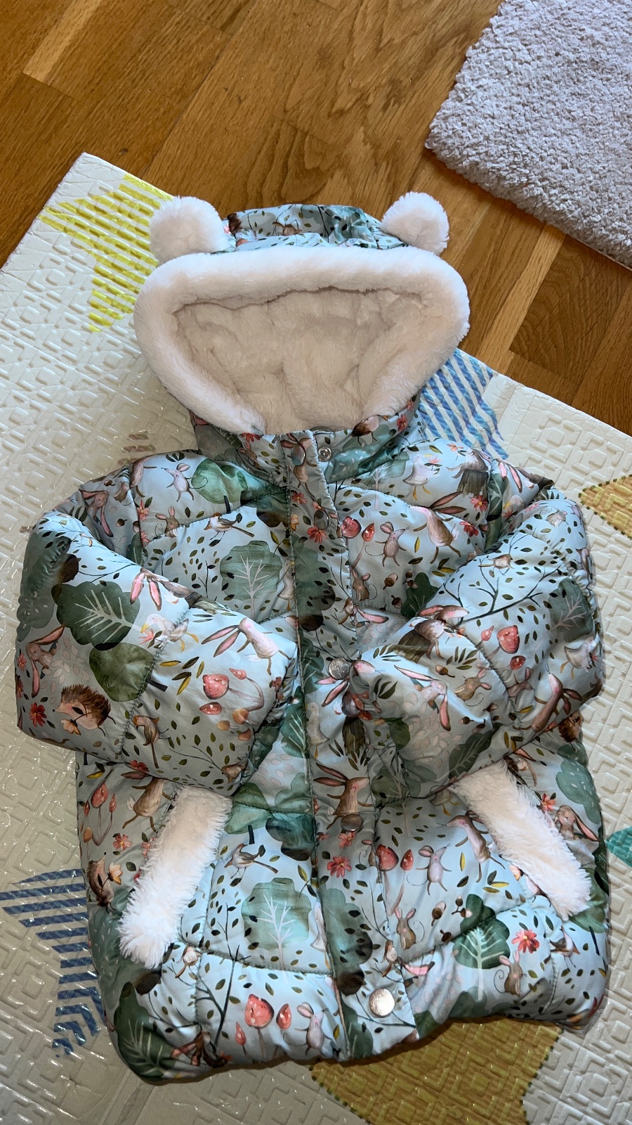 Tepla dievcenska bundicka svetlucko bezovej farby (skoro biela). Na koncoch rukava stahovacie manzety, na vreckach maslicky. Kapuca nie je snimatelna. Bezne znamky nosenia, dobry zachovaly stav - f...