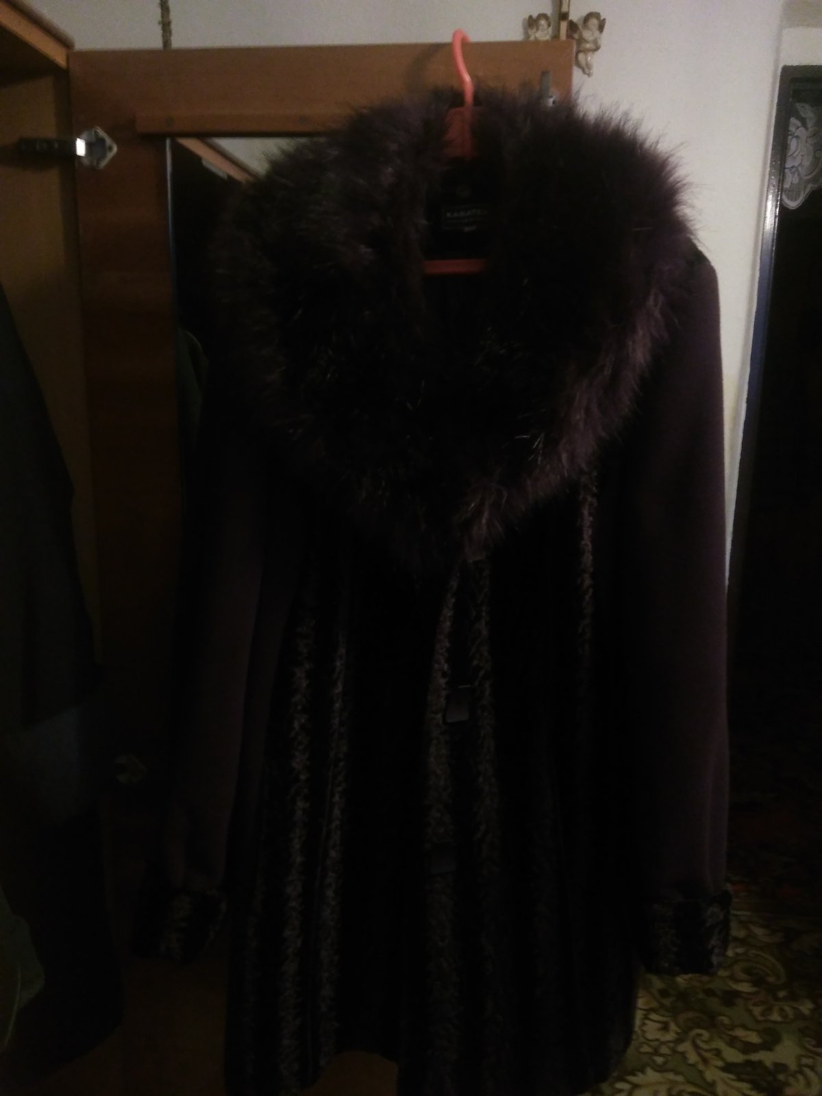 Predám dámsky kožuch, veľkosť 48. Kožený základ, lemujúca kožušina umelá. Dĺžka 111 cm. Cena: 7 €