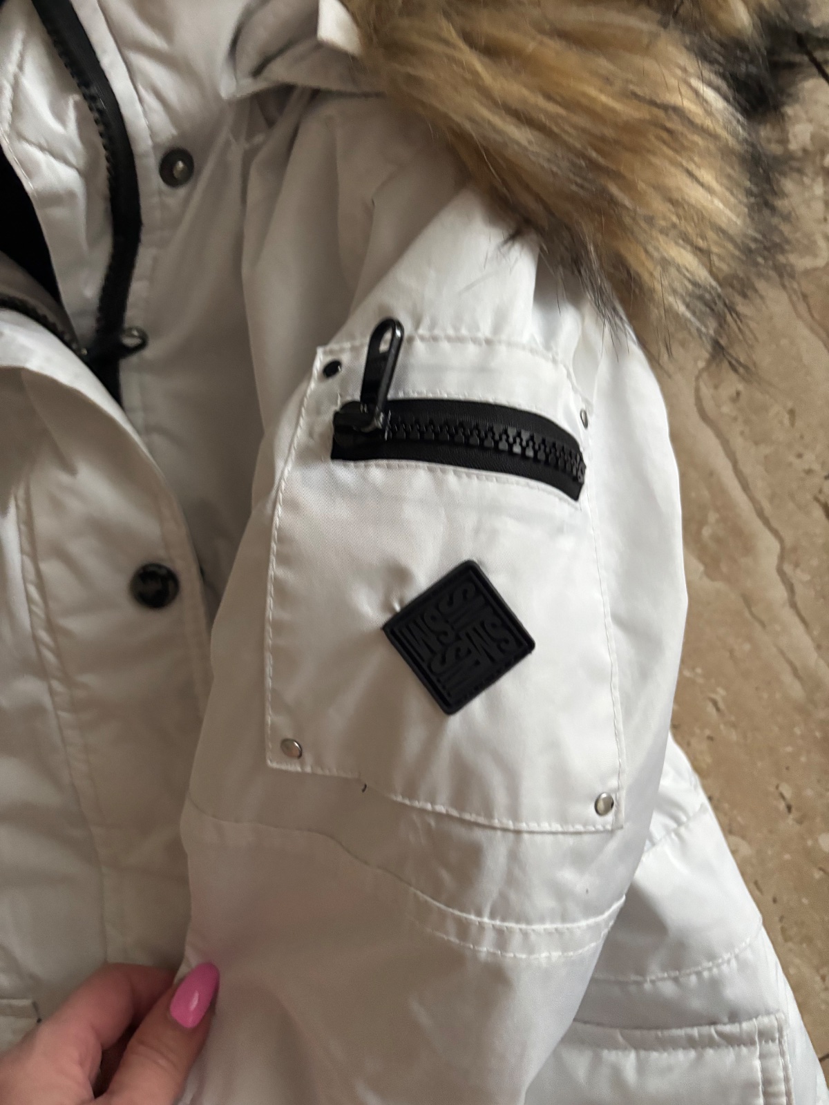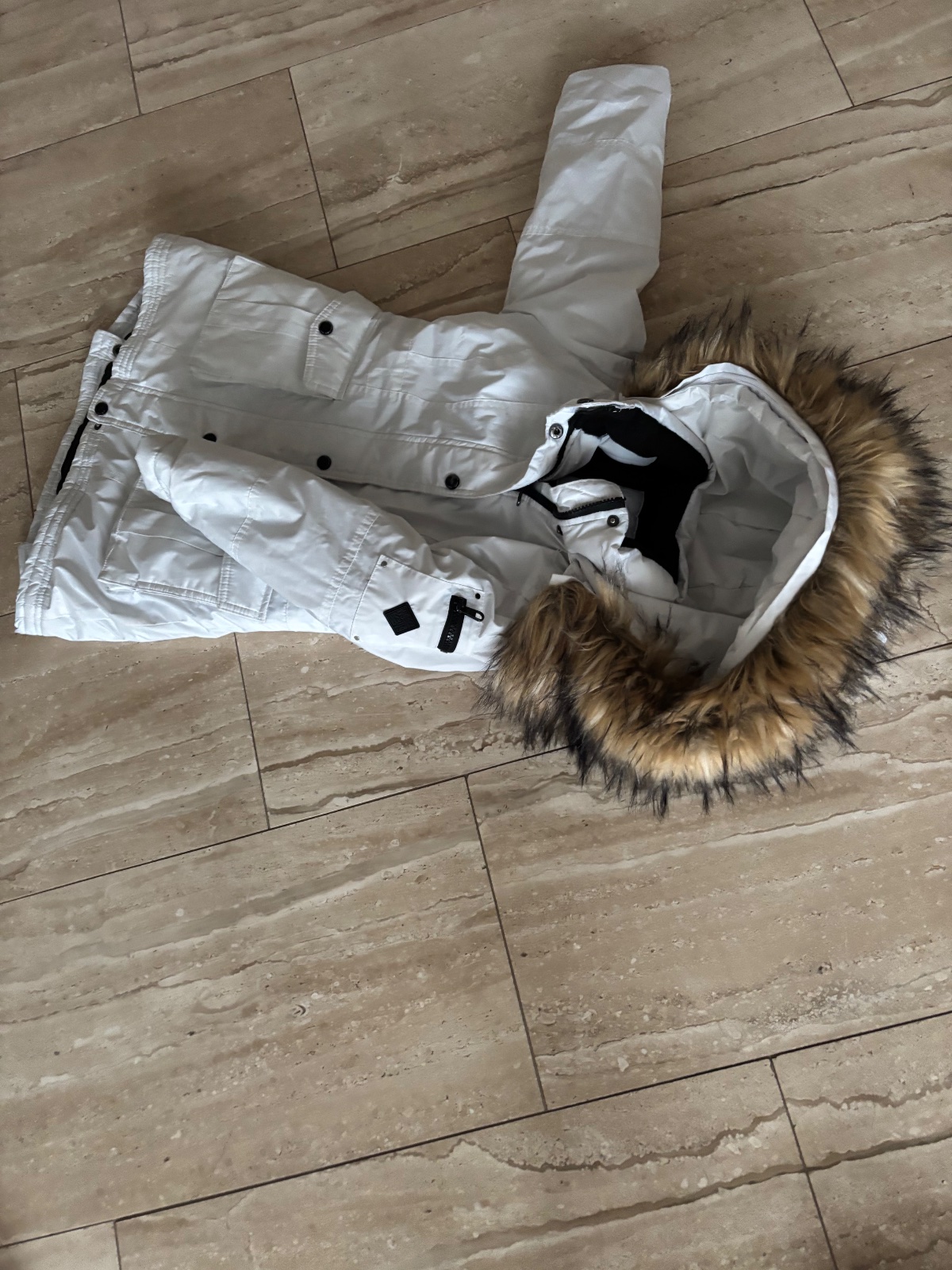 Málo ponosená bunda s kapucňou v bielej farbe s jemným nádychom do strieborna. Zapínanie na cvokové gombíky, vpredu sú po bokoch vrecká na ruky. V super stave, bez poškodení. Uvedená veľkosť 7 - 8...