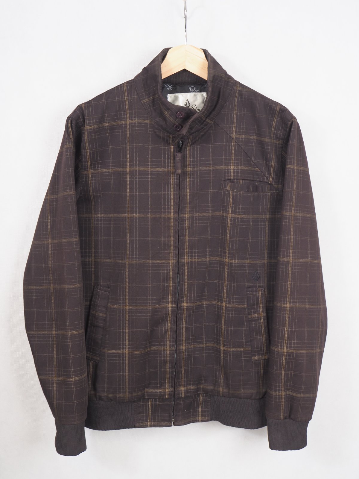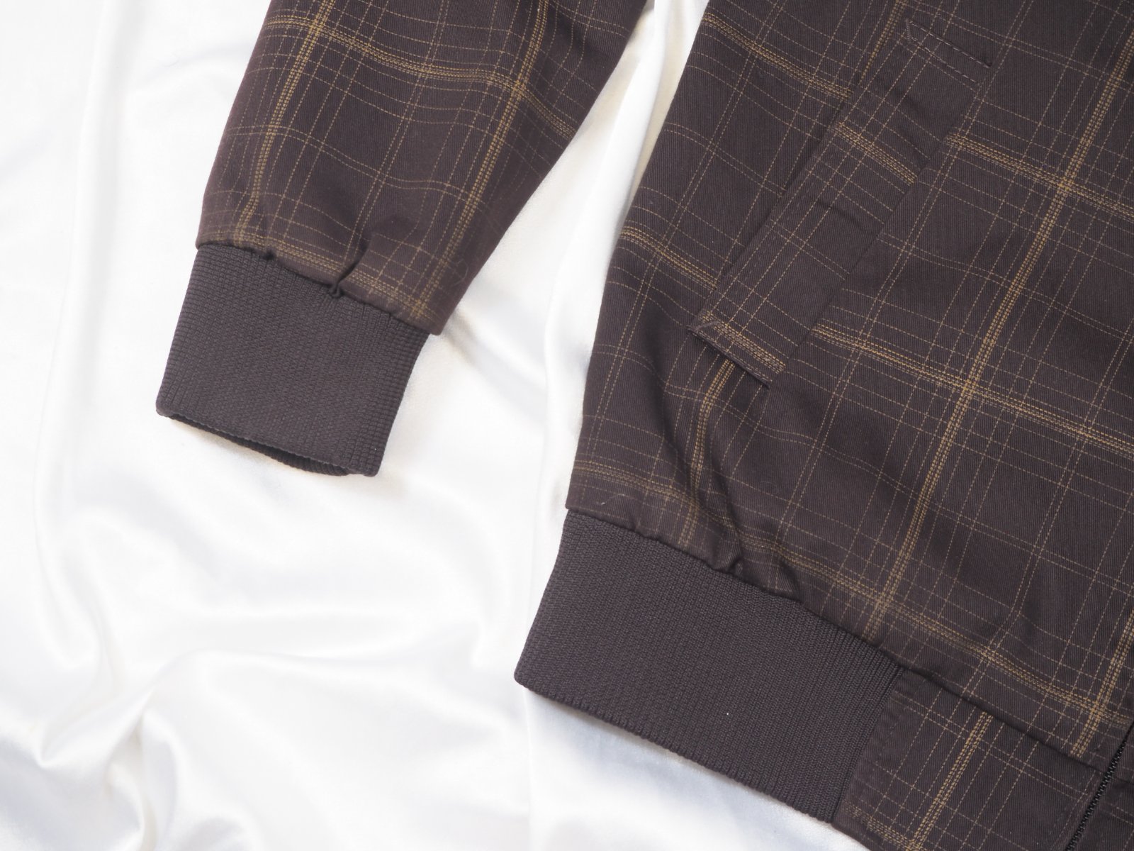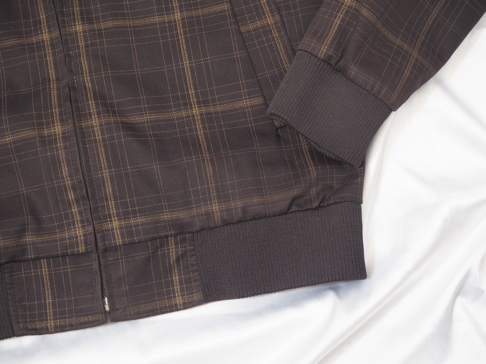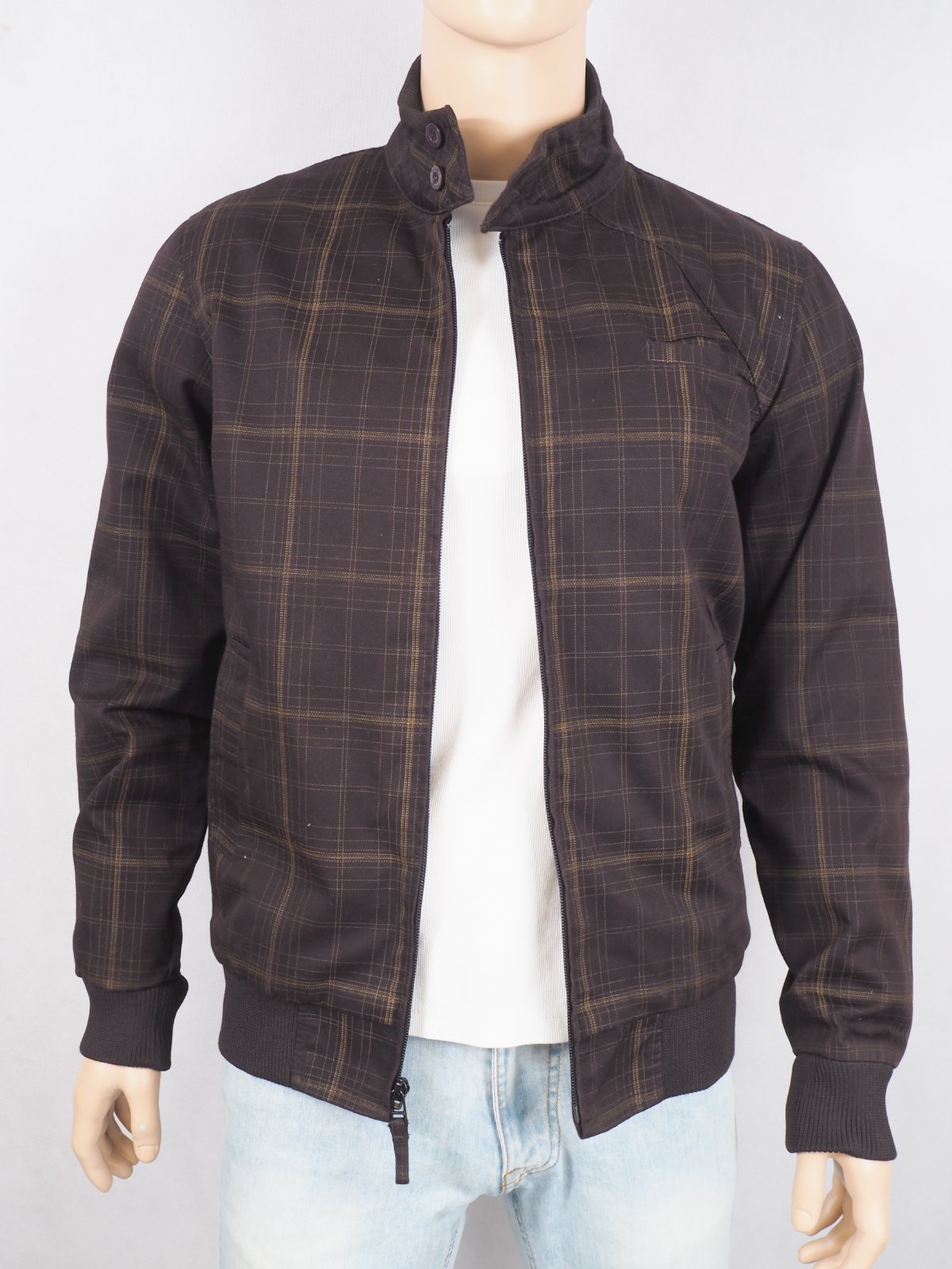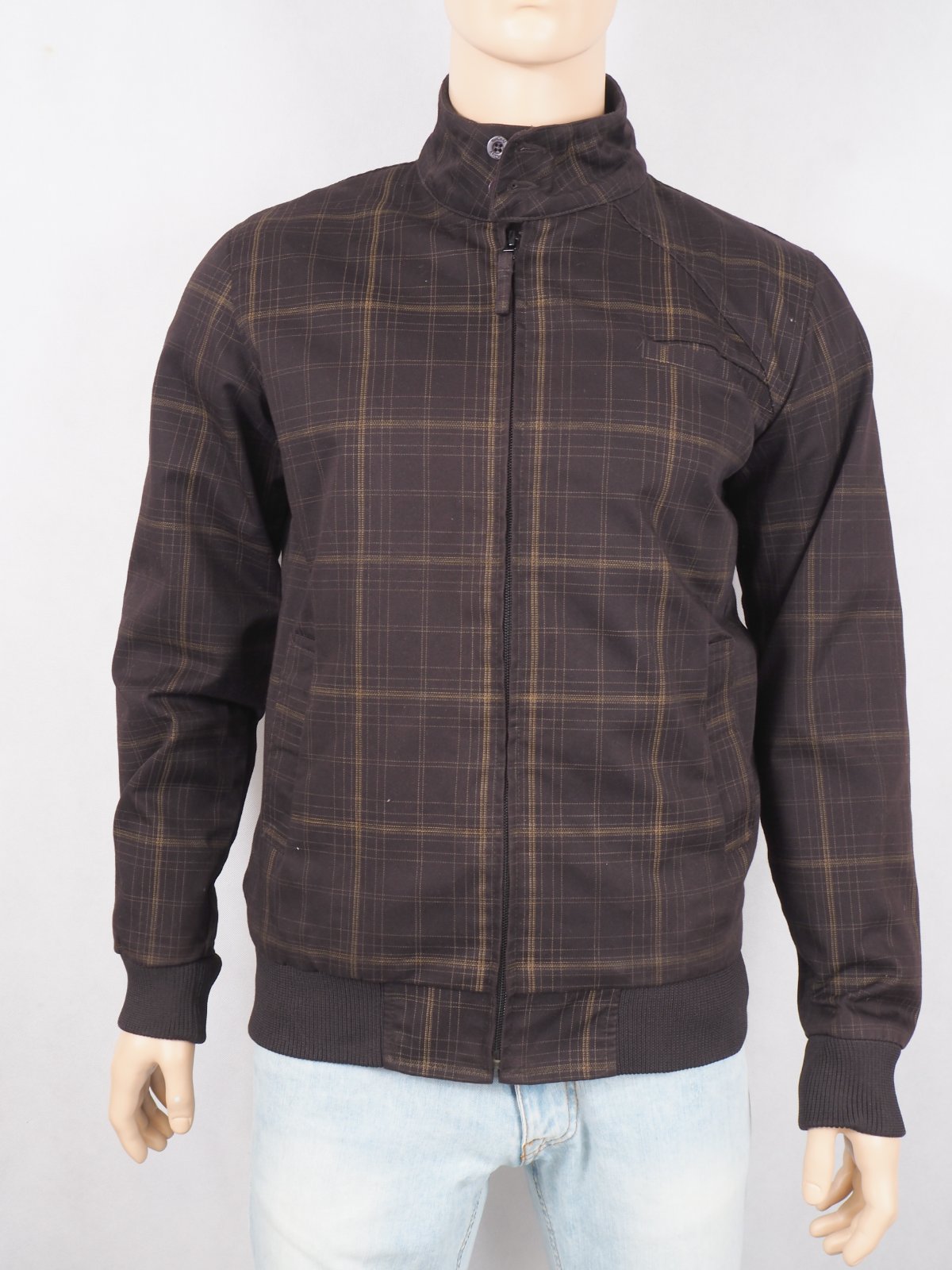 Luxusná prechodná bunda tmavohnedej farby, s jemným káro vzorom, zapínanie na zips, patentové rukávy, materiál 65% polyester, 35% bavlna, super stav, ako nová.