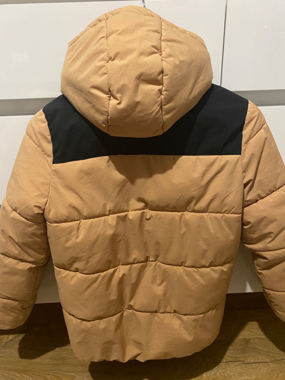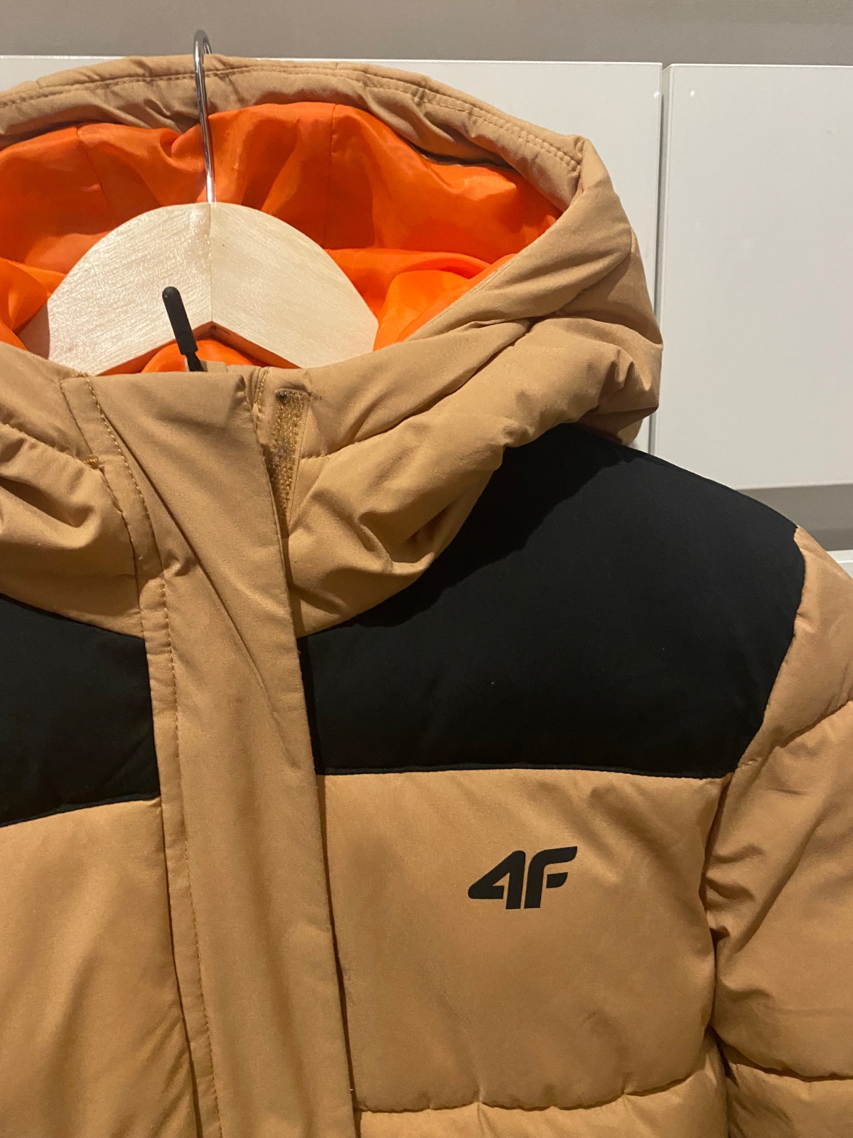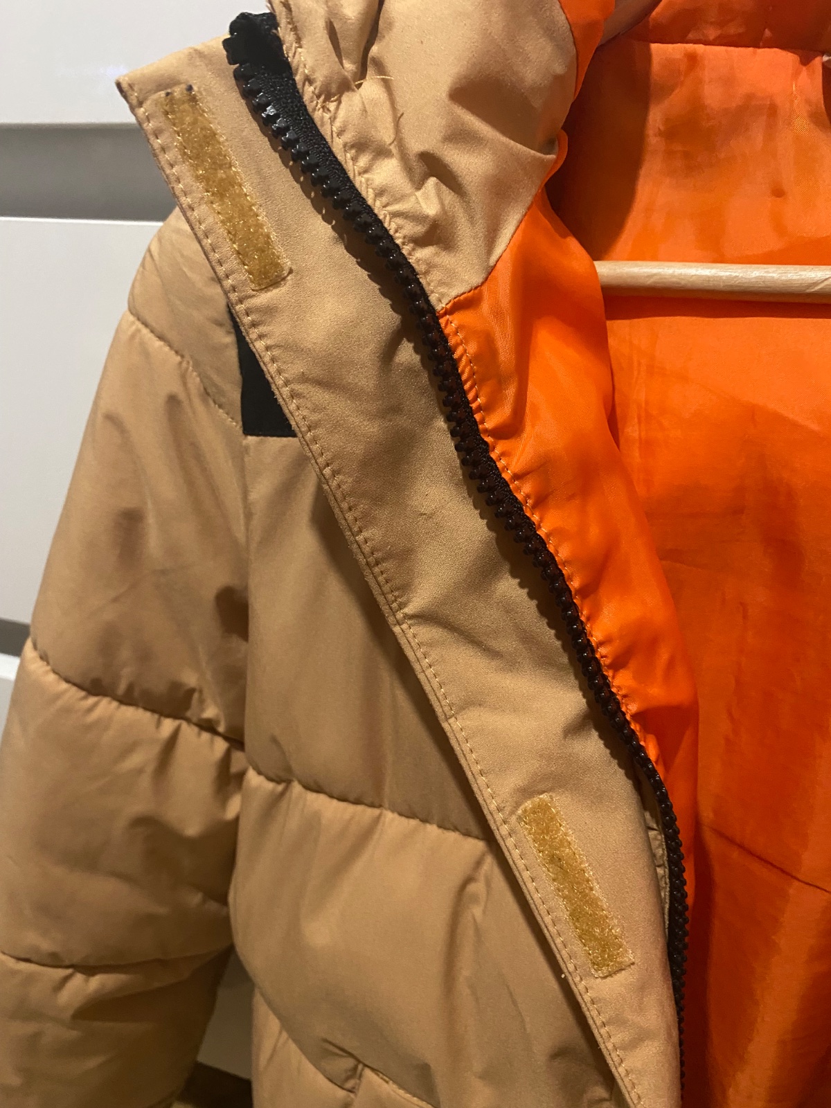 Zimná bunda farba je tehlová, na chrbáte má trocha posunutú vnútornú náplň.