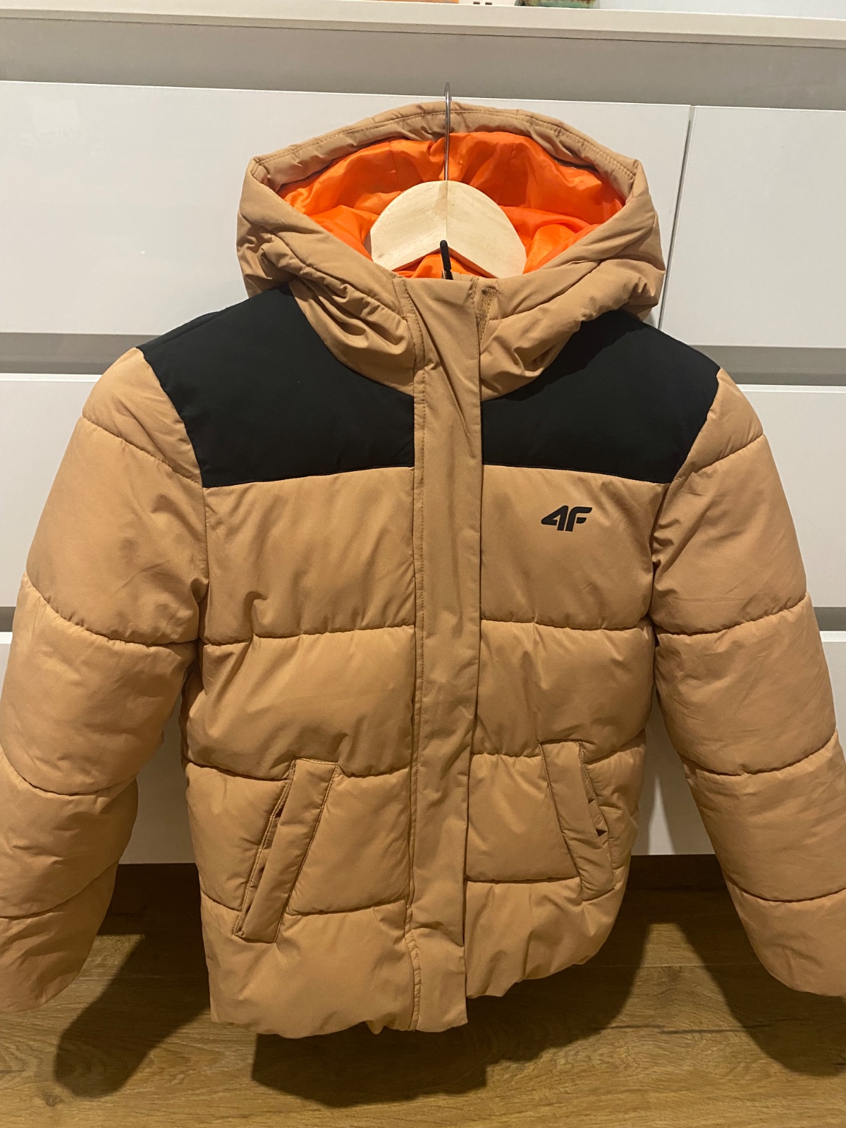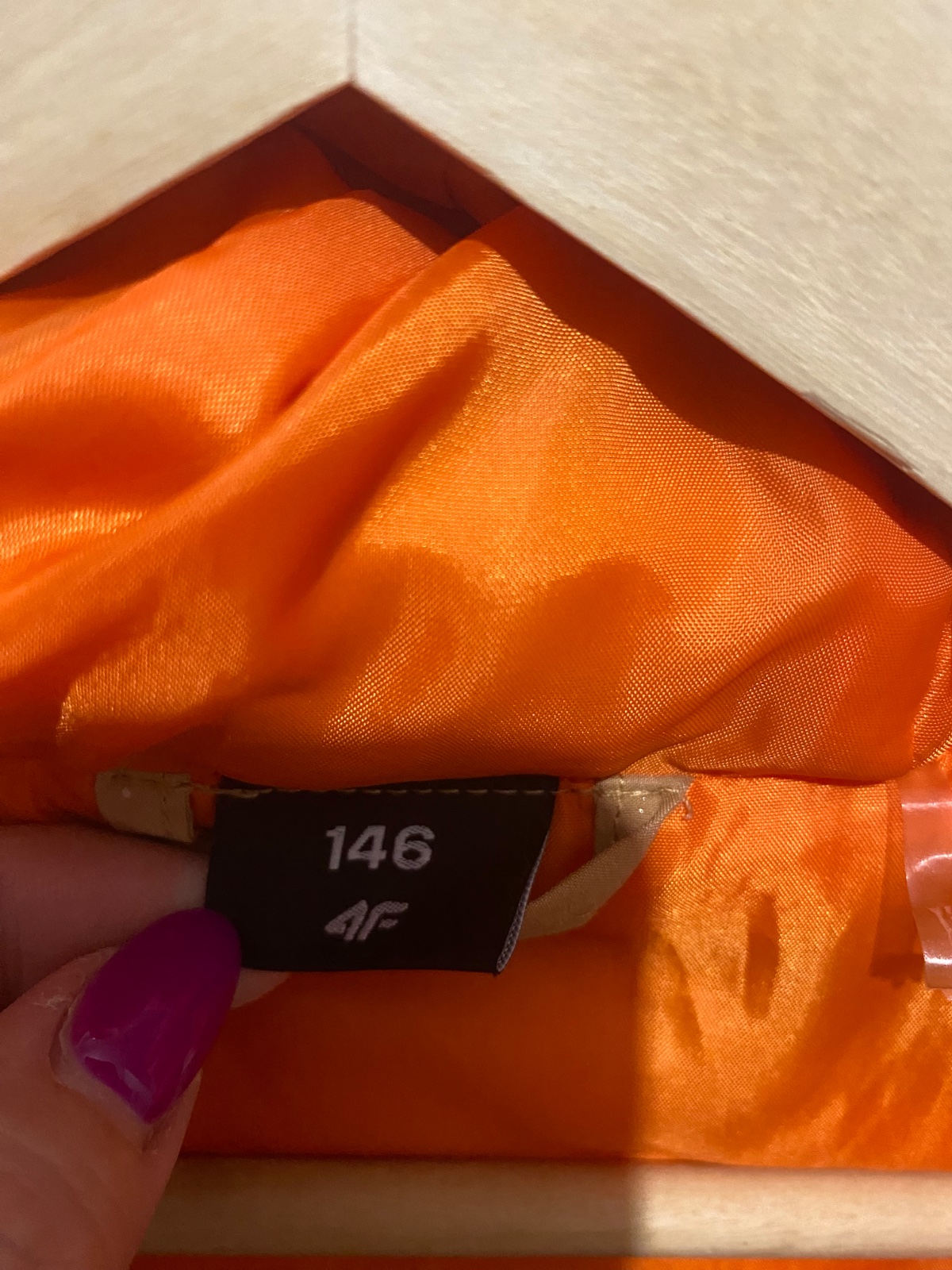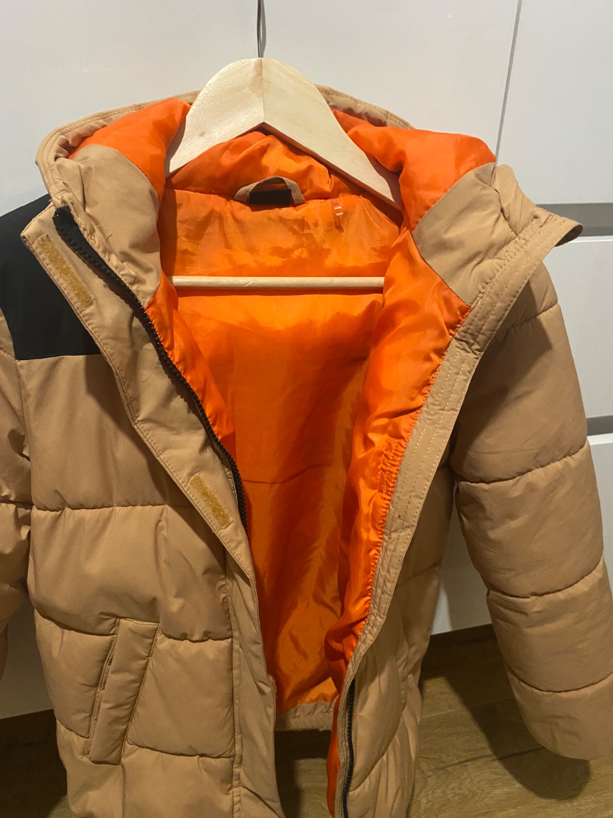Zimná bunda farba je tehlová, na chrbáte má trocha posunutú vnútornú náplň.