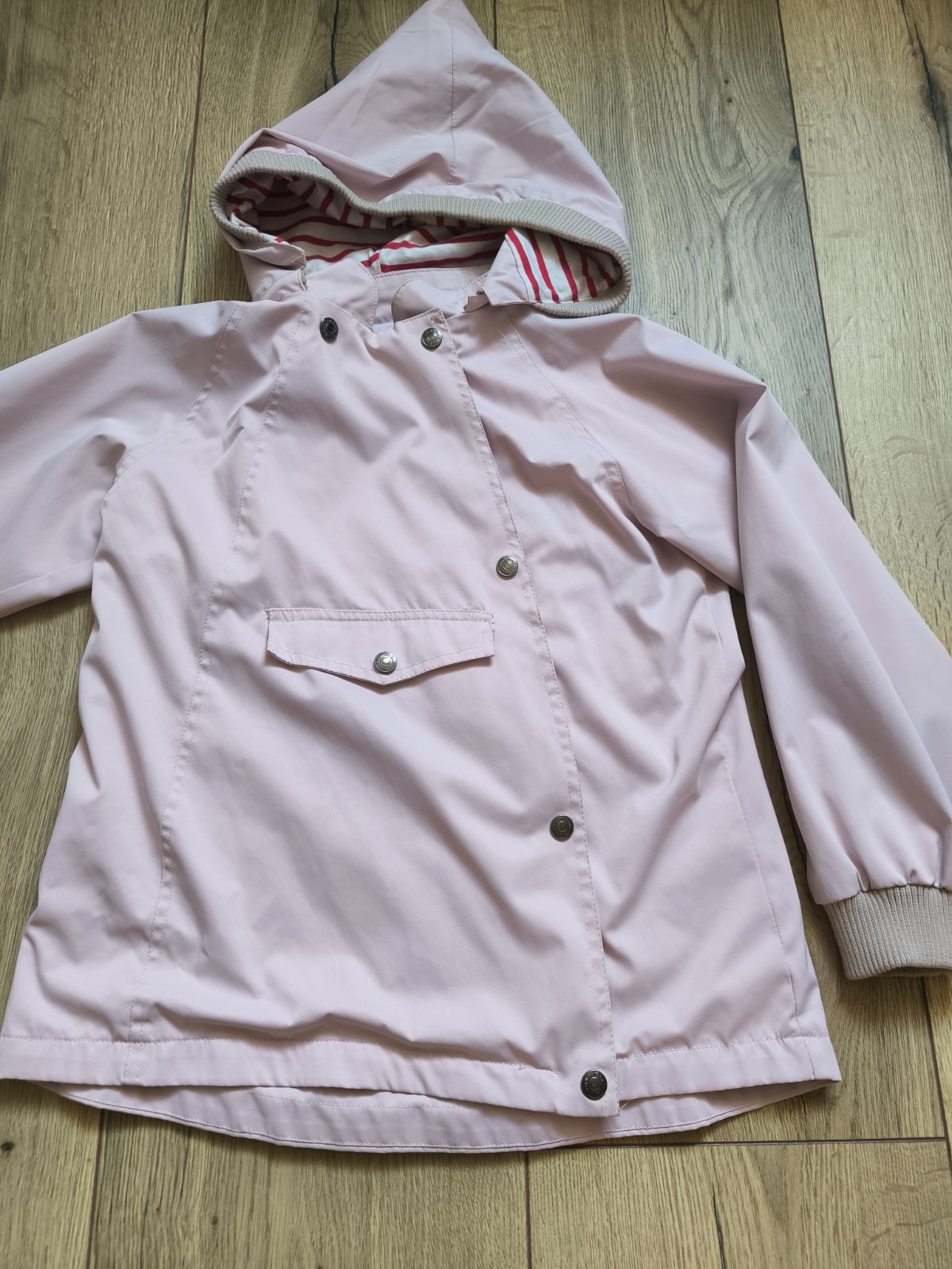 Nepremokavá jarná bundička s vreckom na predu, kapucňou,málinko nosenia. Veľkosť 134,kupovania v Poľsku....15€ s poštovným.