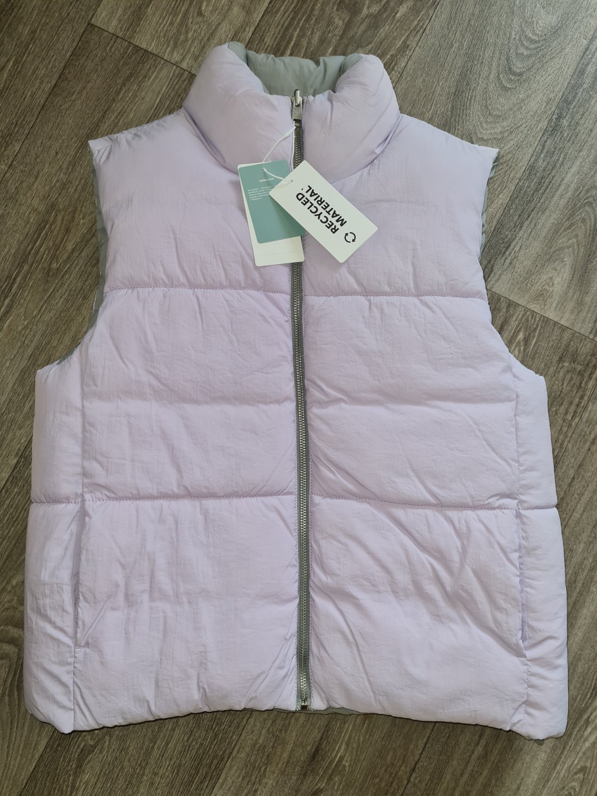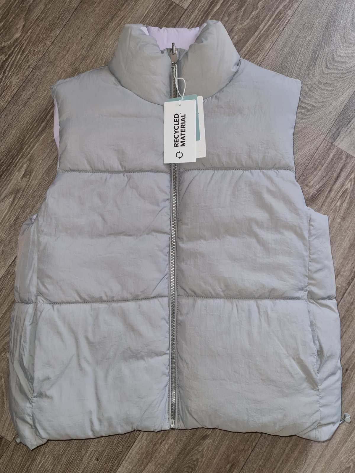 Predám úplne novú nenosenu obojstrannú vestu.Z jednej strany bledofialova,z druhej sivá.S vreckami