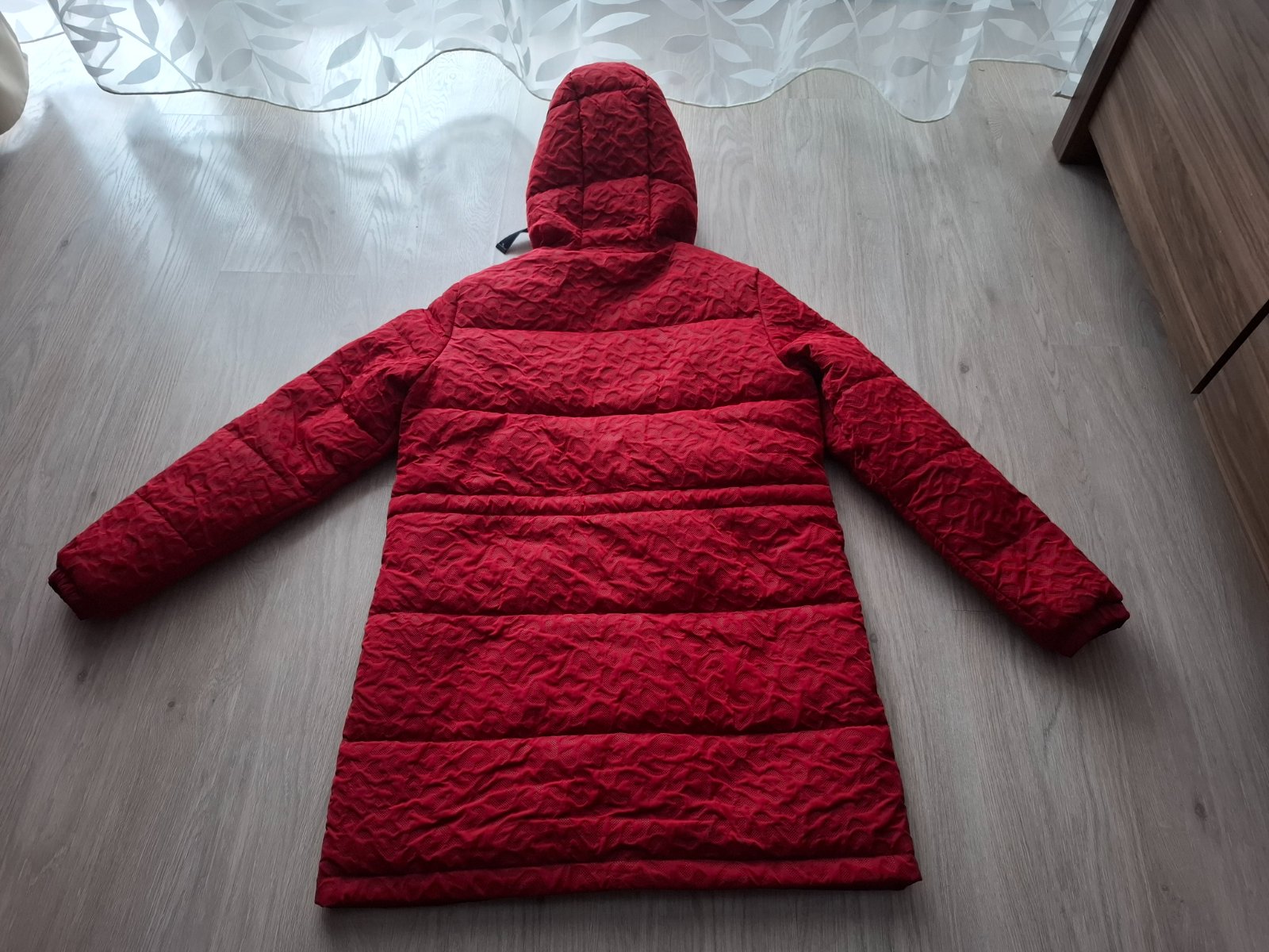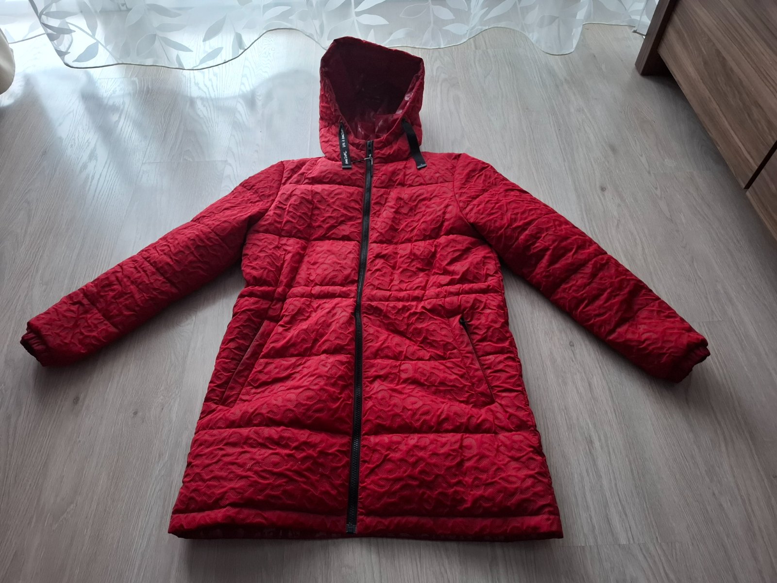Krásna zimná bunda v krásnej bordovo červenej farbe. Farba je tmavšia ešte krajšia v skutočnosti. Veľmi pekný stav. V páse gumičky na stiahnutie