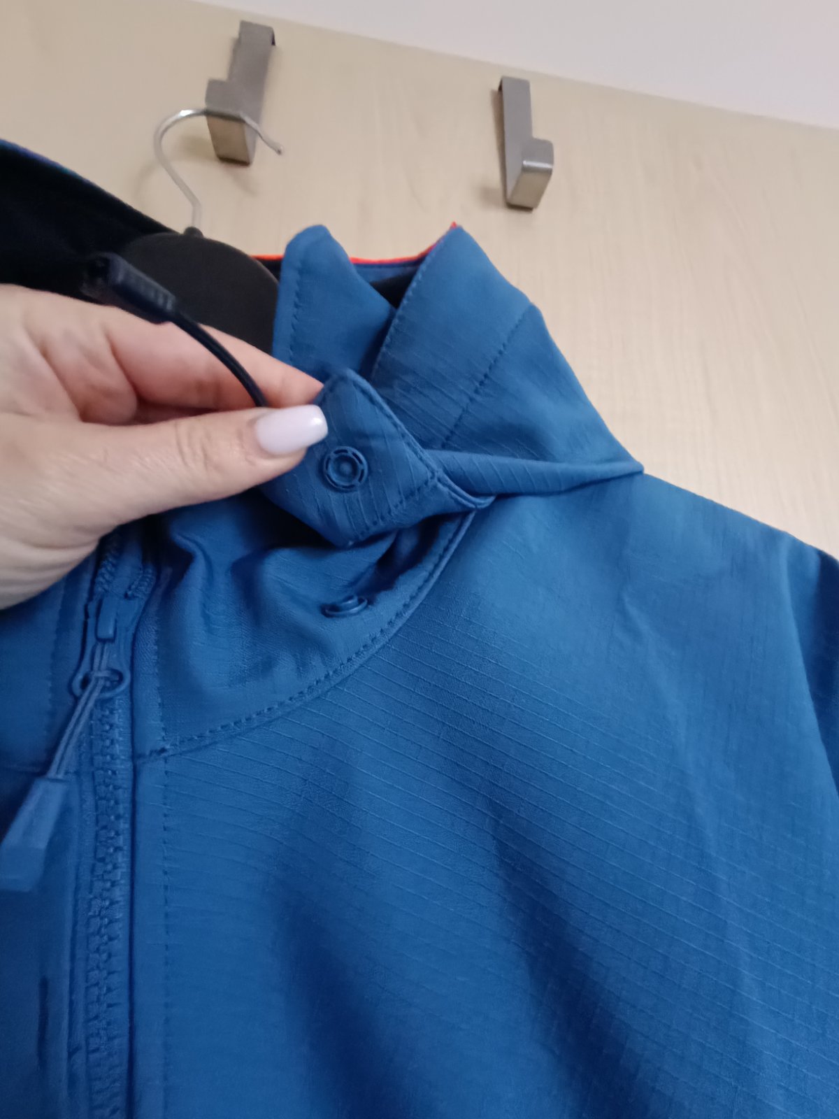 Odnímateľná a nastaviteľná kapucňa, spodok (sťahovacia šnúrka) a rukávy (suchý zips).