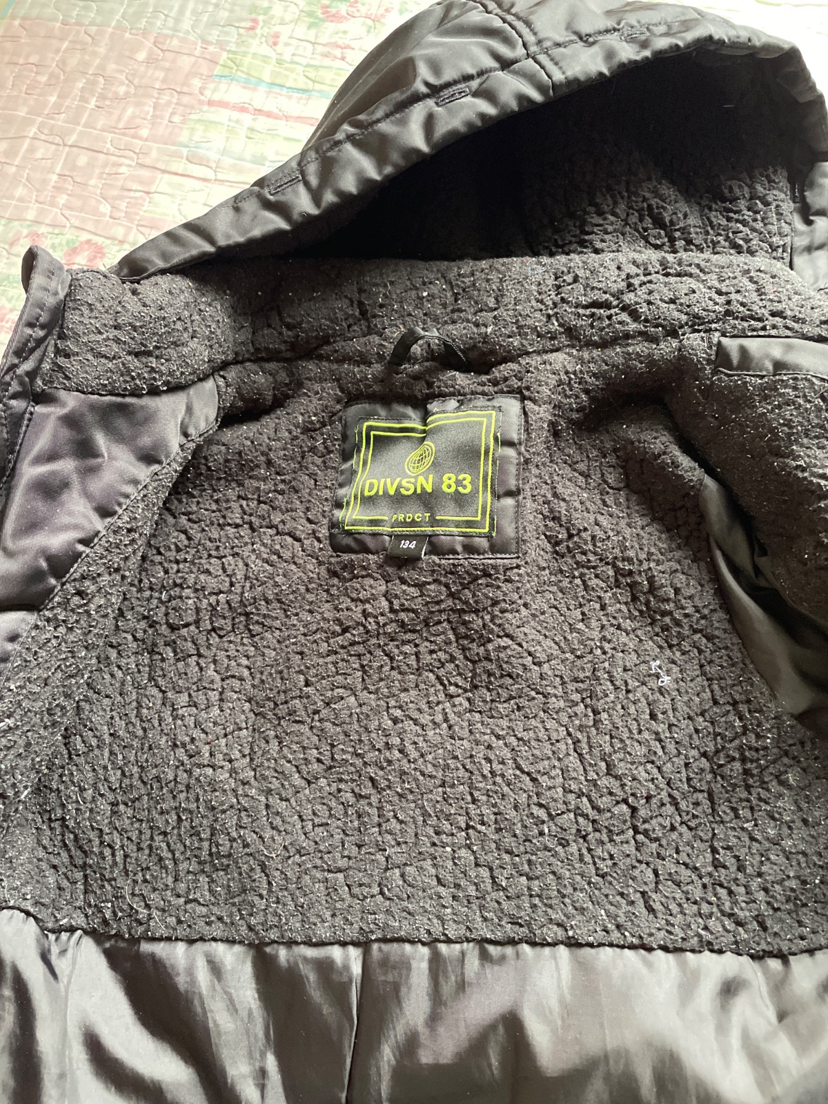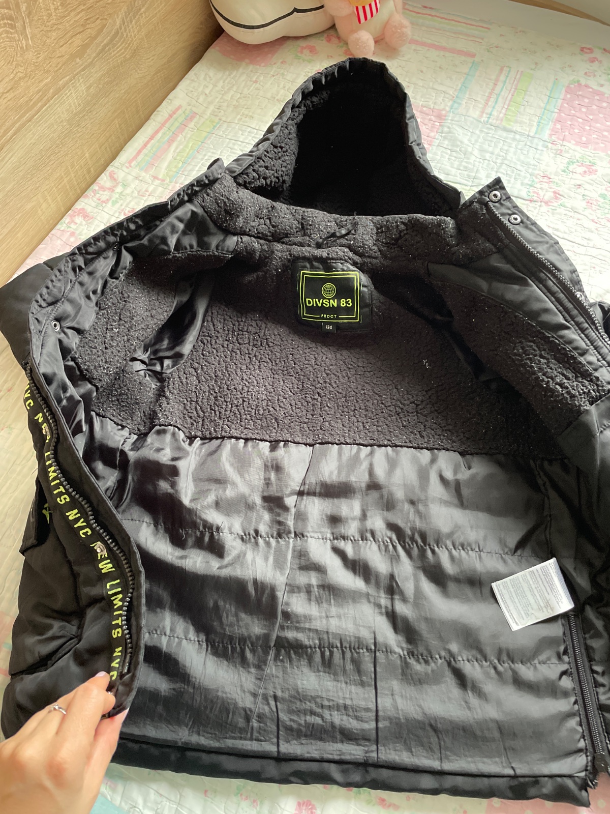 Čierna jemne lesklá extra tepla bunda na zimu,kombinovaná krikľavým gombíkmi a nápisom pri zipse,ktorý sa prekrýva priklopkou.Ma mnoho vreciek,vonkajších a jedno vnútorne.Rukav je ukončený teplým patentom.Je to dosť tepla bunda.Synovi sa uvoľnila jedna nitka na rukáve v mieste šitia,takže som to musela ešte raz presiť raz.Je to z vnútornej strany,nepoznať to-Vid foto. Vnútorná tepla časť je mierne ožmolkovaná,ale nemá vplyv na kvalitu.Veľmi dobrá budnicka,kúpila by som ju znovu.Frajerska a účelová ❄️⛄️🌬️