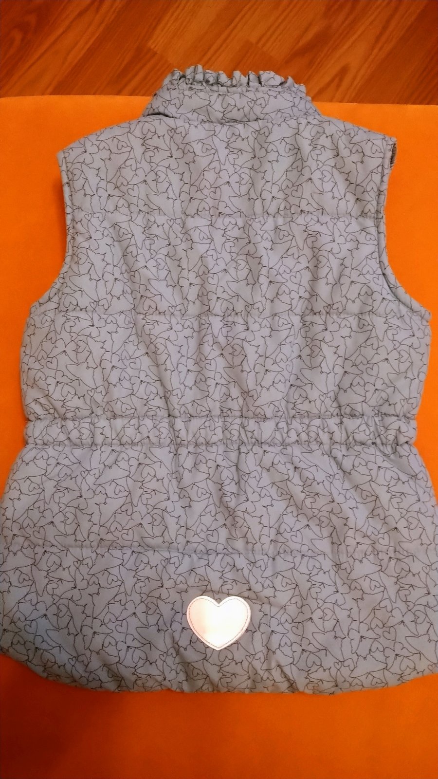 Top stav - bledomodrá až svetlotyrkysová zateplená vesta s potlačou motýlikov je vhodná pre malú cca 5-6 ročnú parádnicu. Na zadnej časti je umiestnený reflexný prvok, srdiečko.