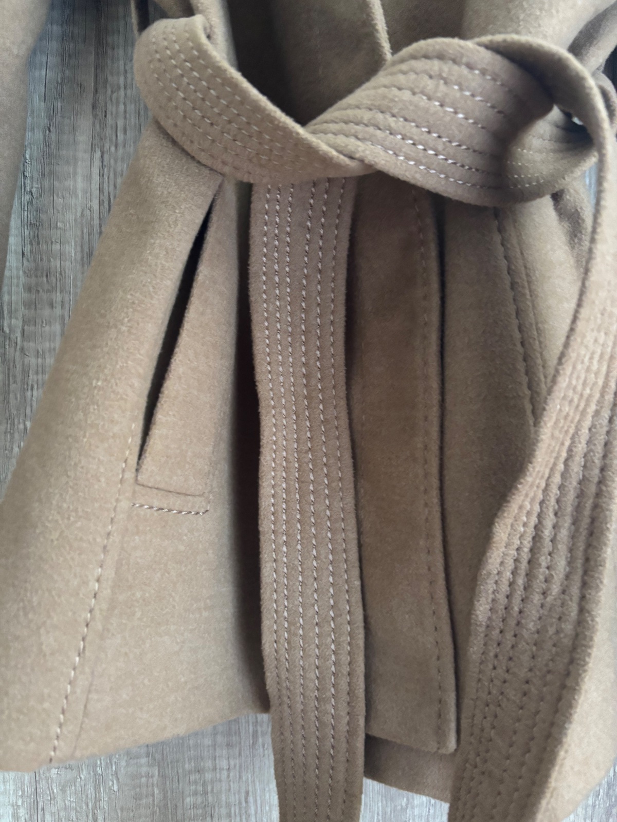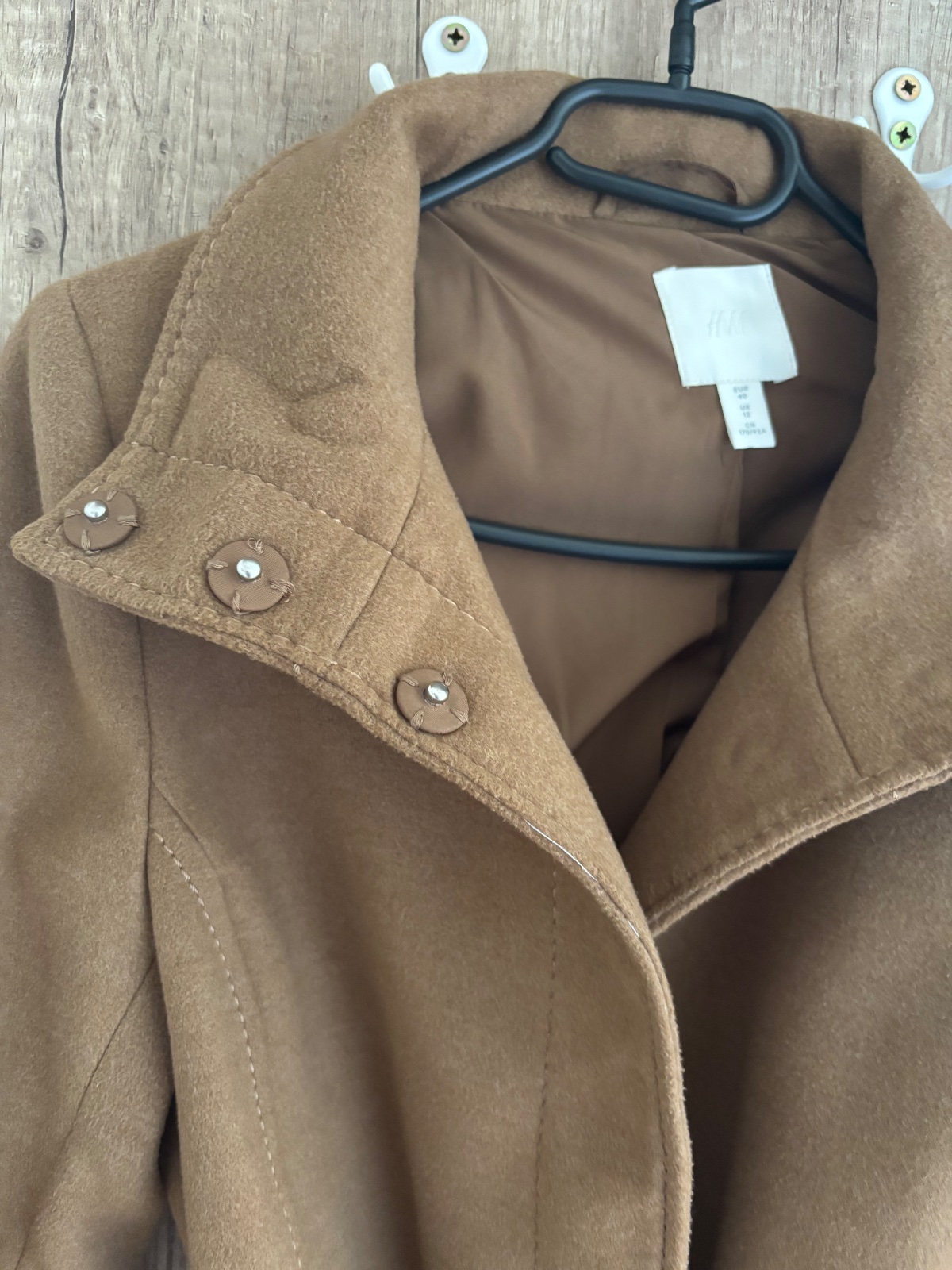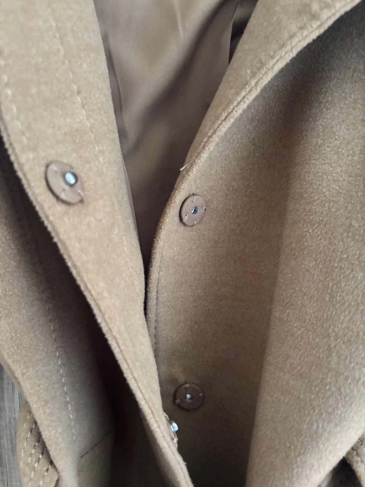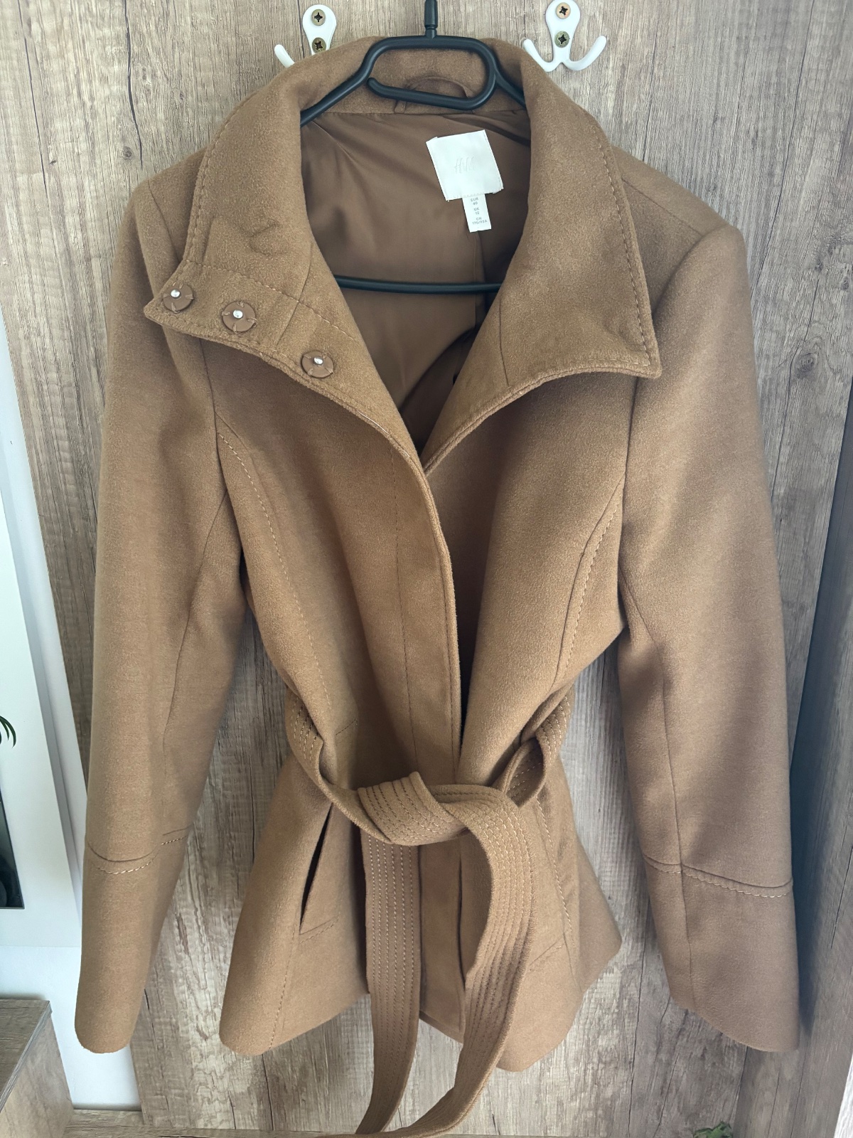 Kabát je nenoseny, oblečený raz. Zapínanie ma také cvočky a opasok. Dĺžka je jemne po zadok