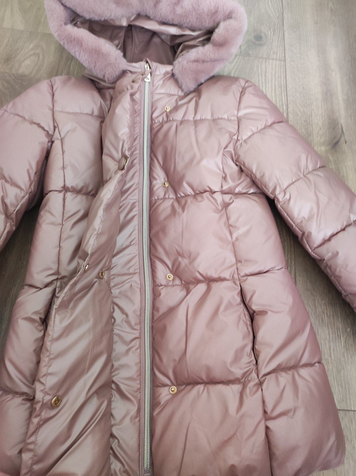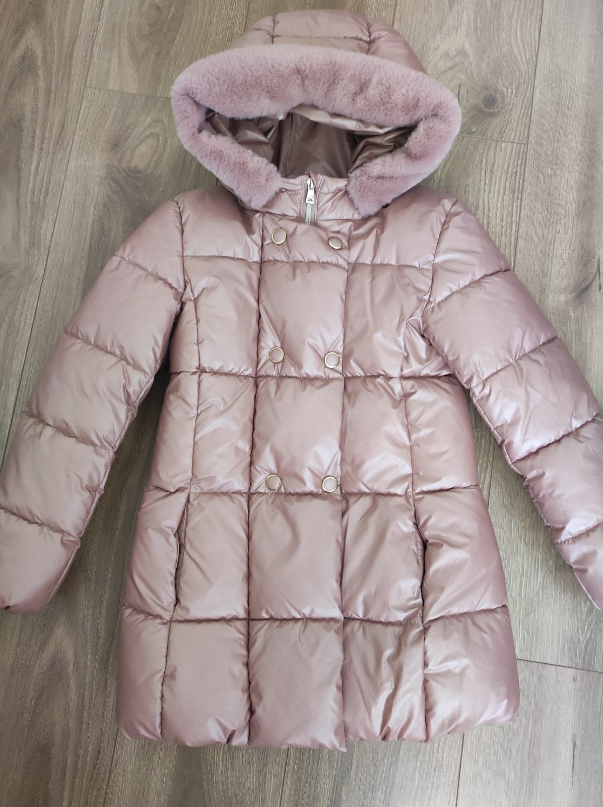 Poštovné v cene. Dievčenská zimná bundička oblečená len 1x - pri skúšaní. Je obojstranná, jedna strana je šušťákovina a druhá strana je " huňatý kožúštek ". Kapucňa sa nedá odopnúť. Rozmery - viď f...