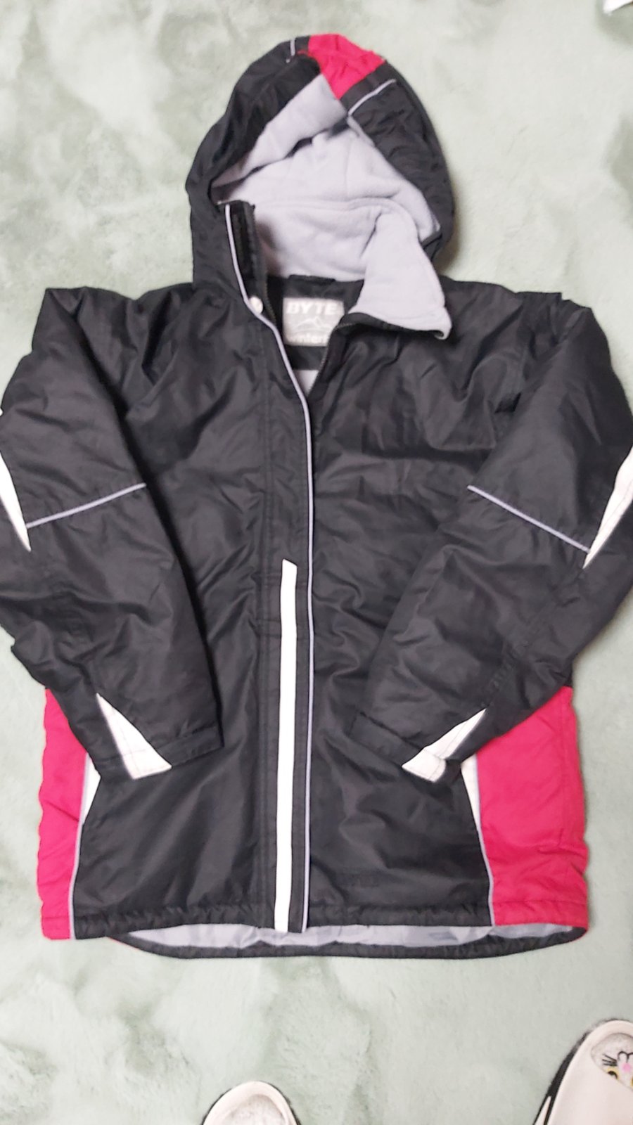 Super tepla bunda. Dobry noseny stav. Nenasla som chybu. Dvojite zapinanie (zips a nity), dvojite patenty na krku aj rukavoch... Kapucnu nemam... Dlzka 65cm, obcod 2×55cm, rukav od krku 70cm...