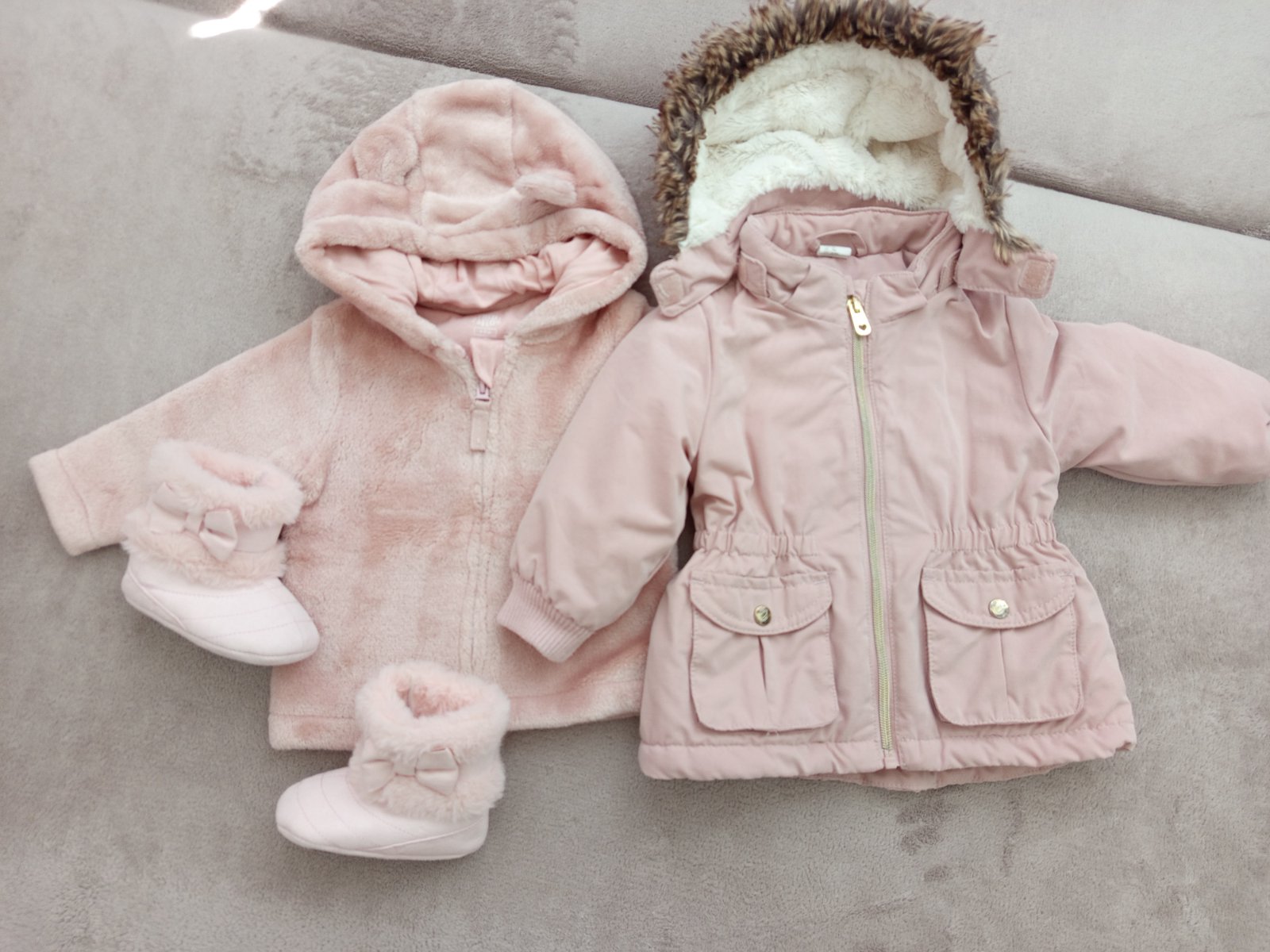 Bez poškodenia, akurát bežec na zipse trochu suchnuty z prania. Kapuca sa da odopnut. K bunde darujem mikinku f&f a čižmičky, všetko bez poškodenia