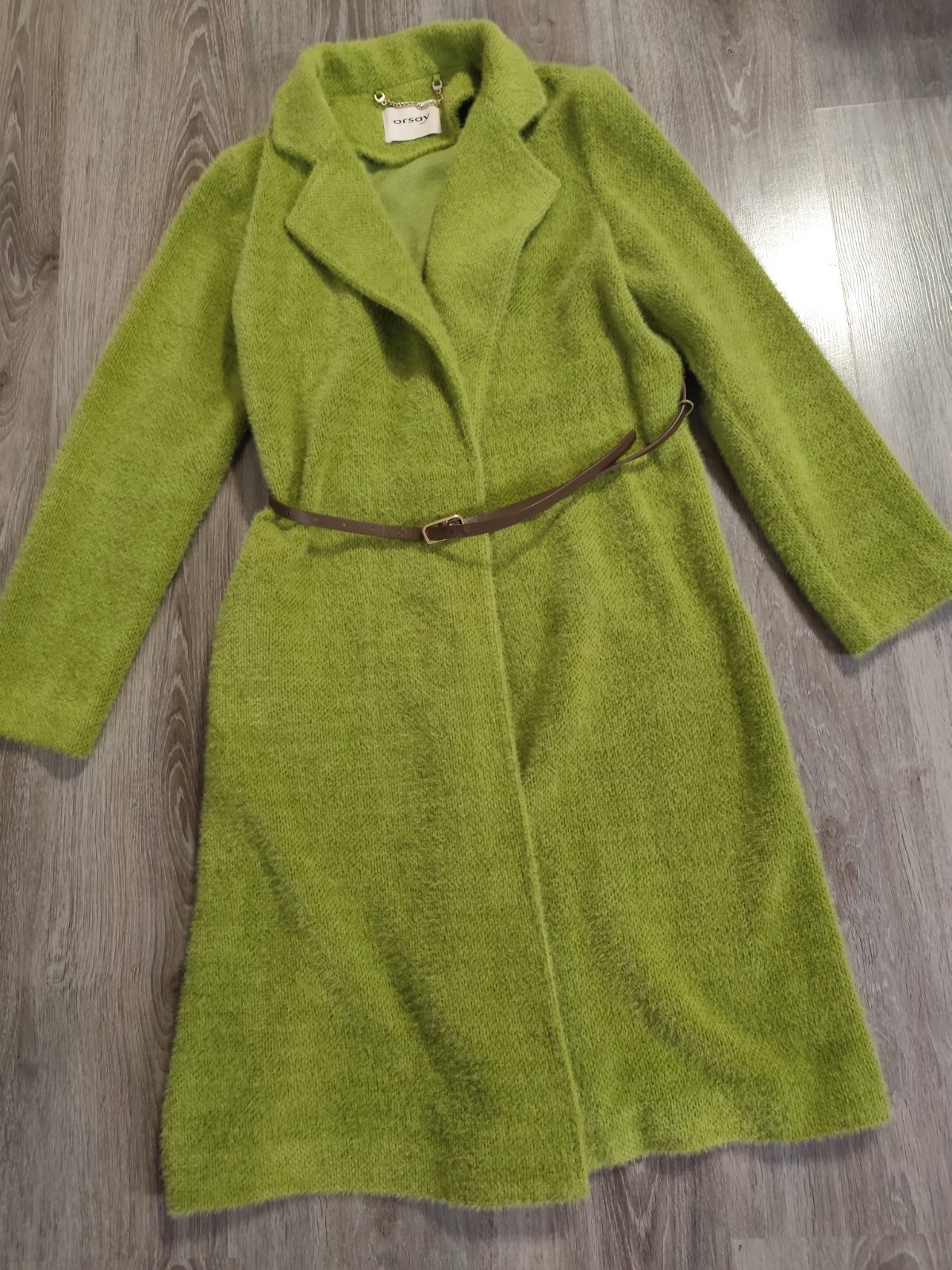 Super stav. Bez poškodenie. Chýba opasok, čo si myslím nie je problém. Dlžka 63,. šírka cez prsia 2x50, rukáv spod pazuchy 48, od ramena 63 šírka ramien 40. Farba ako na foto. Nie výmena- predáva...