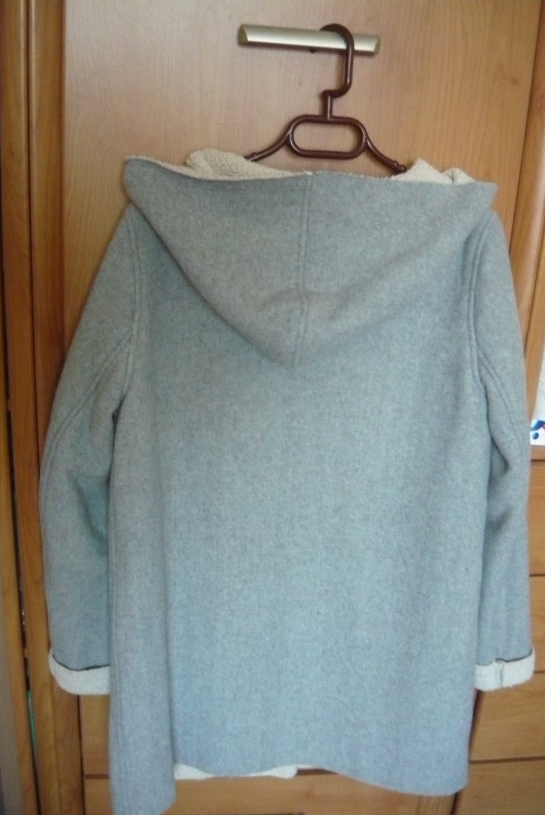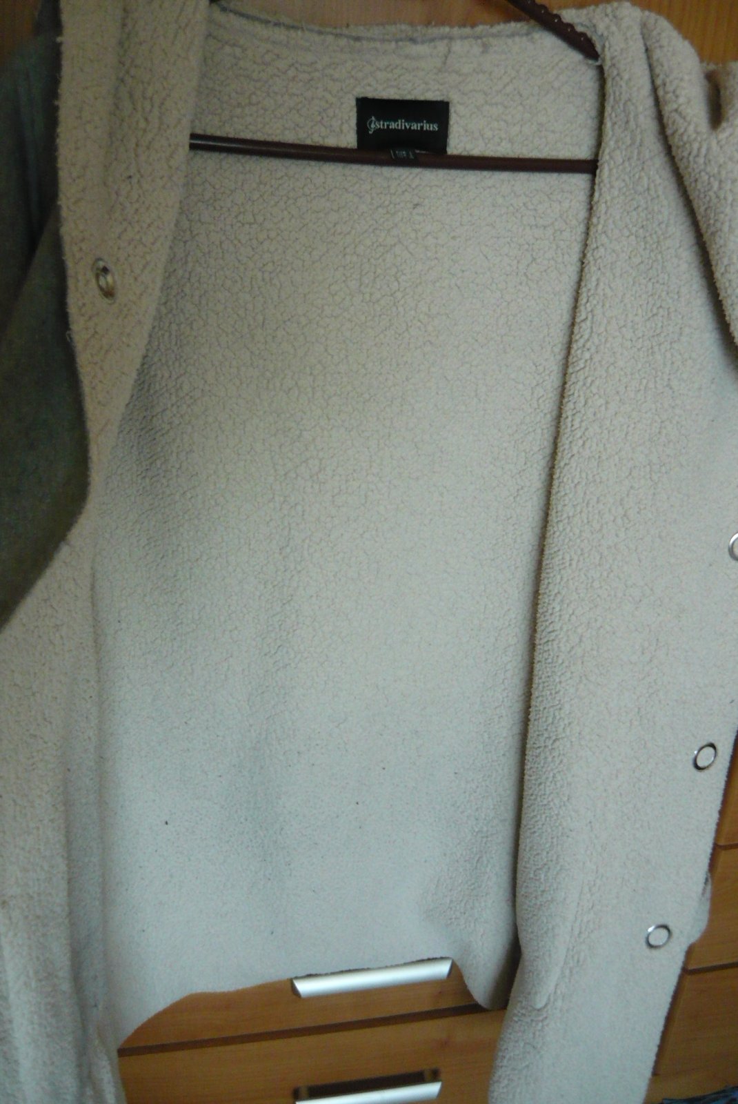 dámsky kabátik s kapucou napevno,farba sivá, vnútro biele. Číslo L. Zapínanie na 4 kovové cvoky. zn. Stradivarius. Mäkký materiál, kabátik nie je ťažký. Cena 12 eur.
